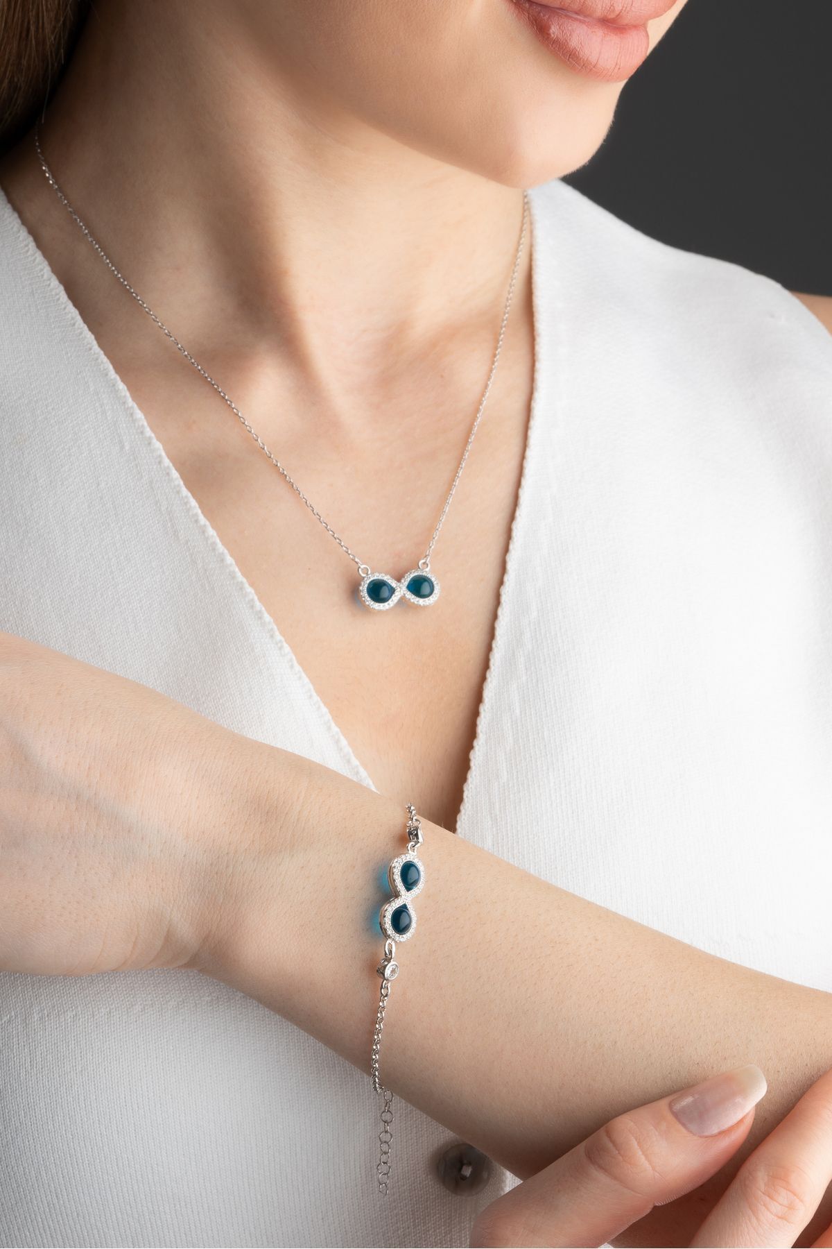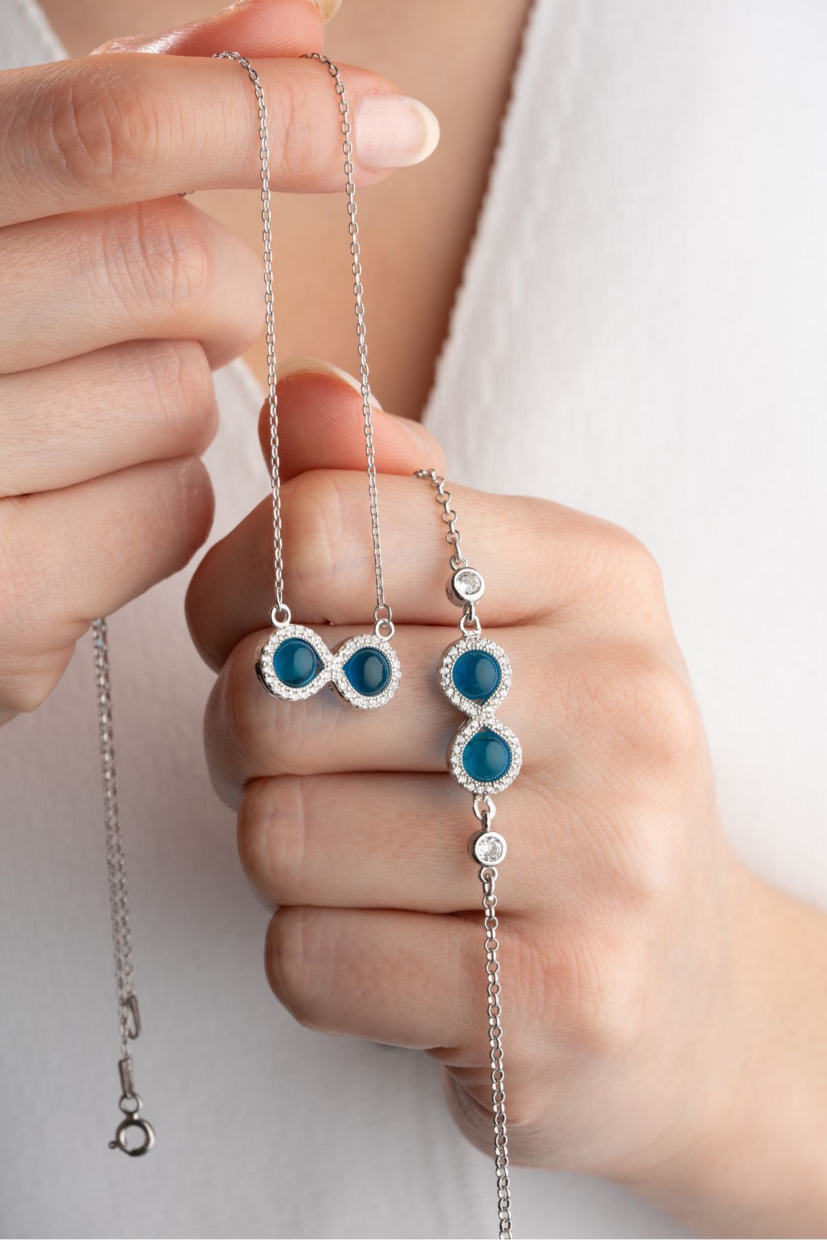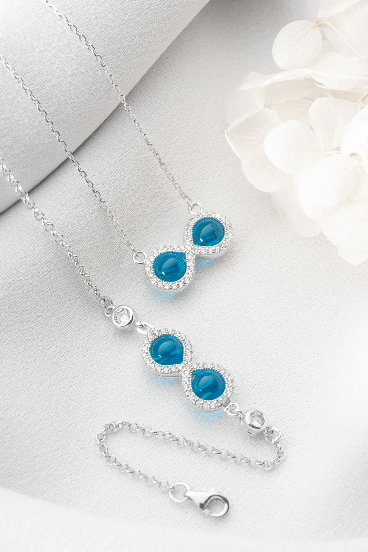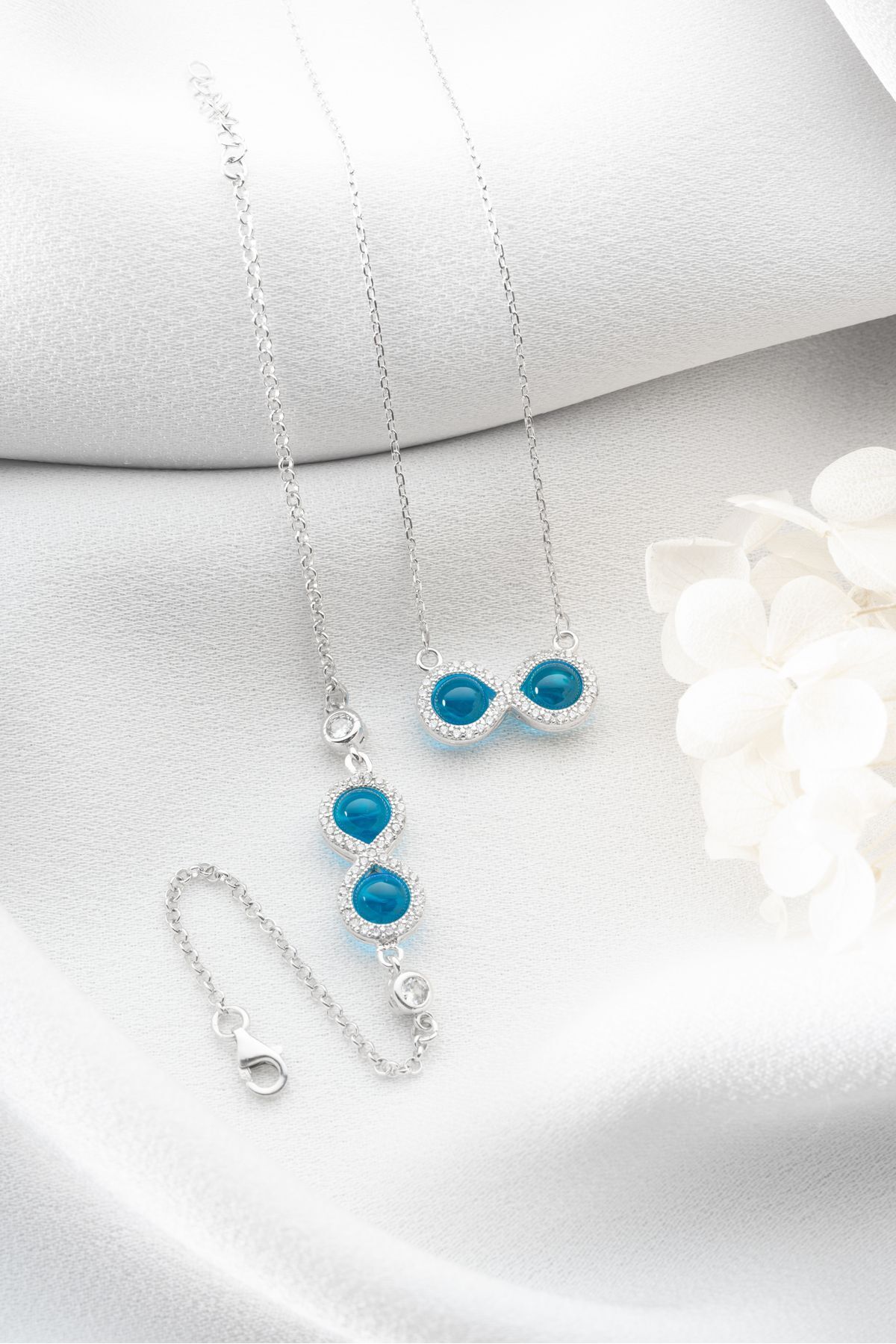 925 Ayar Gümüş Mavi Taşlı Sonsuzluk Kolye Bileklik Set