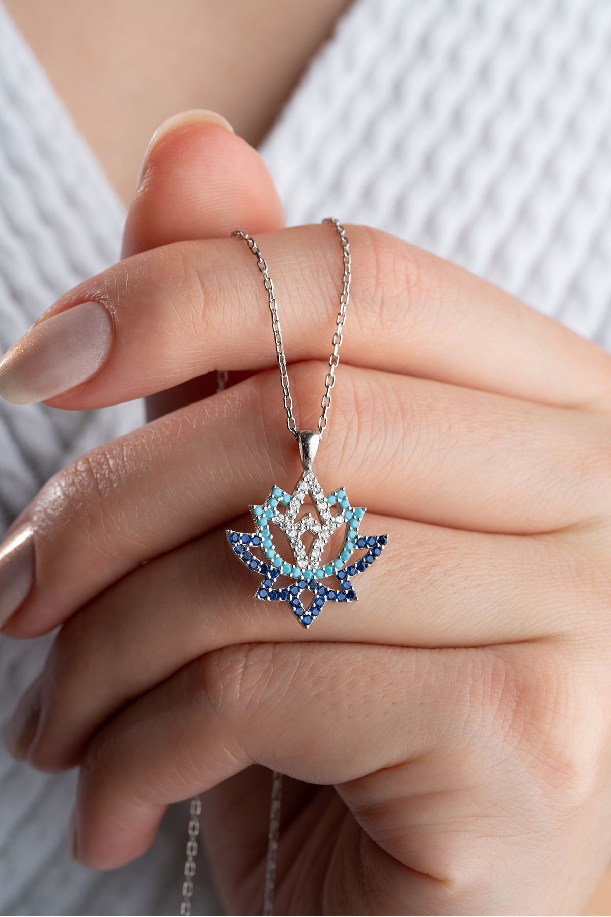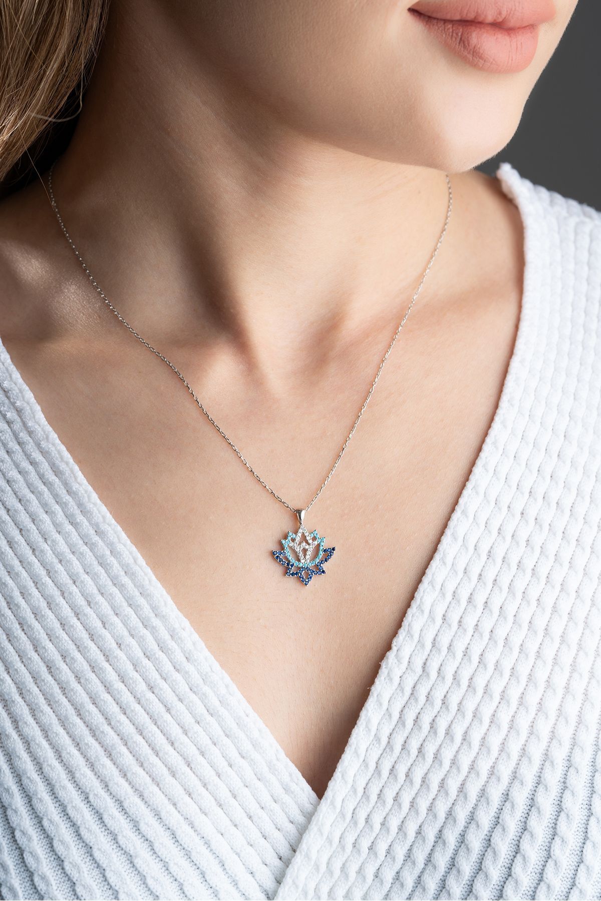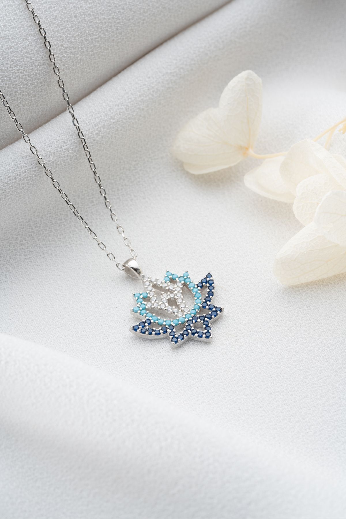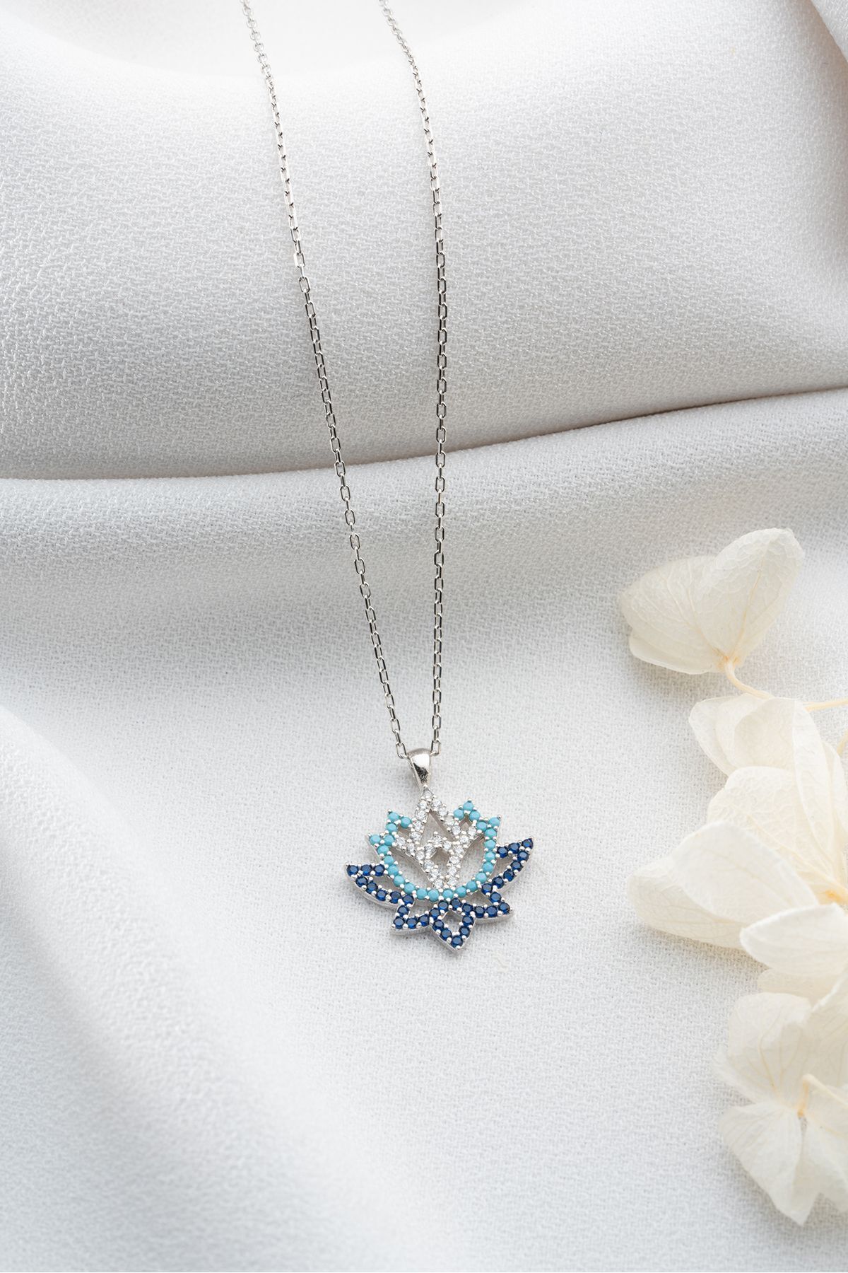 925 Ayar Gümüş Mavi Zirkon Taşlı Lotus Çiçeği Kolye