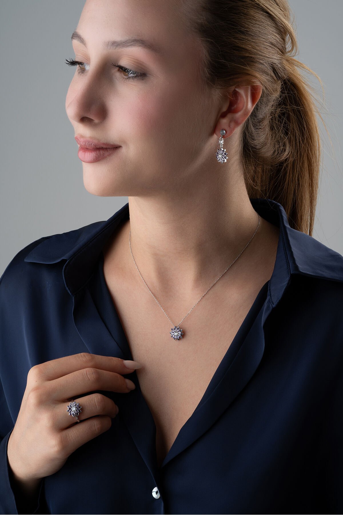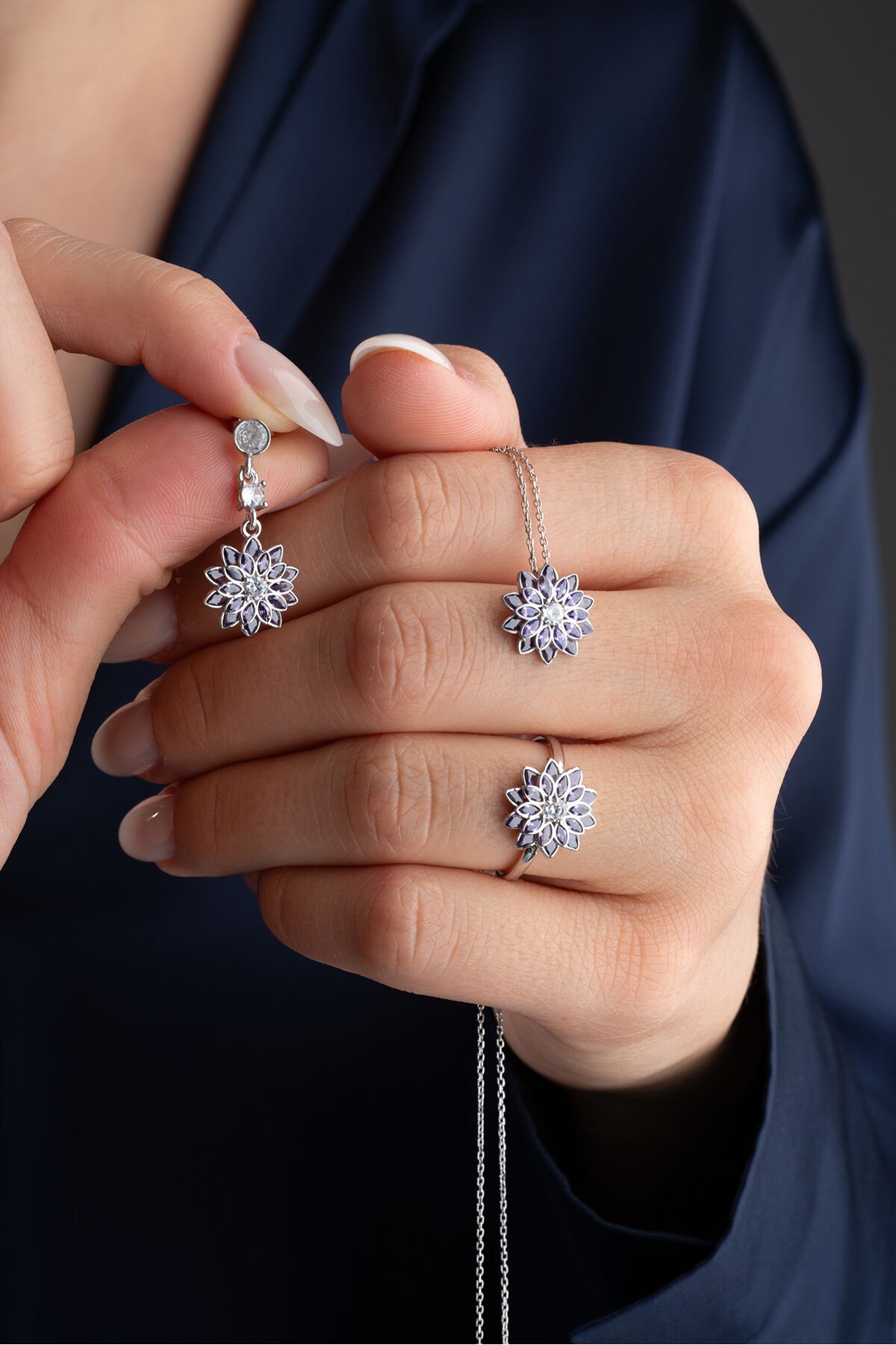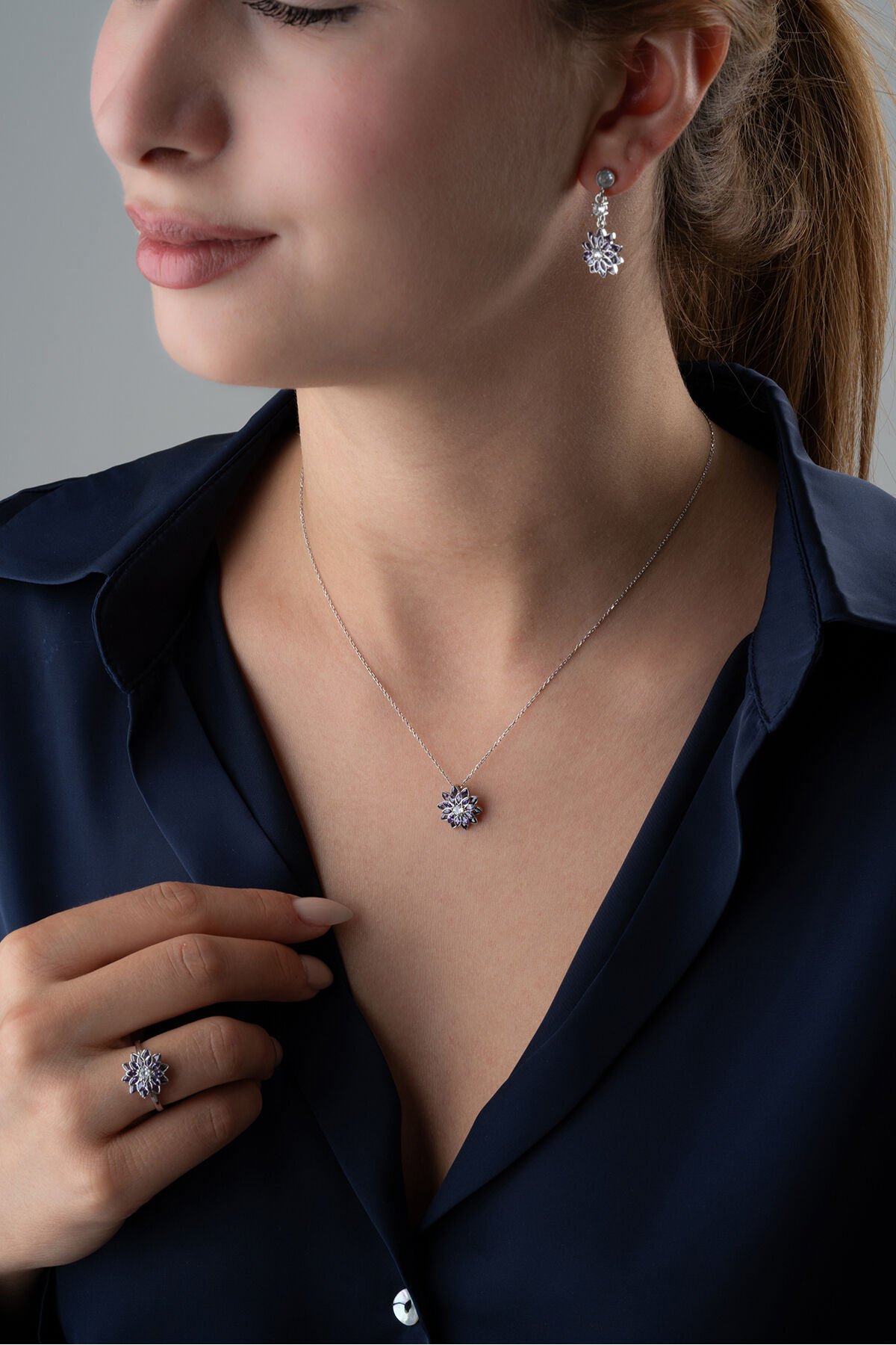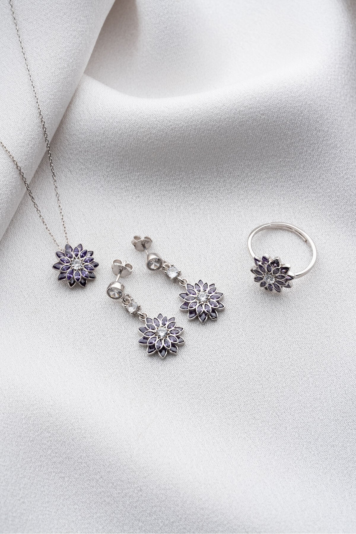 925 Ayar Gümüş Mor Tek Taşlı Lotus Takı (Kolye-Küpe-Yüzük) Seti