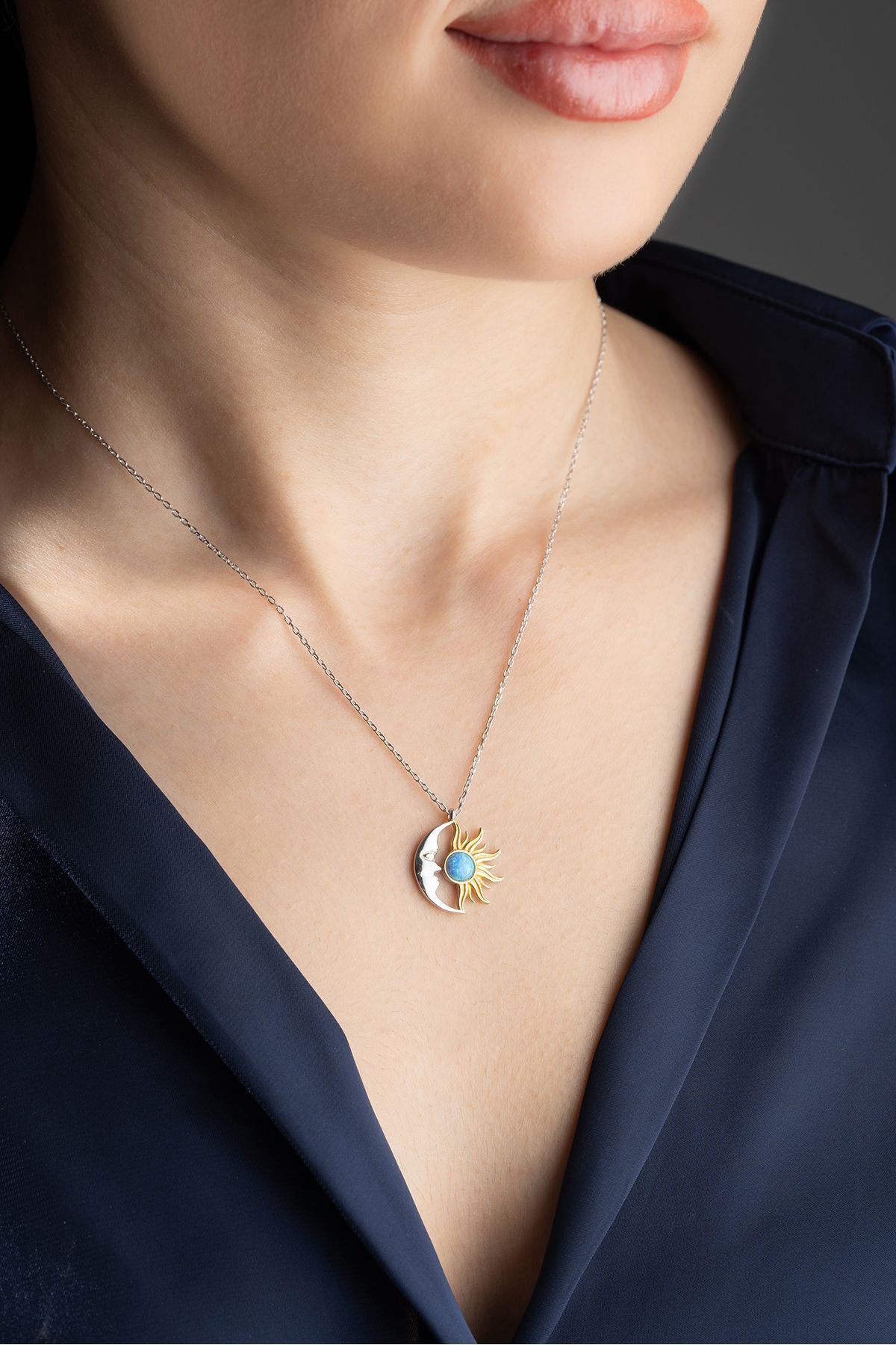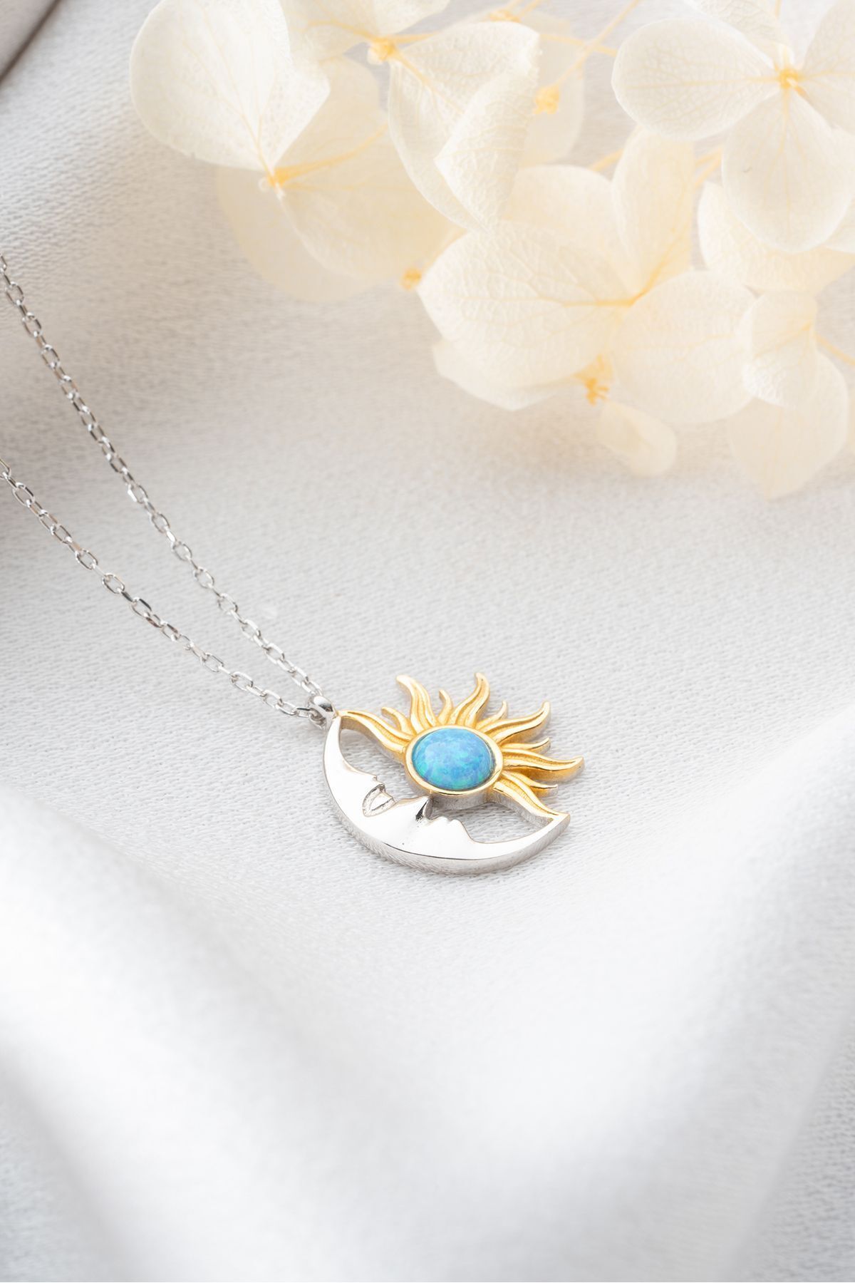 925 Ayar Gümüş Opal Taşlı Ay ve Güneş Kolye