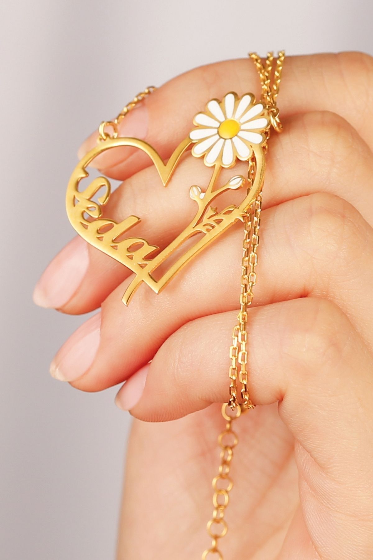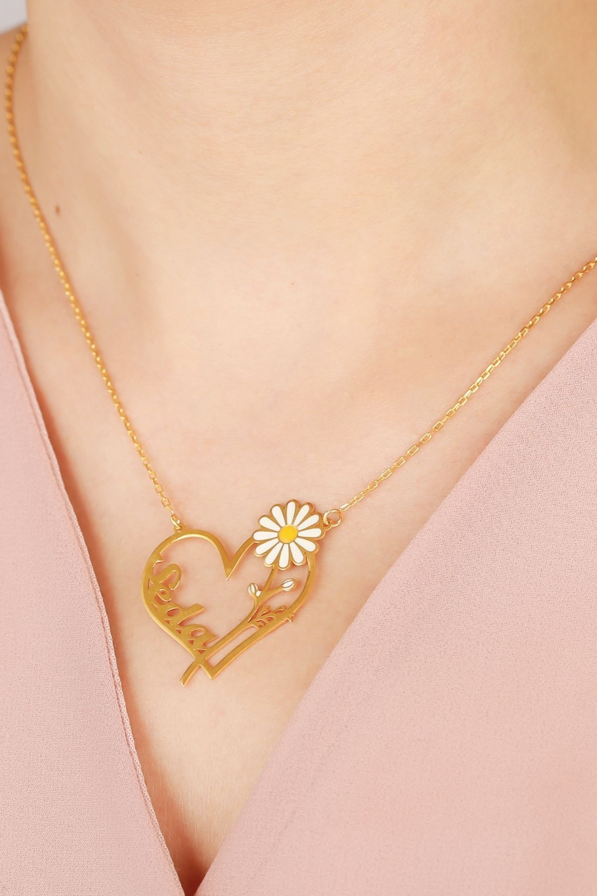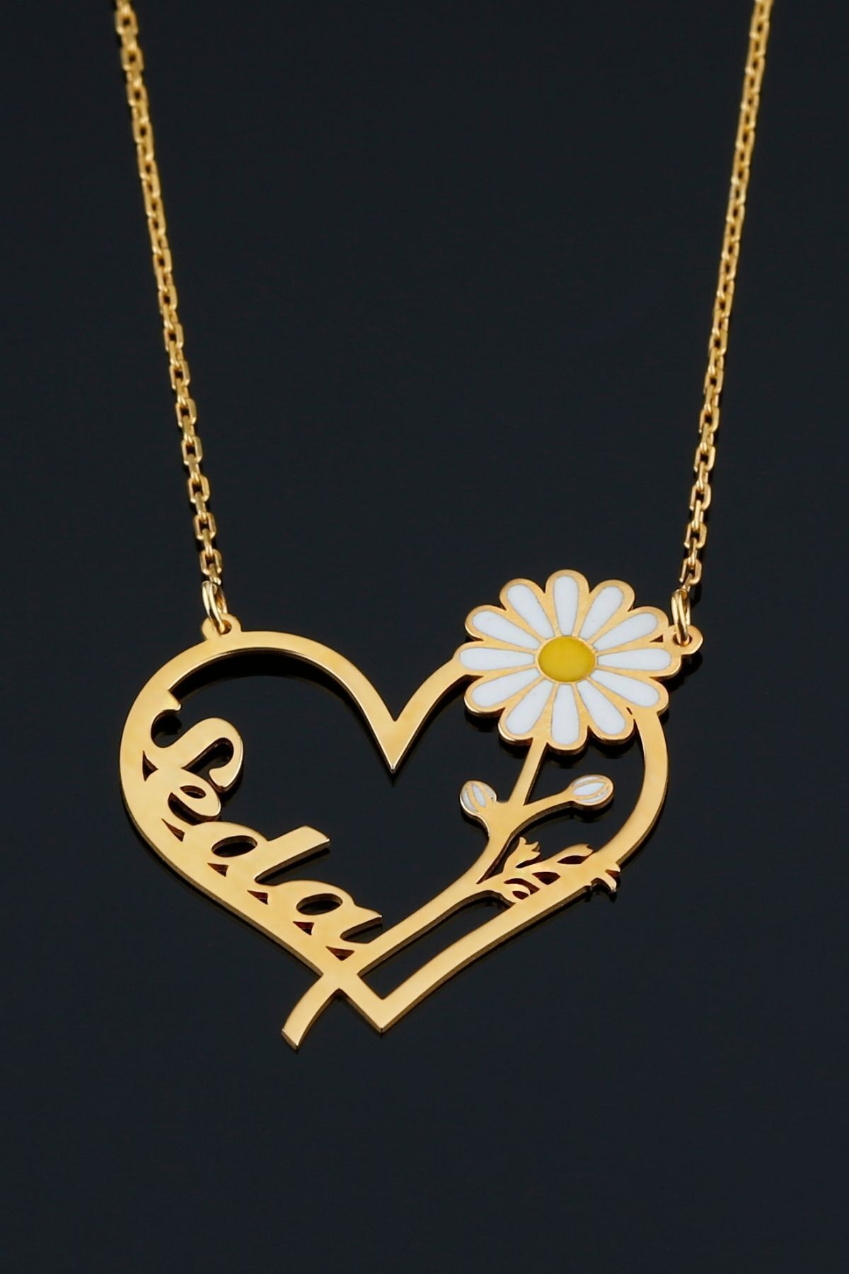 925 Ayar Gümüş Papatyalı Isimli Kalp Kolye
