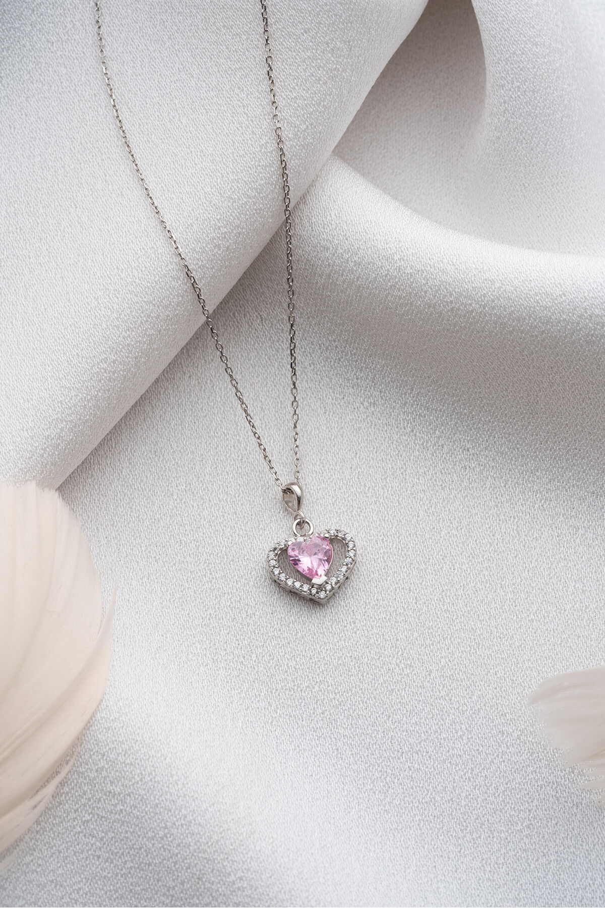 925 Ayar Gümüş Pembe Taşlı Kalp Kolye
