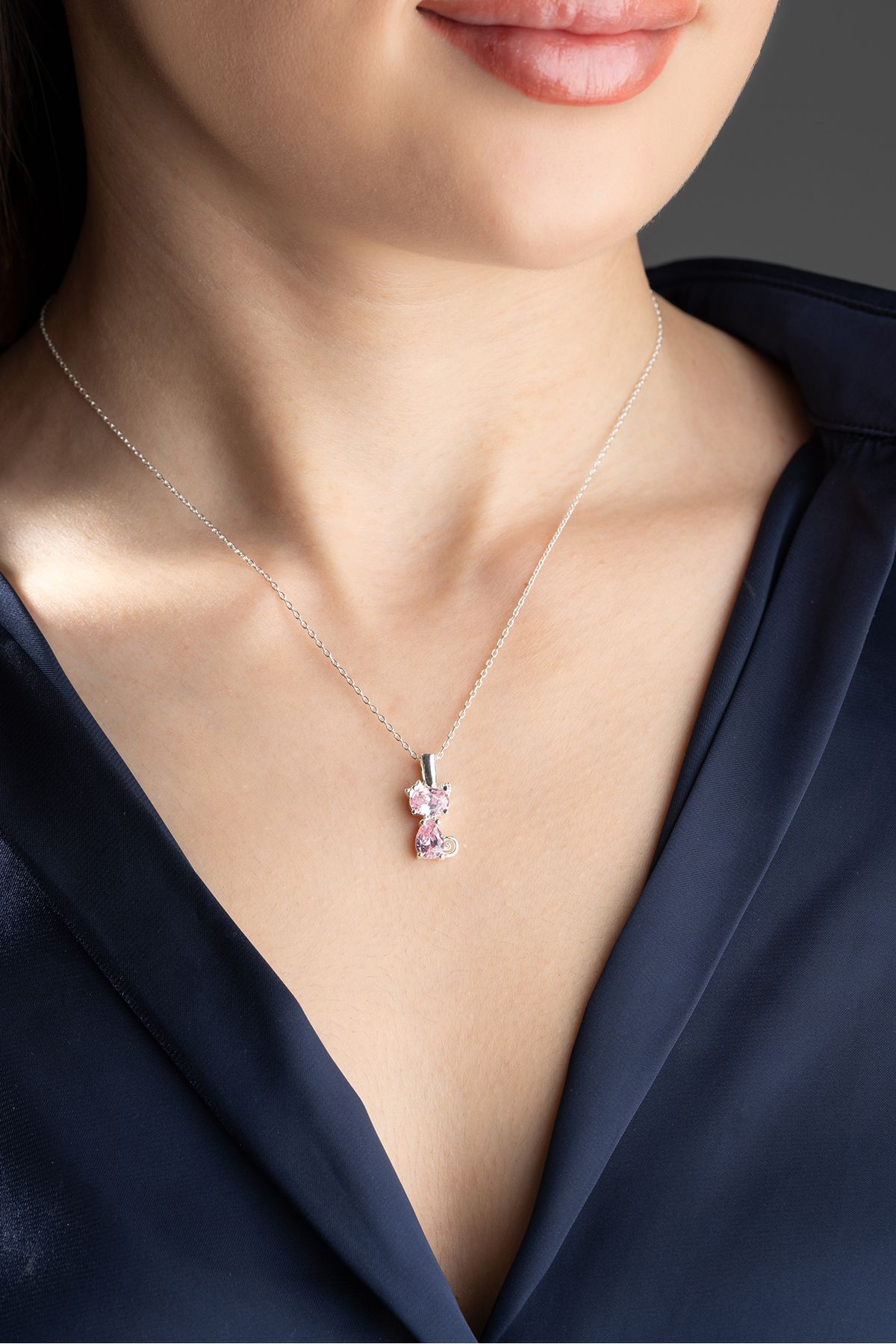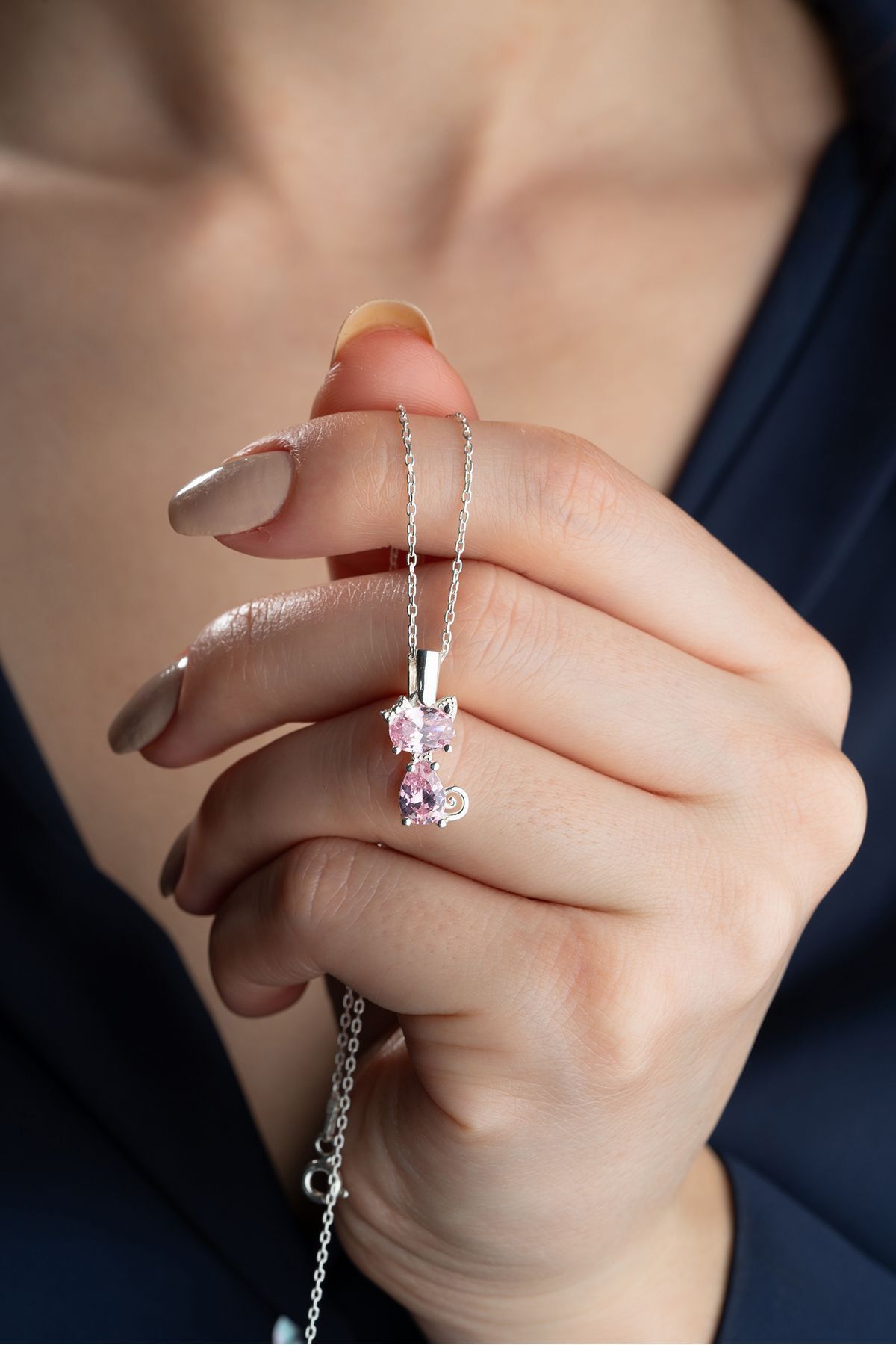 925 Ayar Gümüş Pembe Taşlı Kedi Kolye