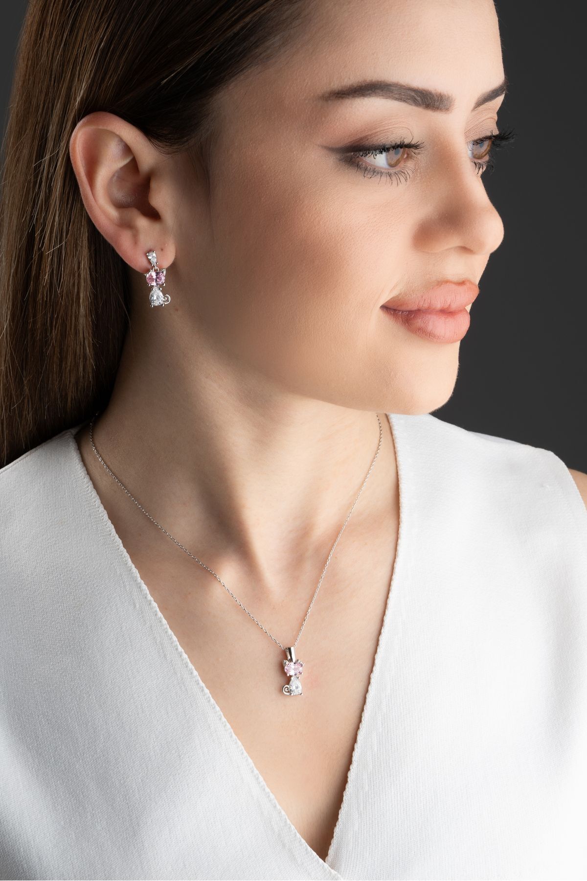 925 Ayar Gümüş Pembe Taşlı Kedi Kolye Küpe Seti