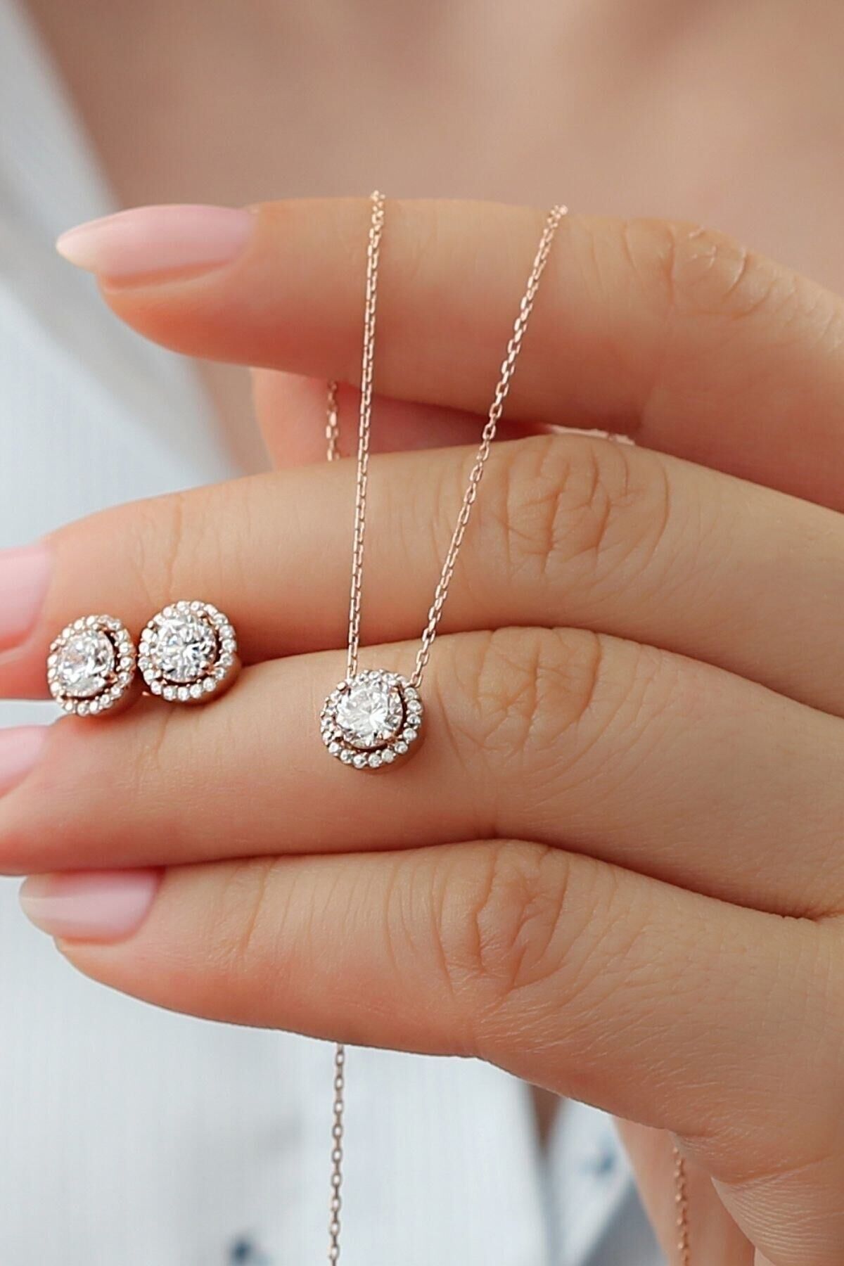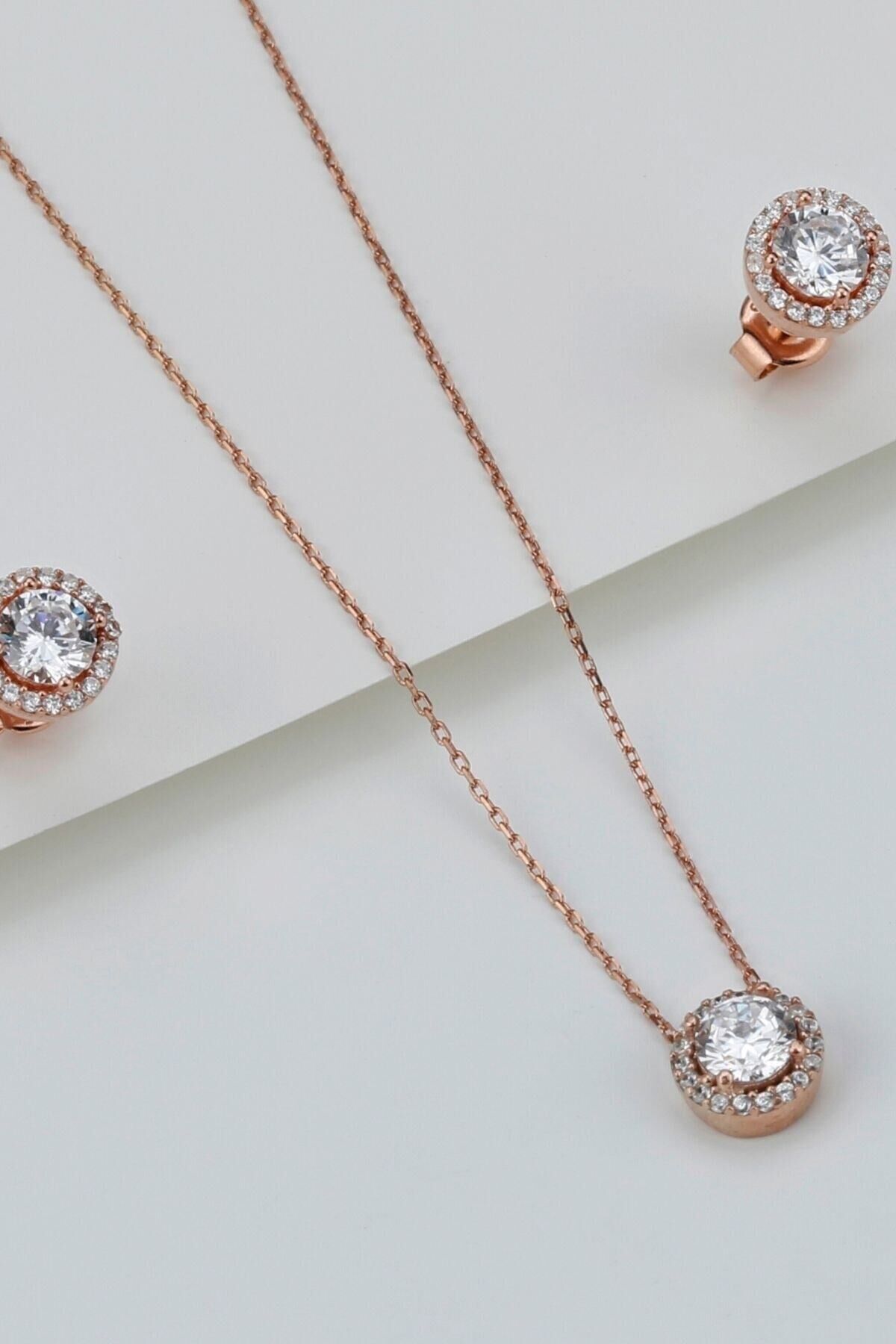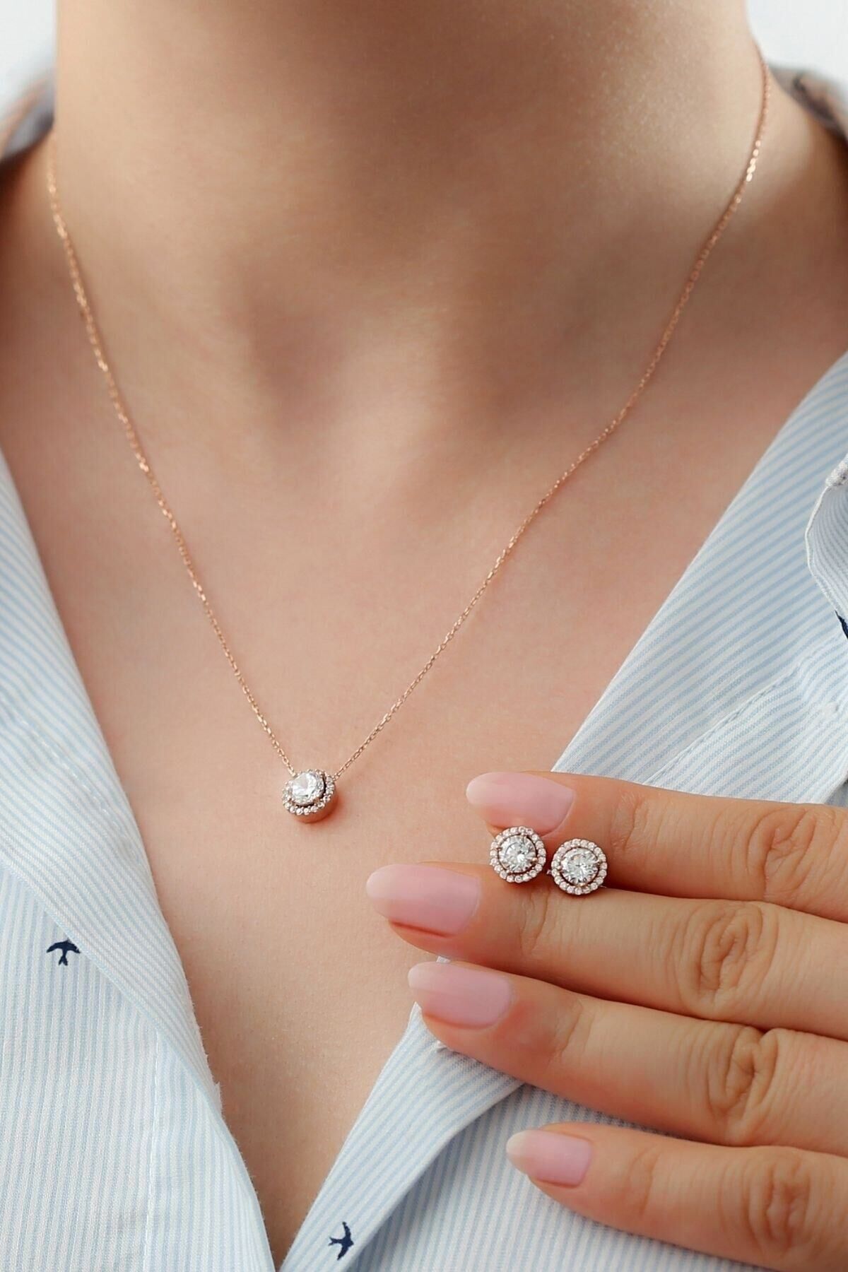 925 Ayar Gümüş Pırlanta Model Kolye Küpe Seti ( Rose Gold )