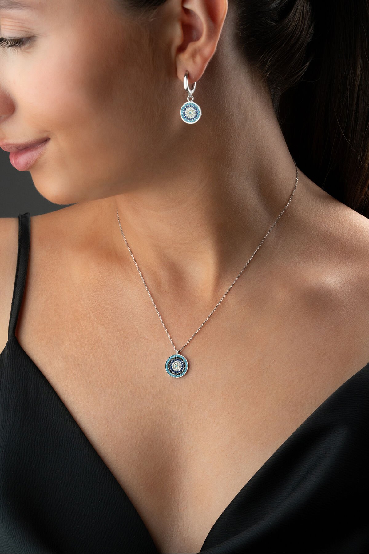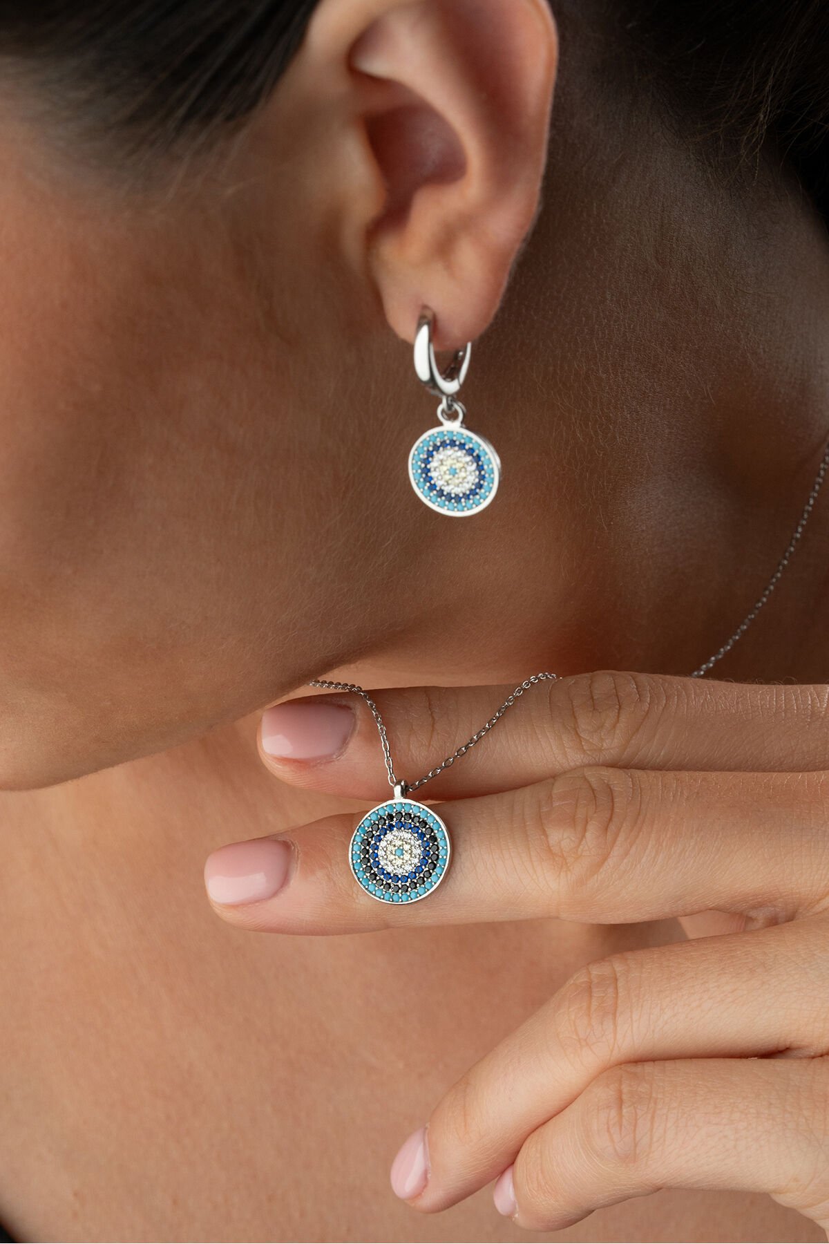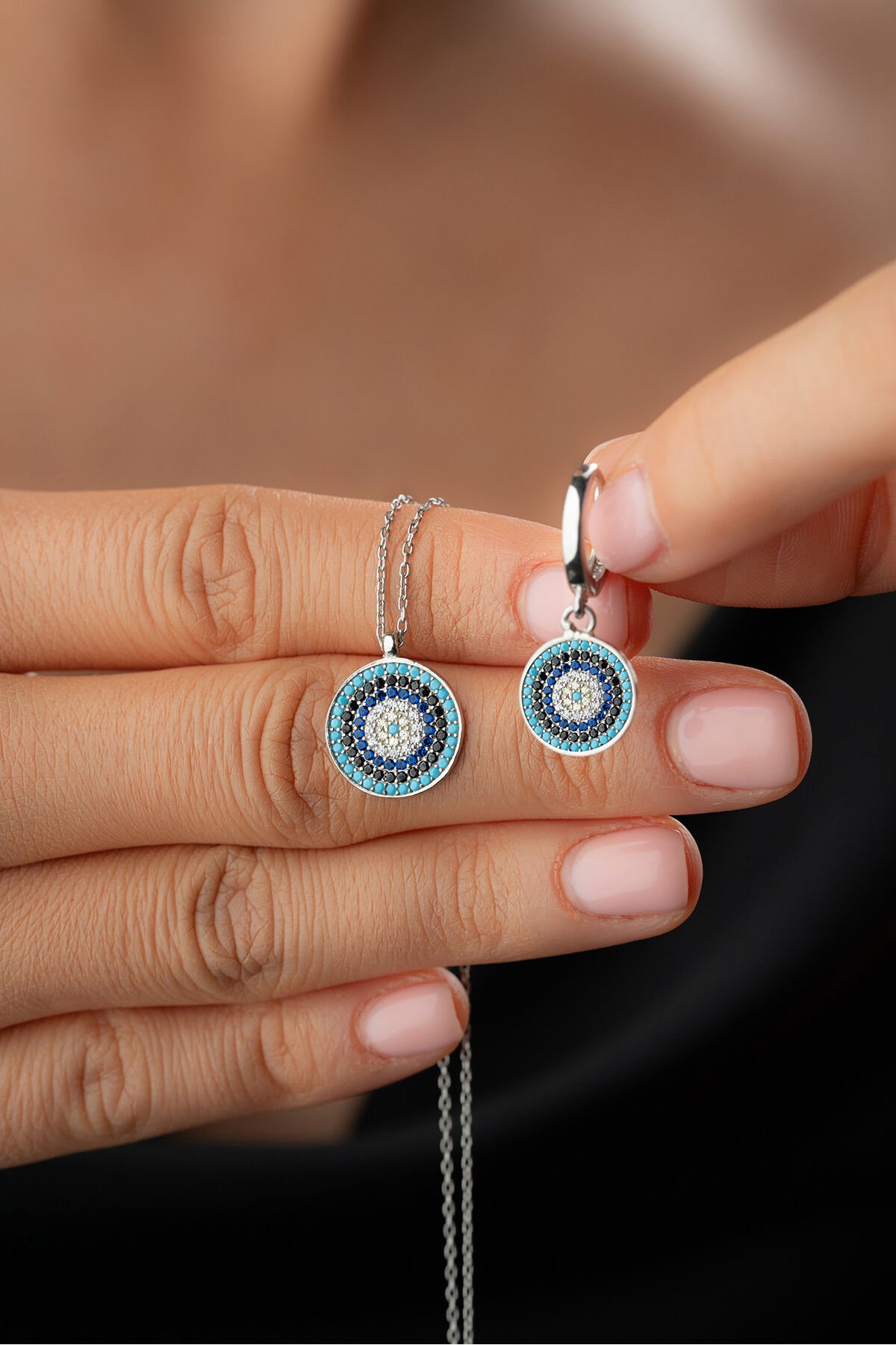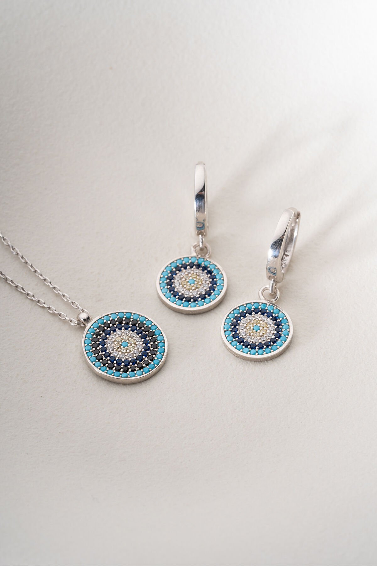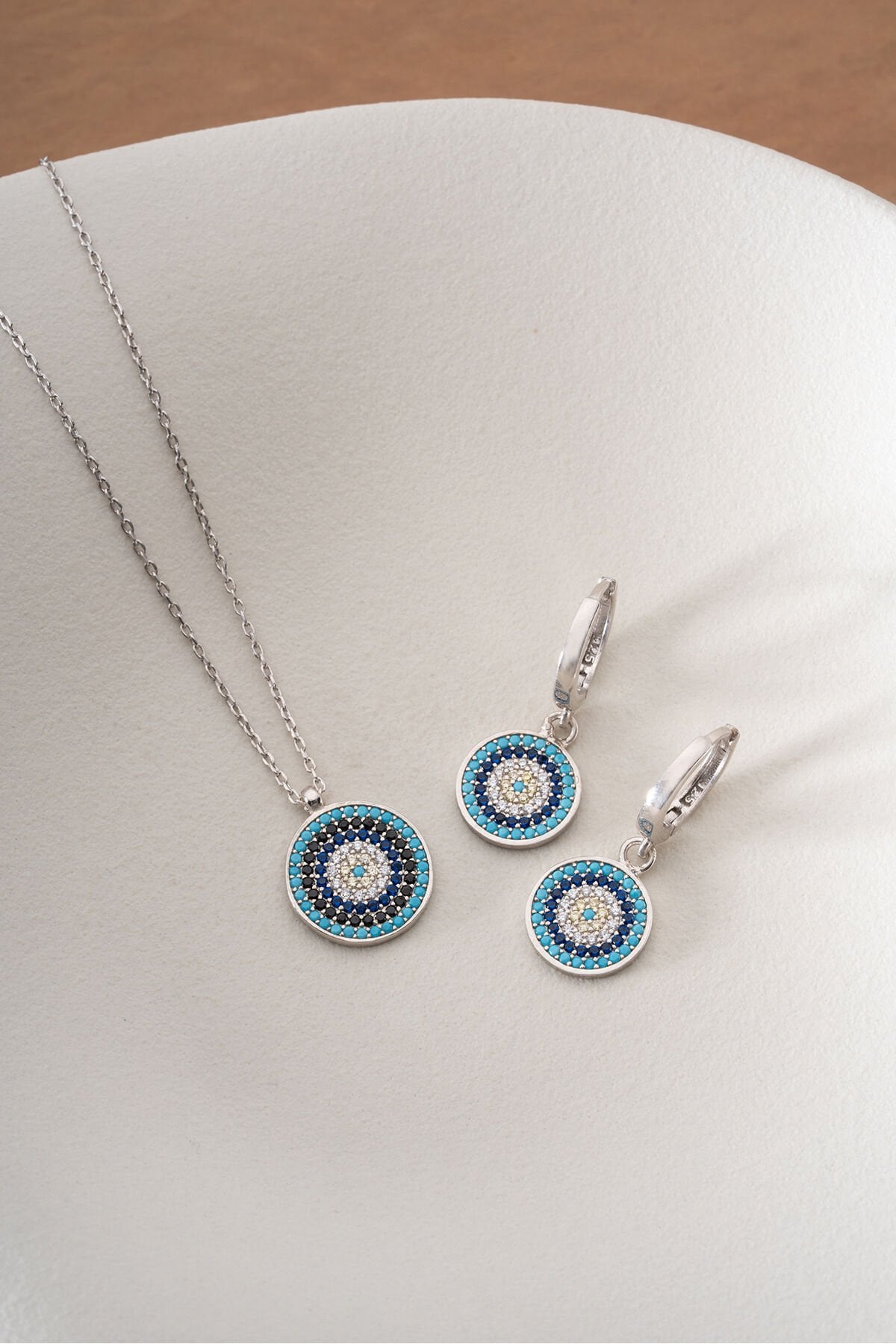925 Ayar Gümüş Rodyum Kaplama Nazarlı Küpe Kolye Set