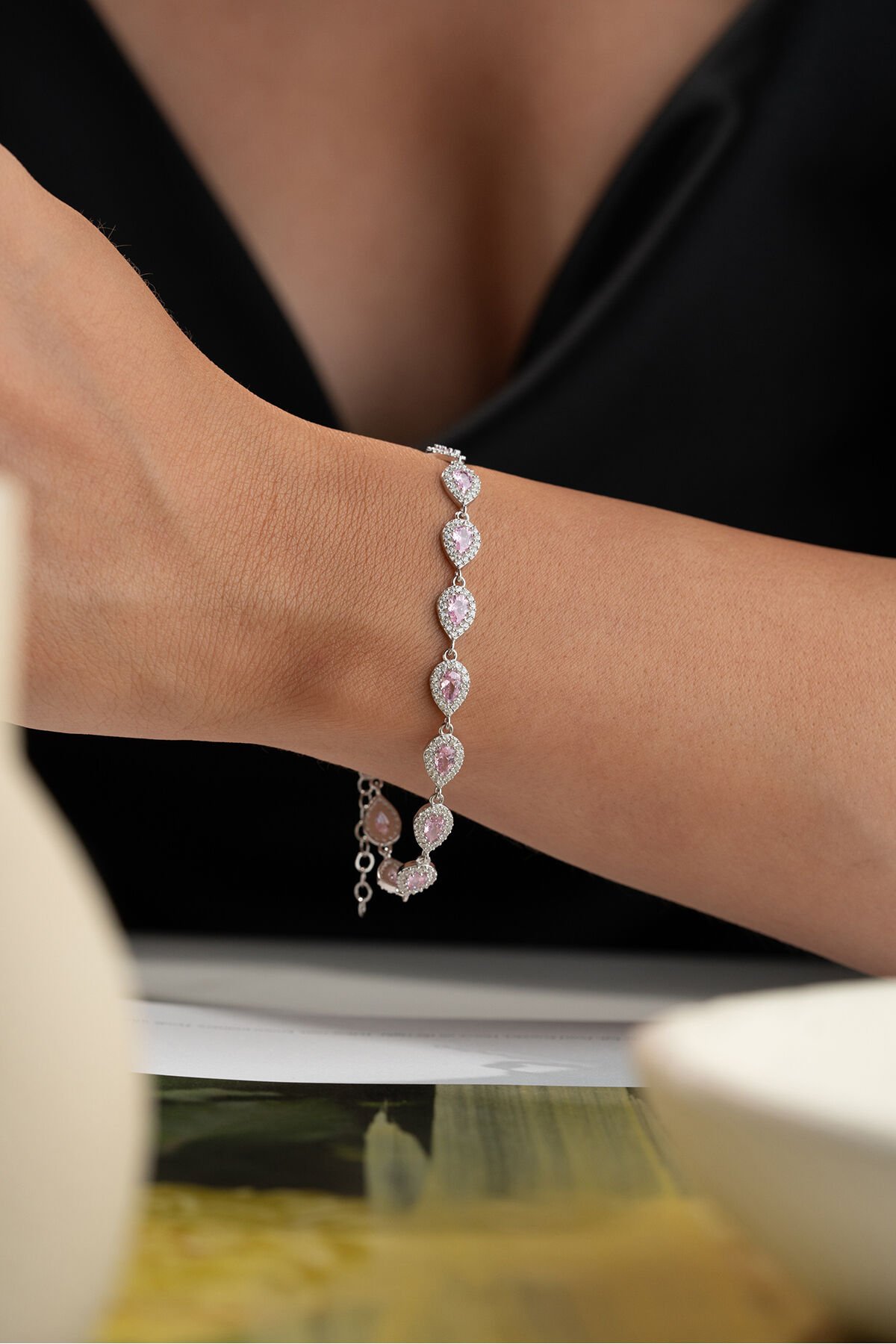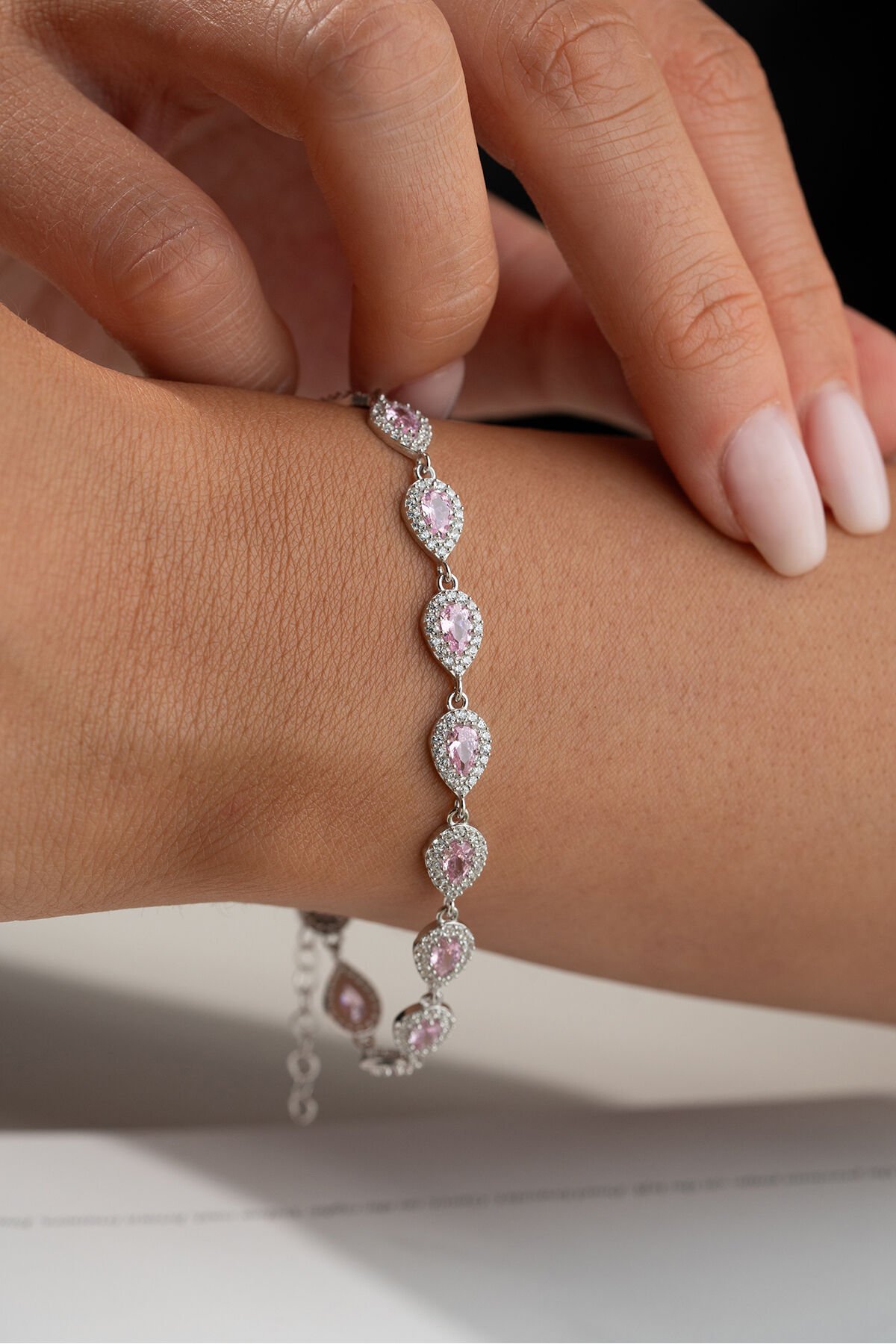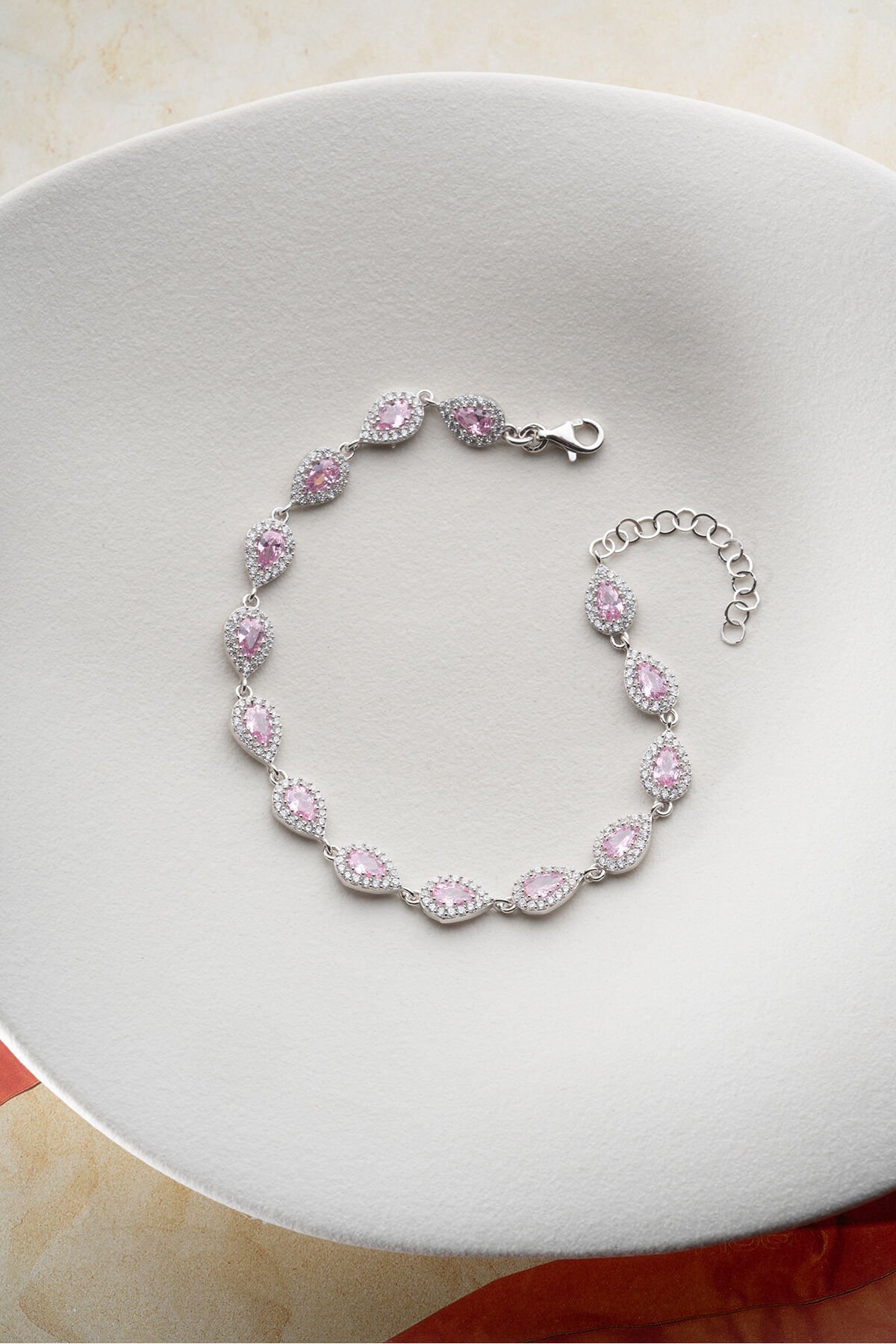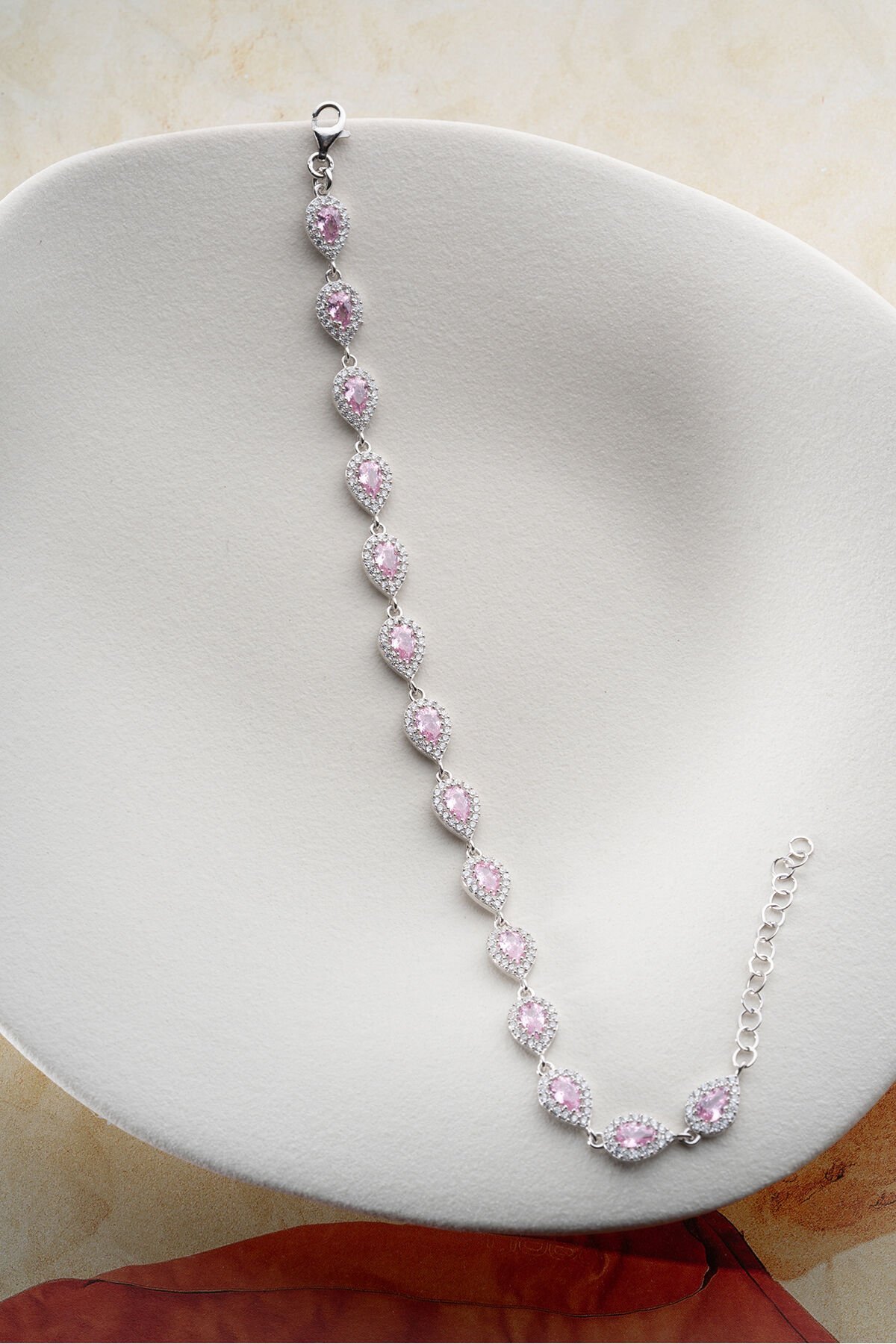 925 Ayar Gümüş Rodyum Kaplama Pembe Taşlı Suyolu Bileklik