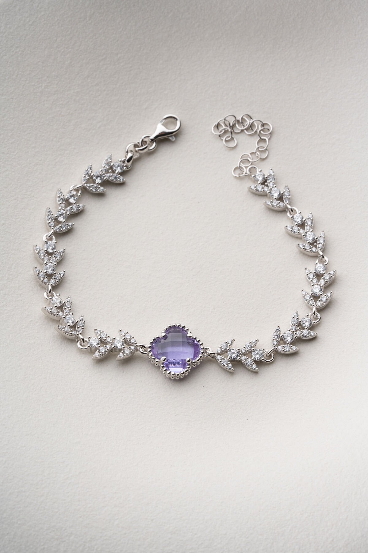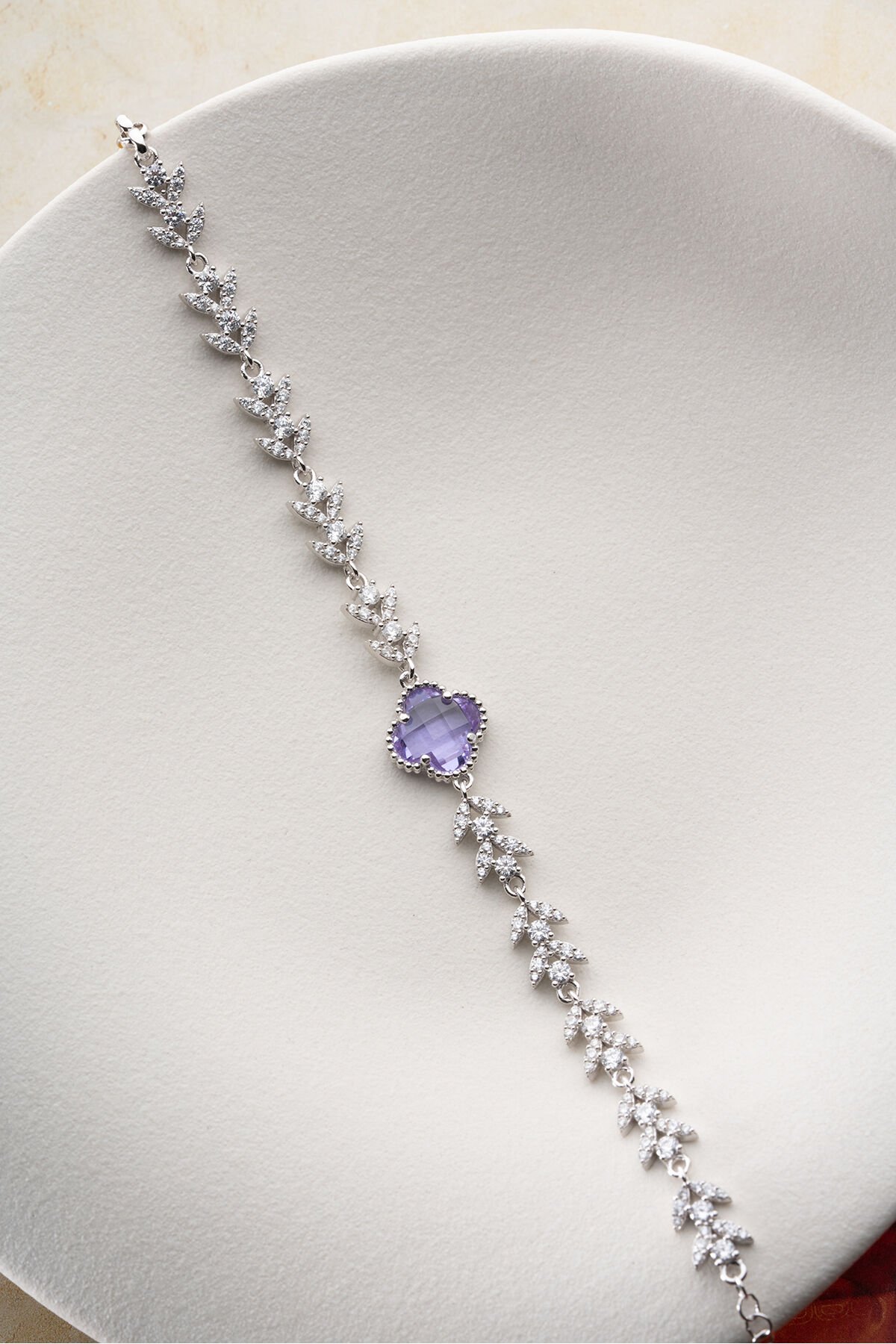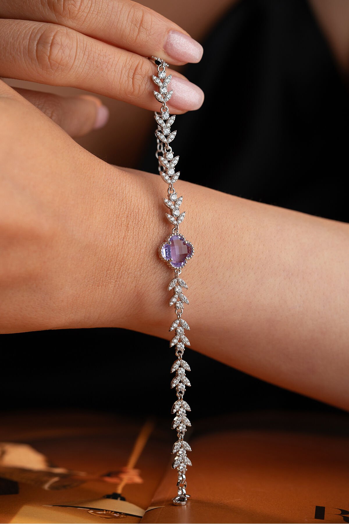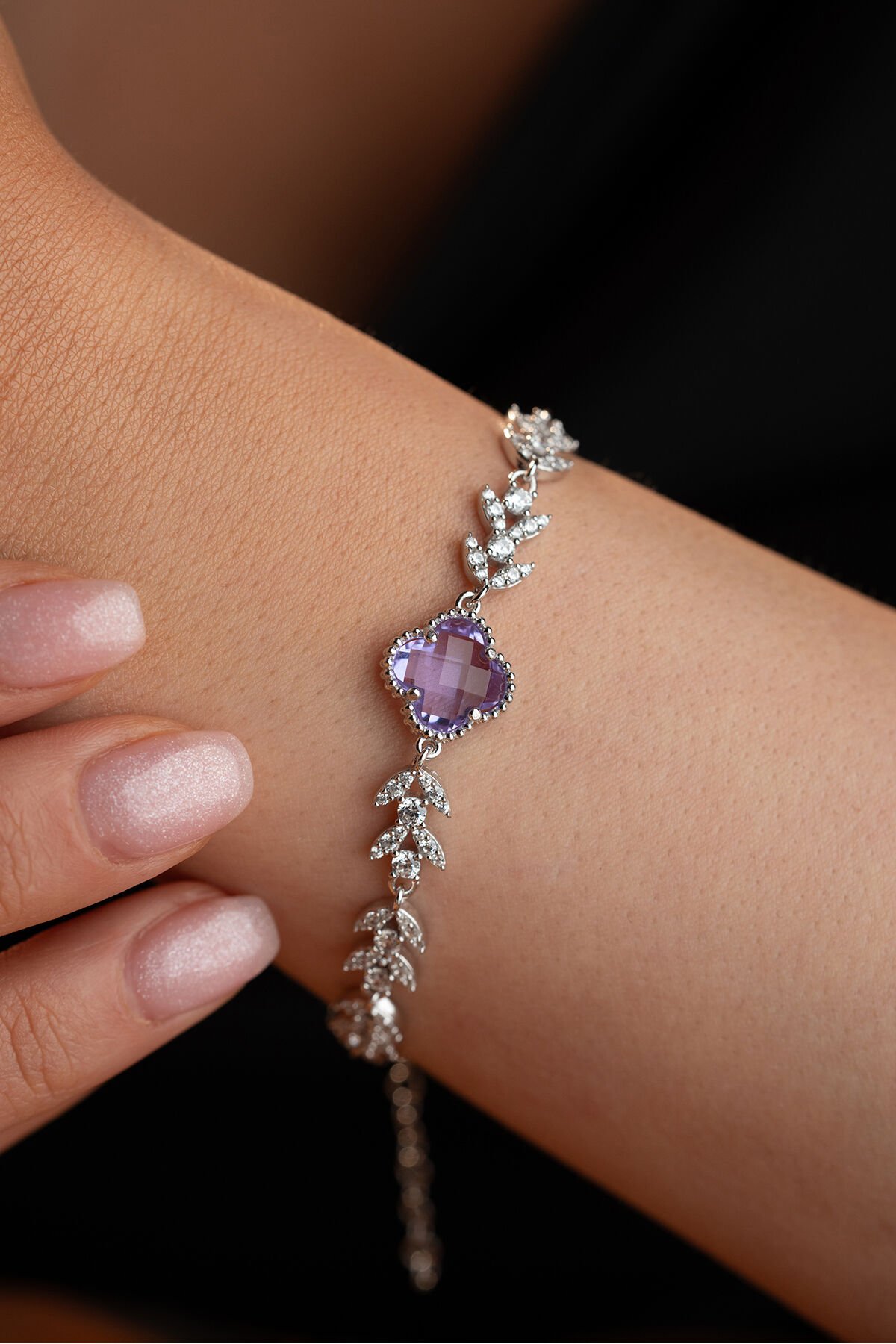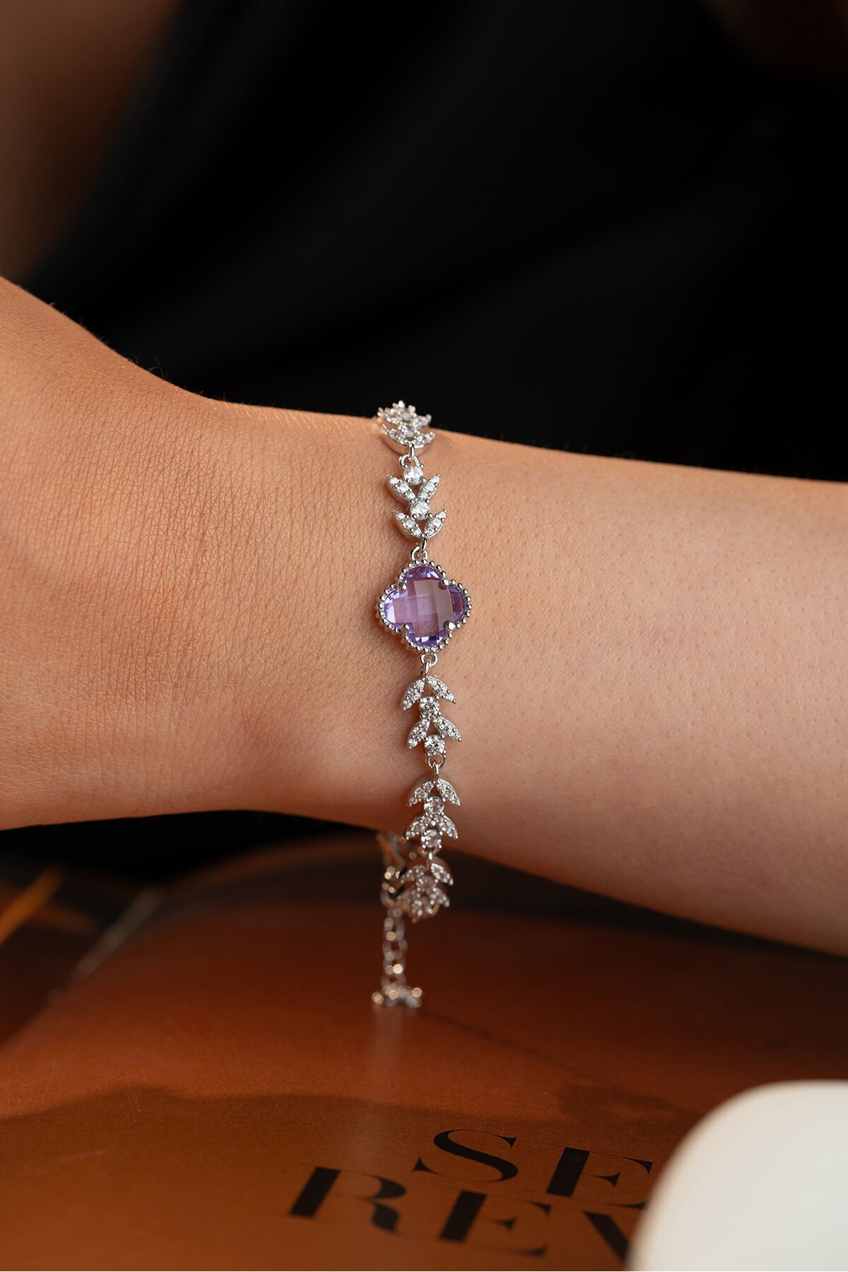 925 Ayar Gümüş Rodyum Kaplama Yaprak Model Amatist Taşlı Bileklik