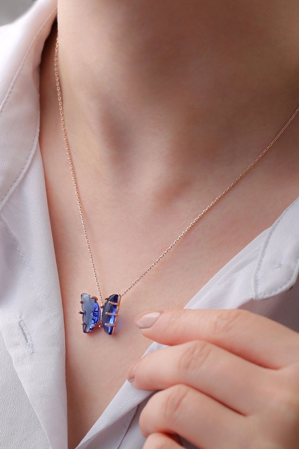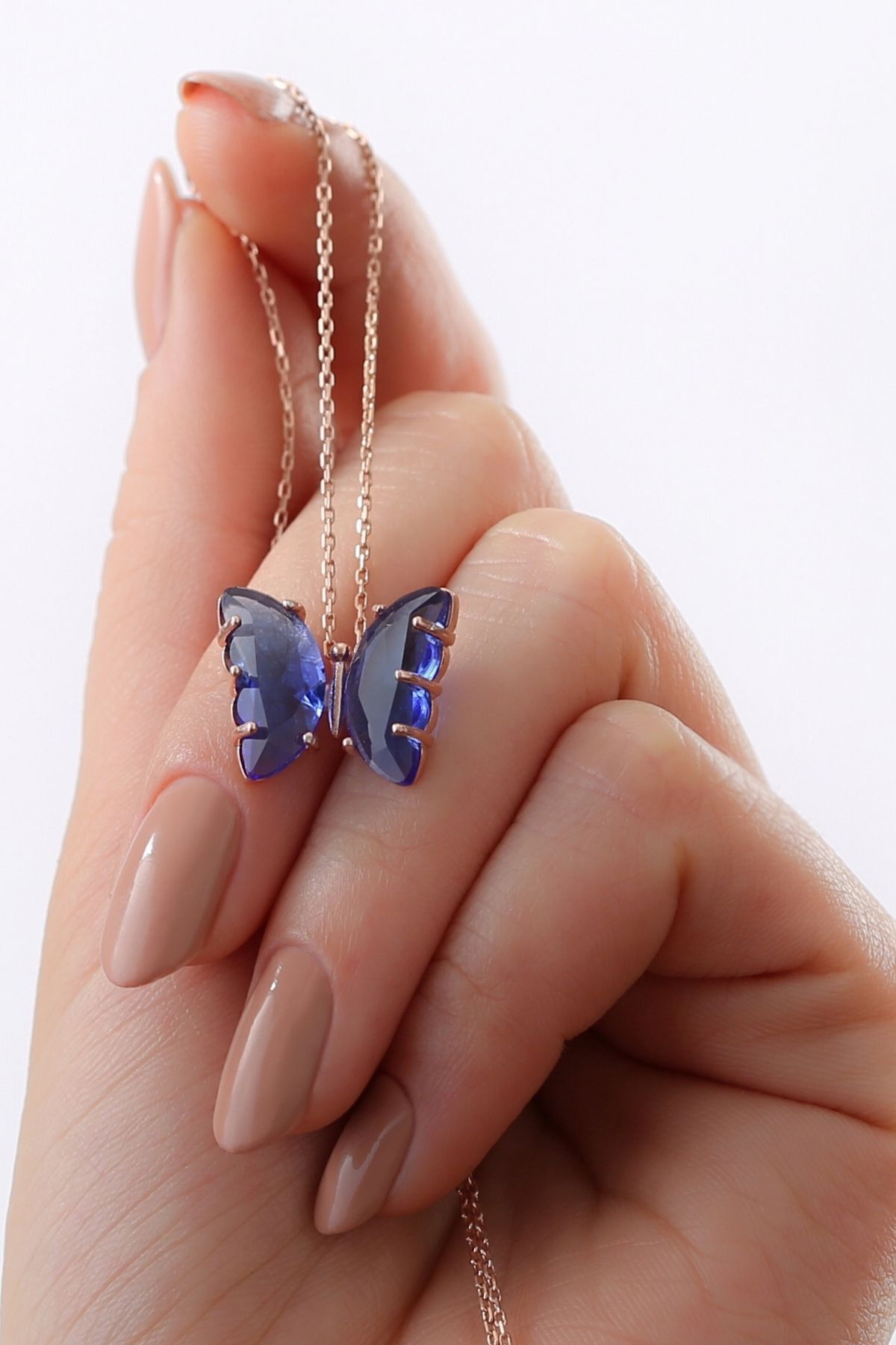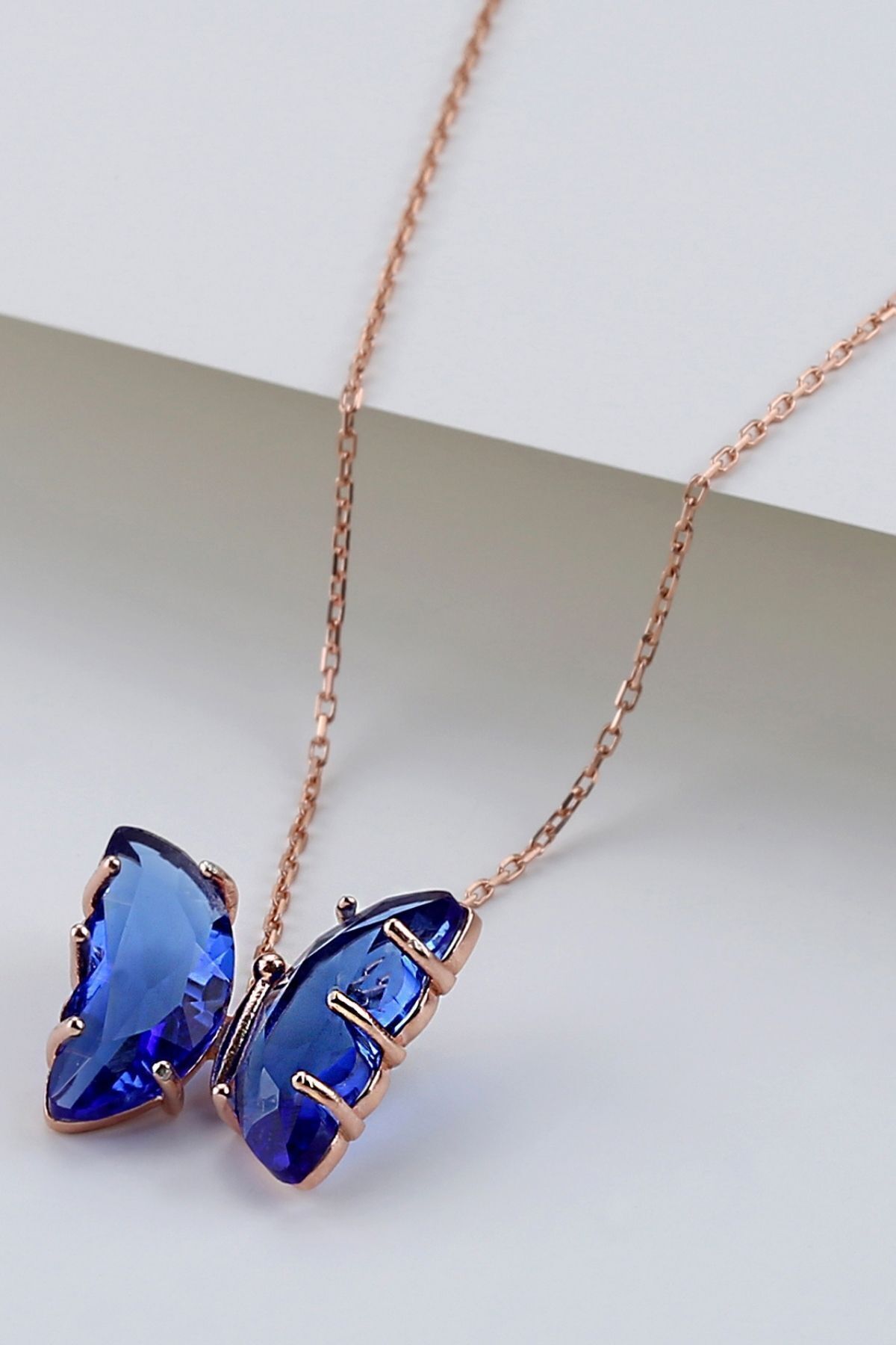 925 Ayar Gümüş Rose Lacivert Cam Kelebek Kolye
