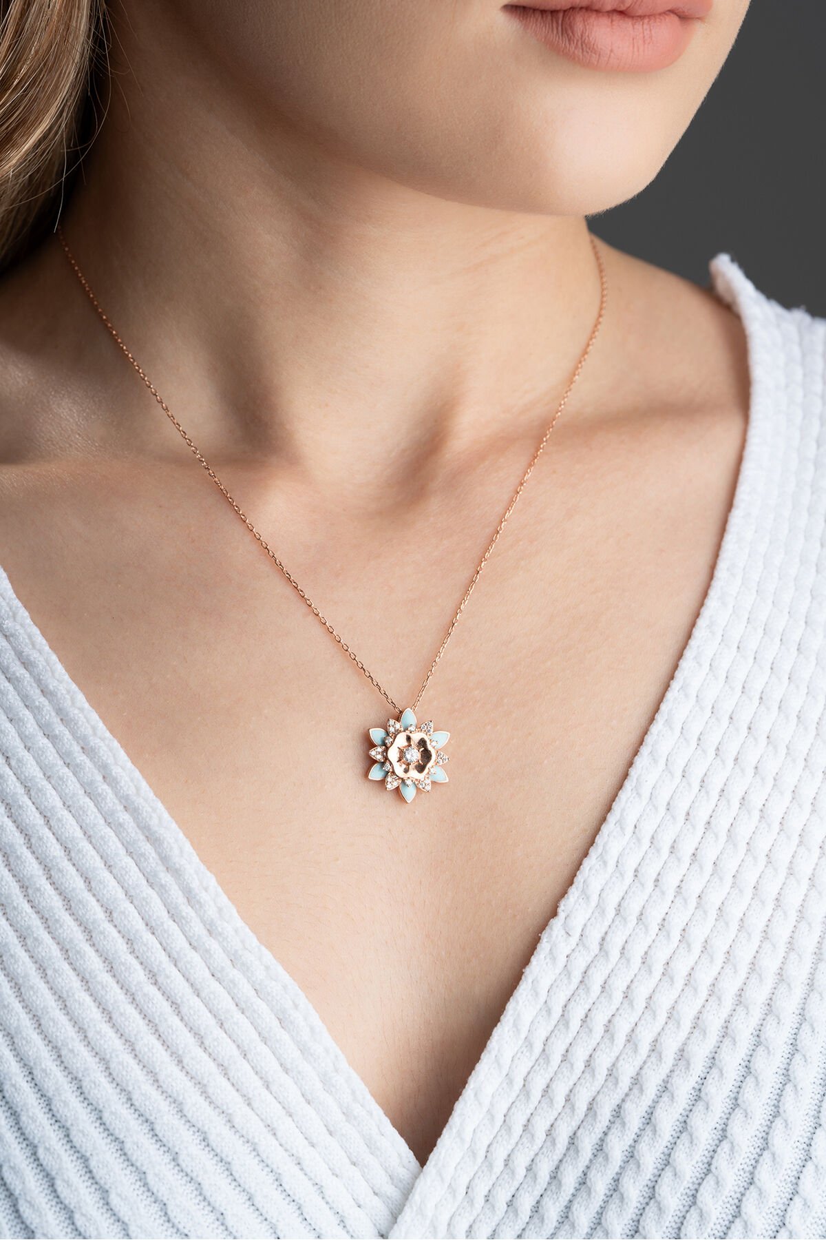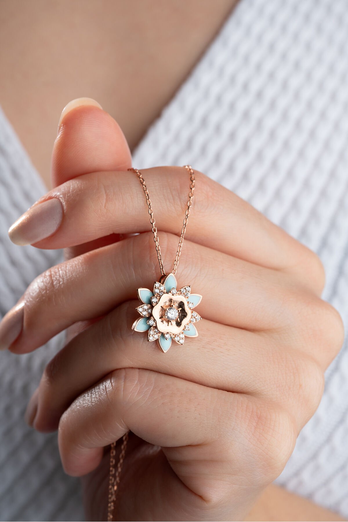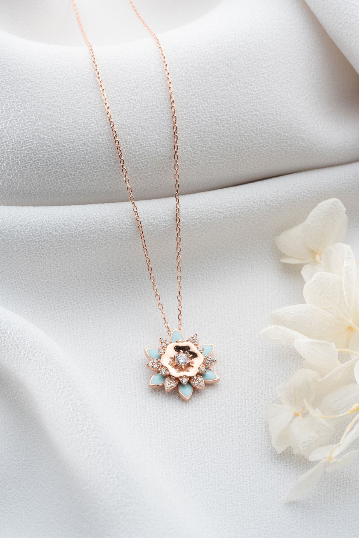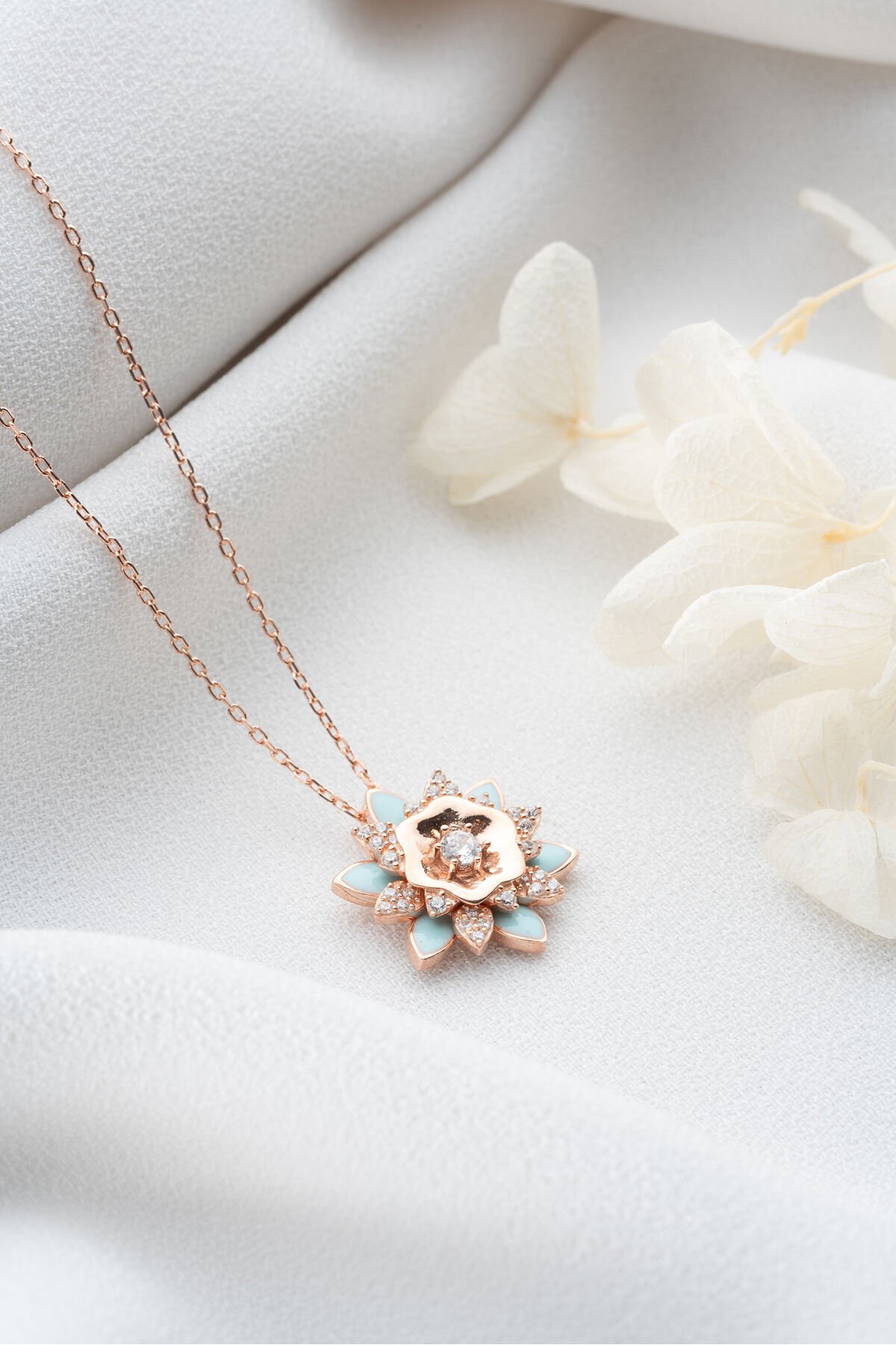 925 Ayar Gümüş Rose Mavi Mineli Lotus Kolye