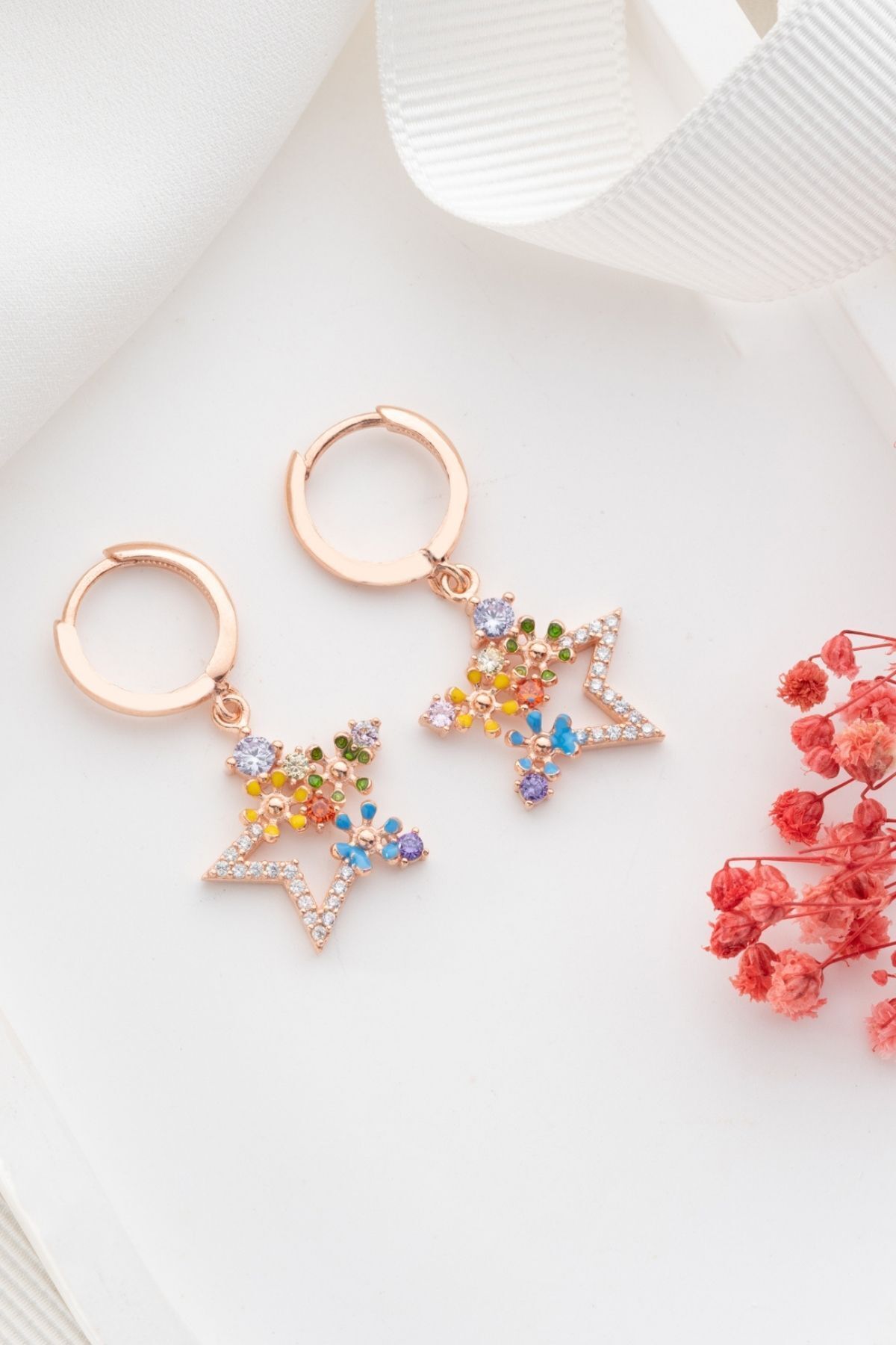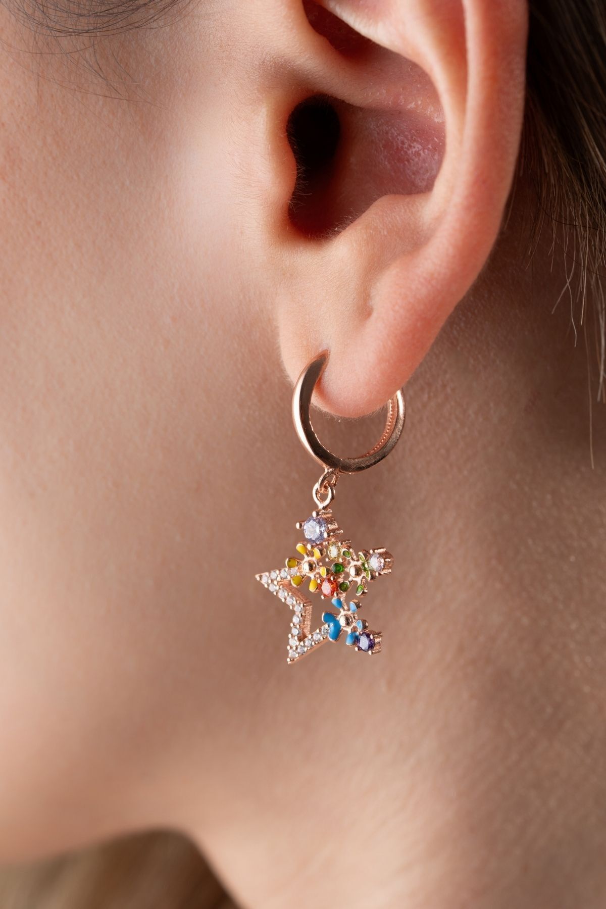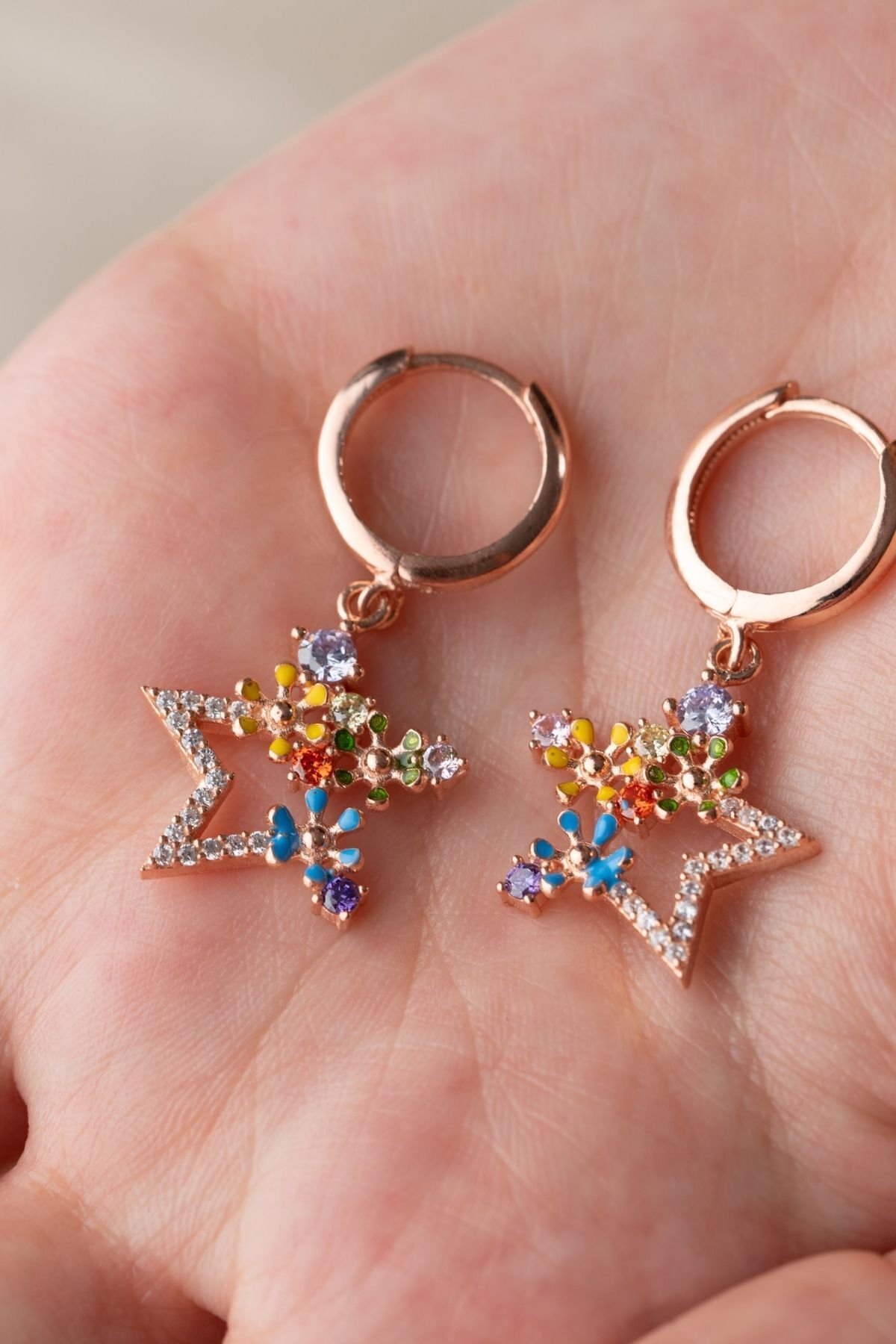 925 Ayar Gümüş Rose Mix Taşlı Yıldız Küpe