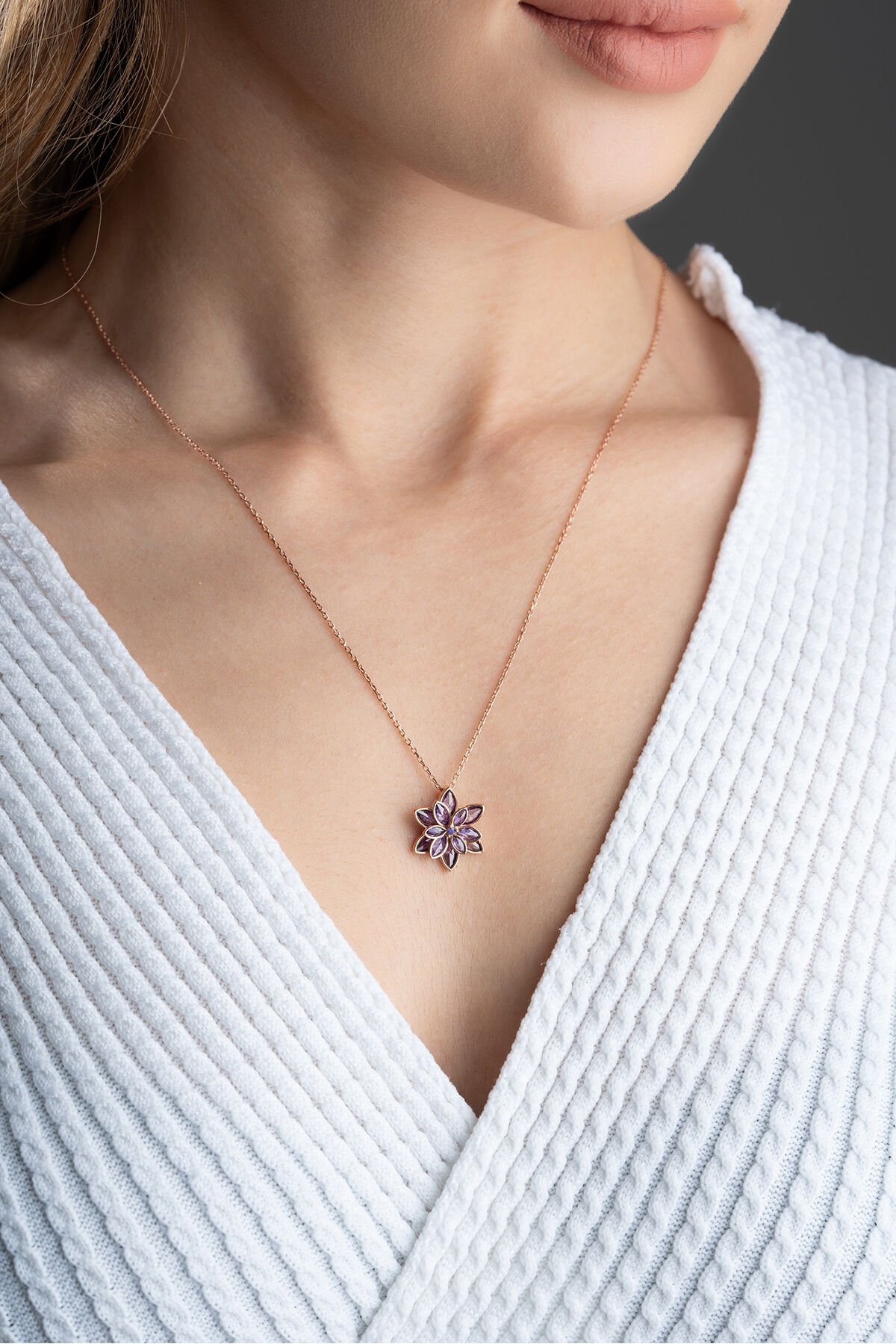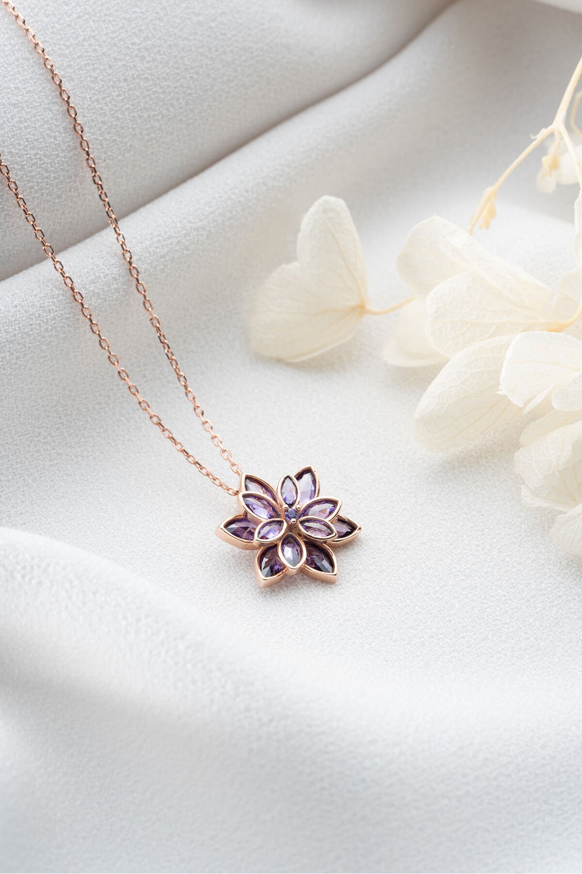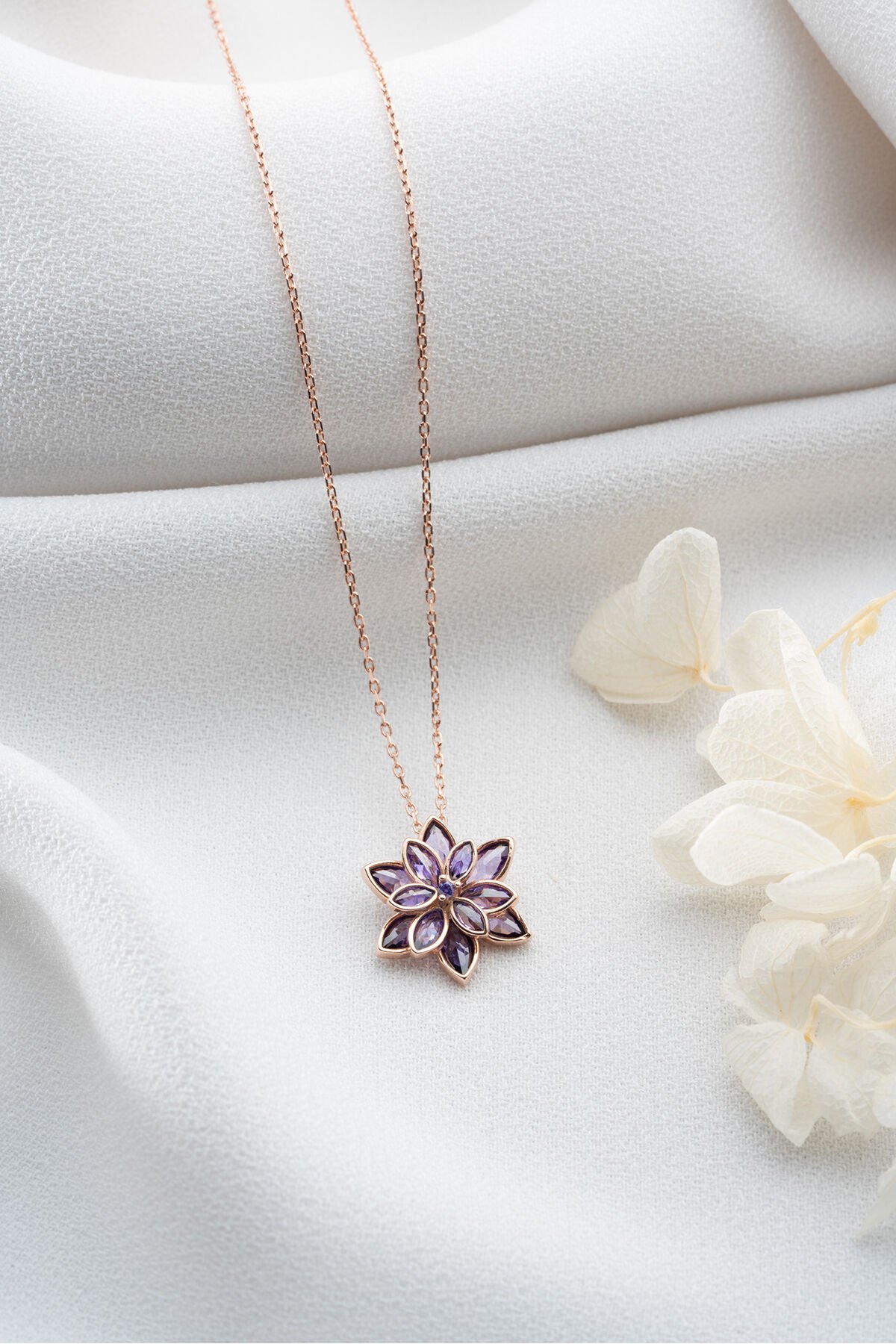 925 Ayar Gümüş Rose Mor Taşlı Lotus Kolye