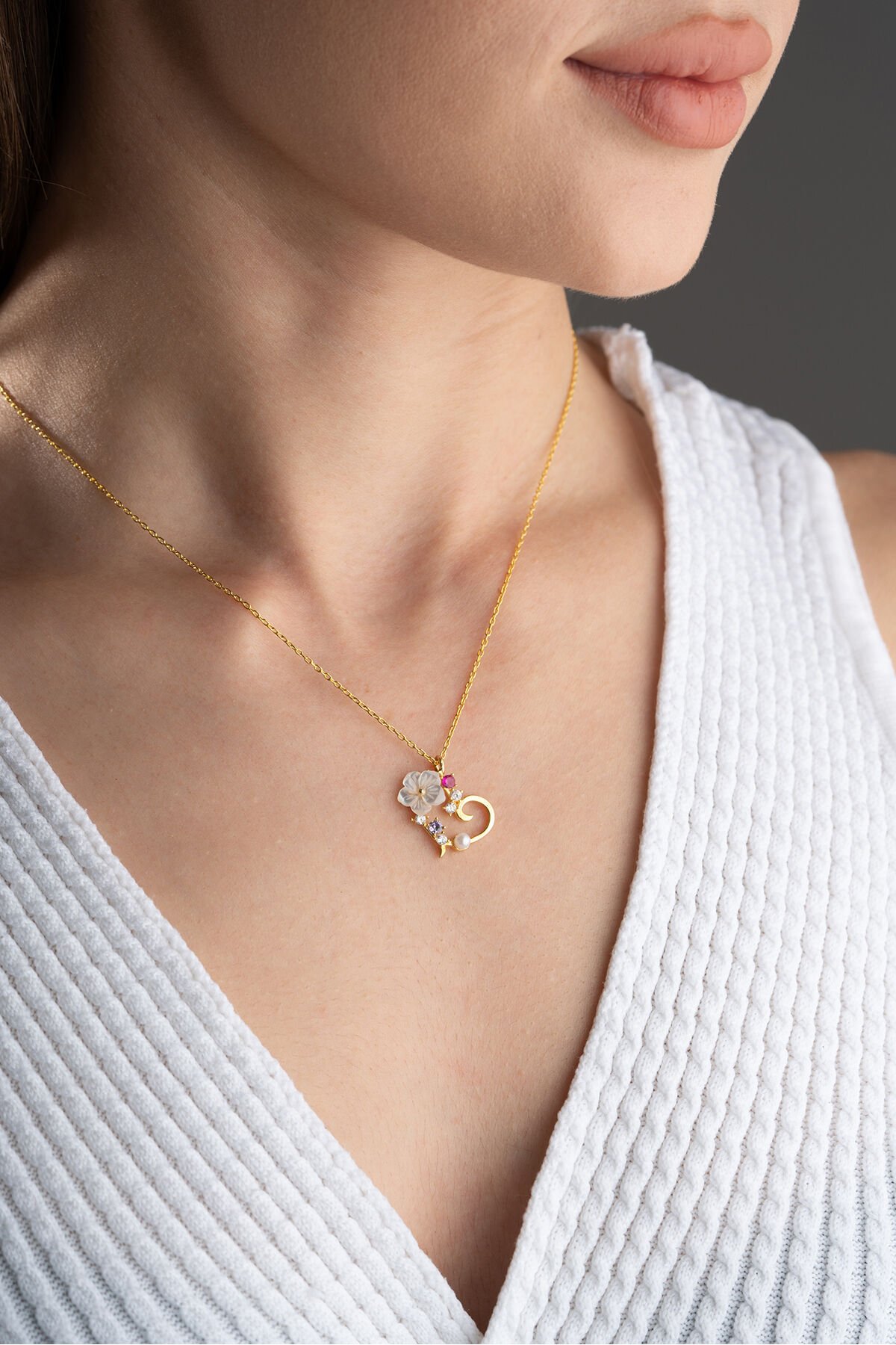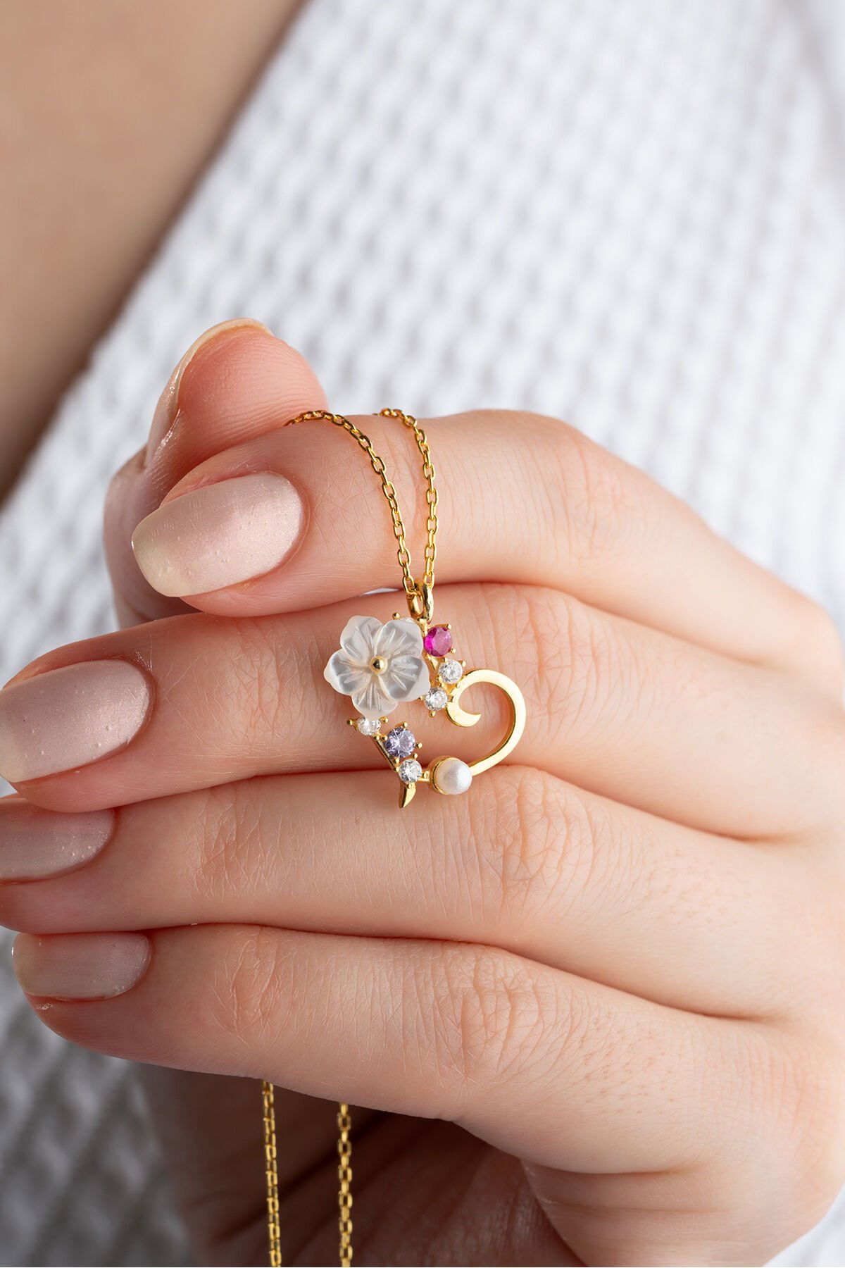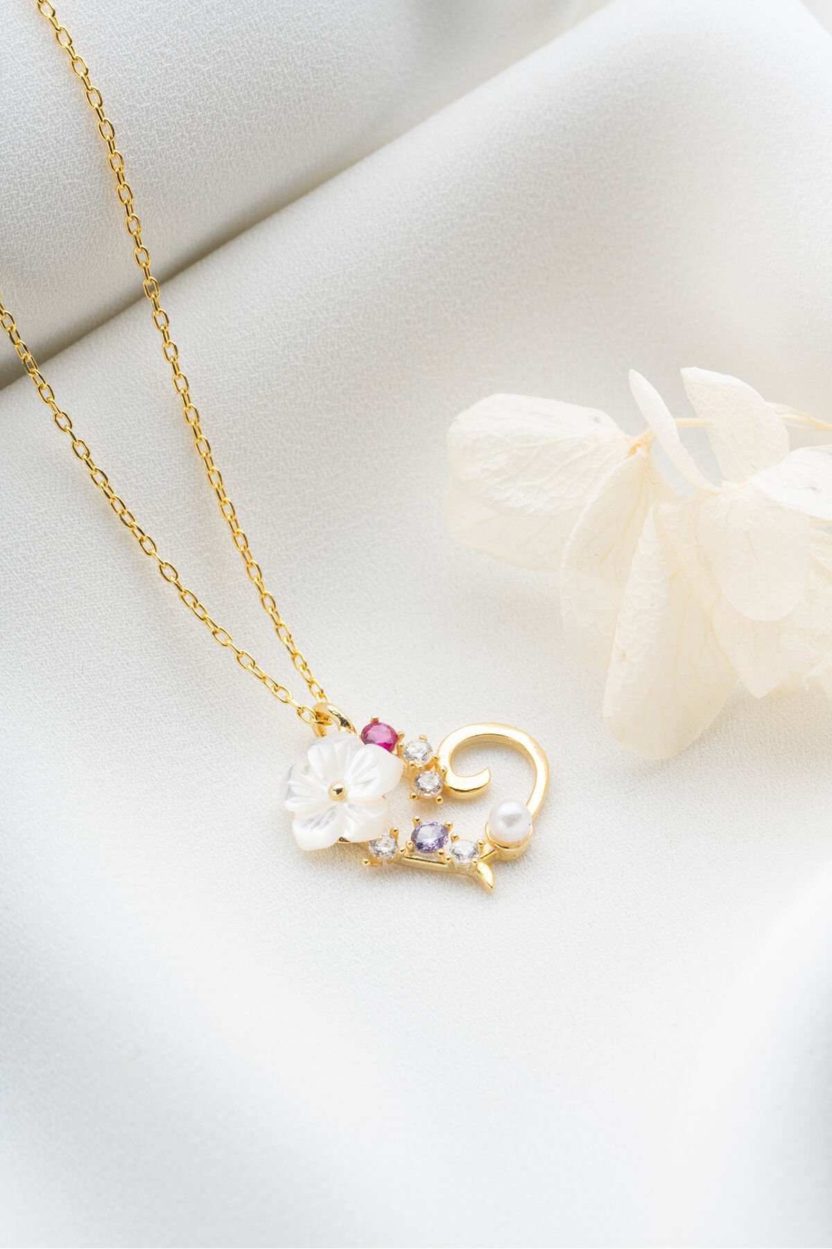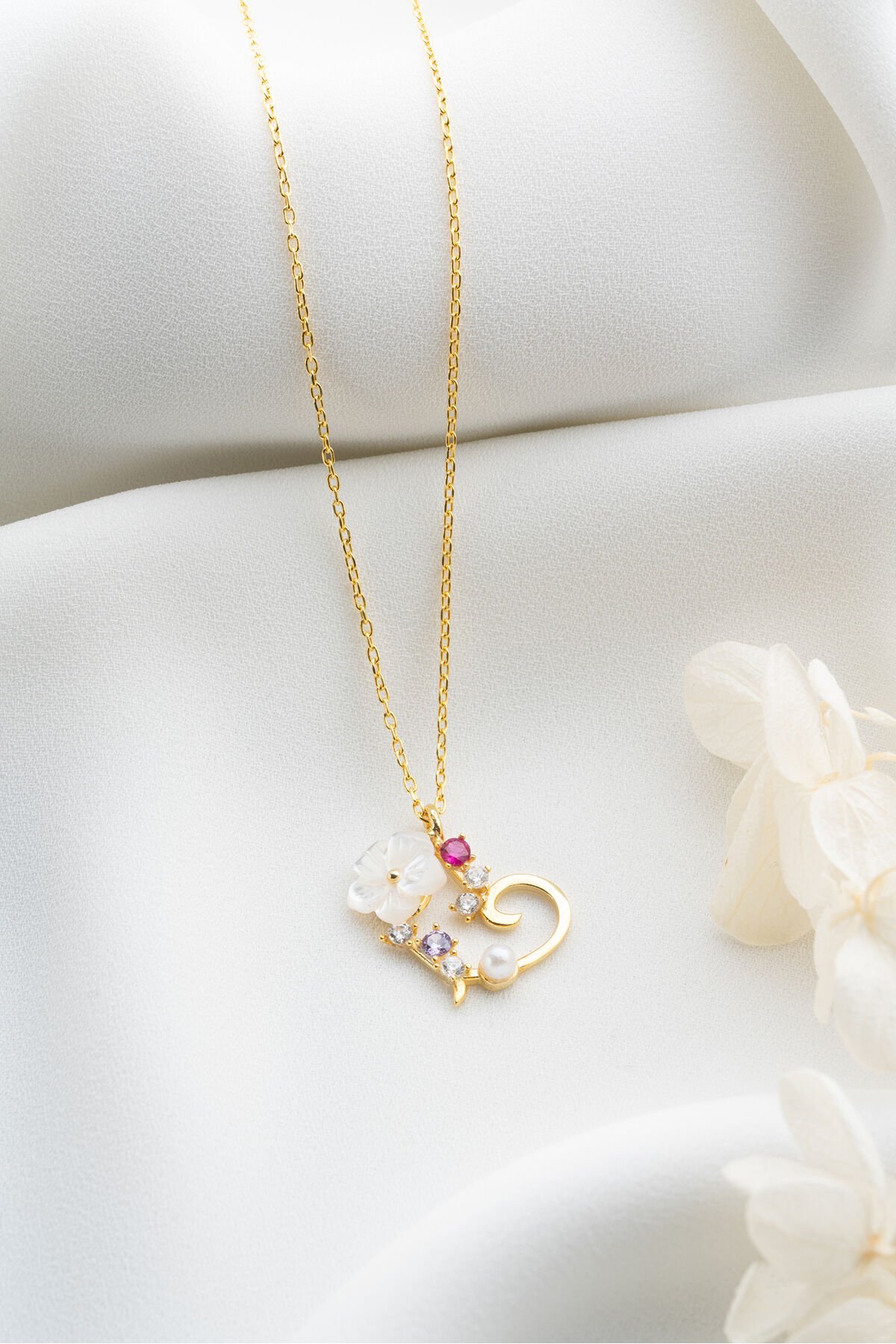 925 Ayar Gümüş Sedef Çiçekli Kalp Kolye