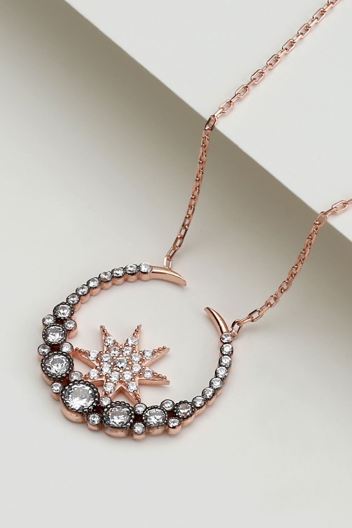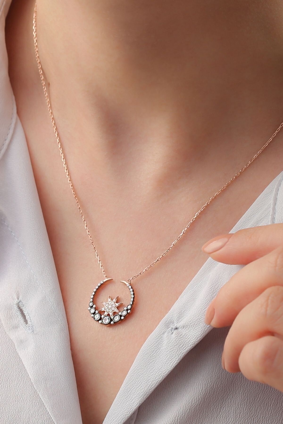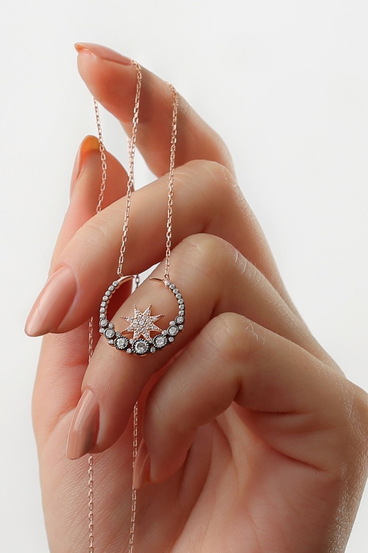 925 Ayar Gümüş Şık Tasarım Taşlı Ay Yıldız Kolye