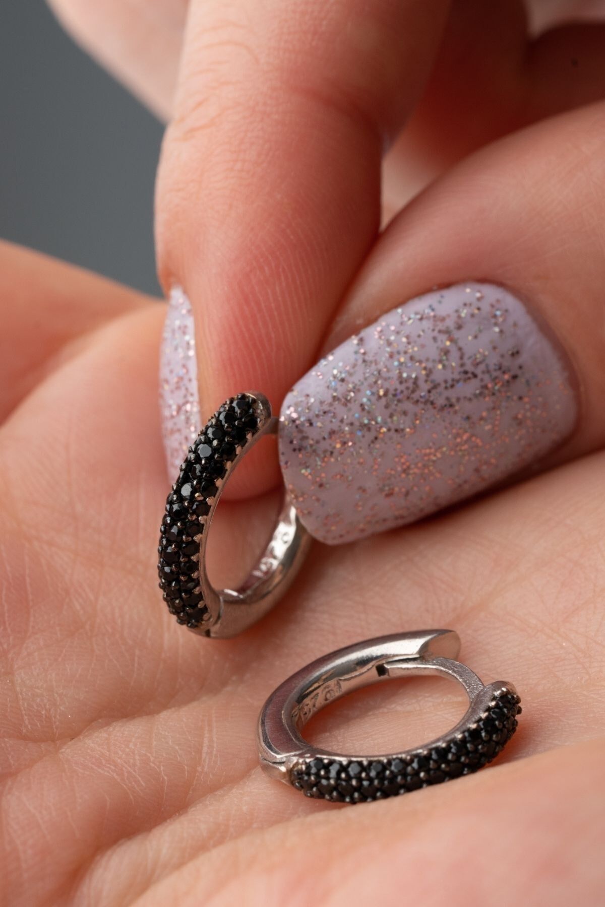 925 ayar gümüş malzeme ile üretilmiş, uzun ömürlü ve kaliteli bir aksesuar deneyimi sunar; Siyah renkli zirkon taşlarla süslenmiş, şıklığı ve zarafeti bir arada barındırır; Her tür kıyafetle kolayca uyum sağlayabilen, modern ve zamansız tasarımıyla dikkat çeker; Zirkon taşların parlaklığı ve gümüşün asaleti ile göz alıcı bir görünüm kazandırır;