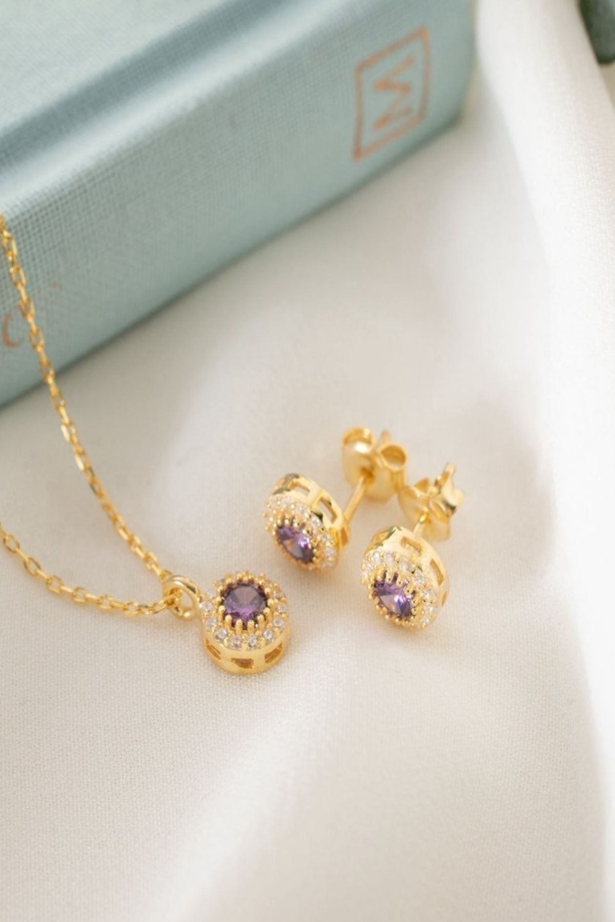 925 Ayar Gümüş Şubat Ayı Doğum Taşı ( Ametist ) Kolye - Küpe Seti