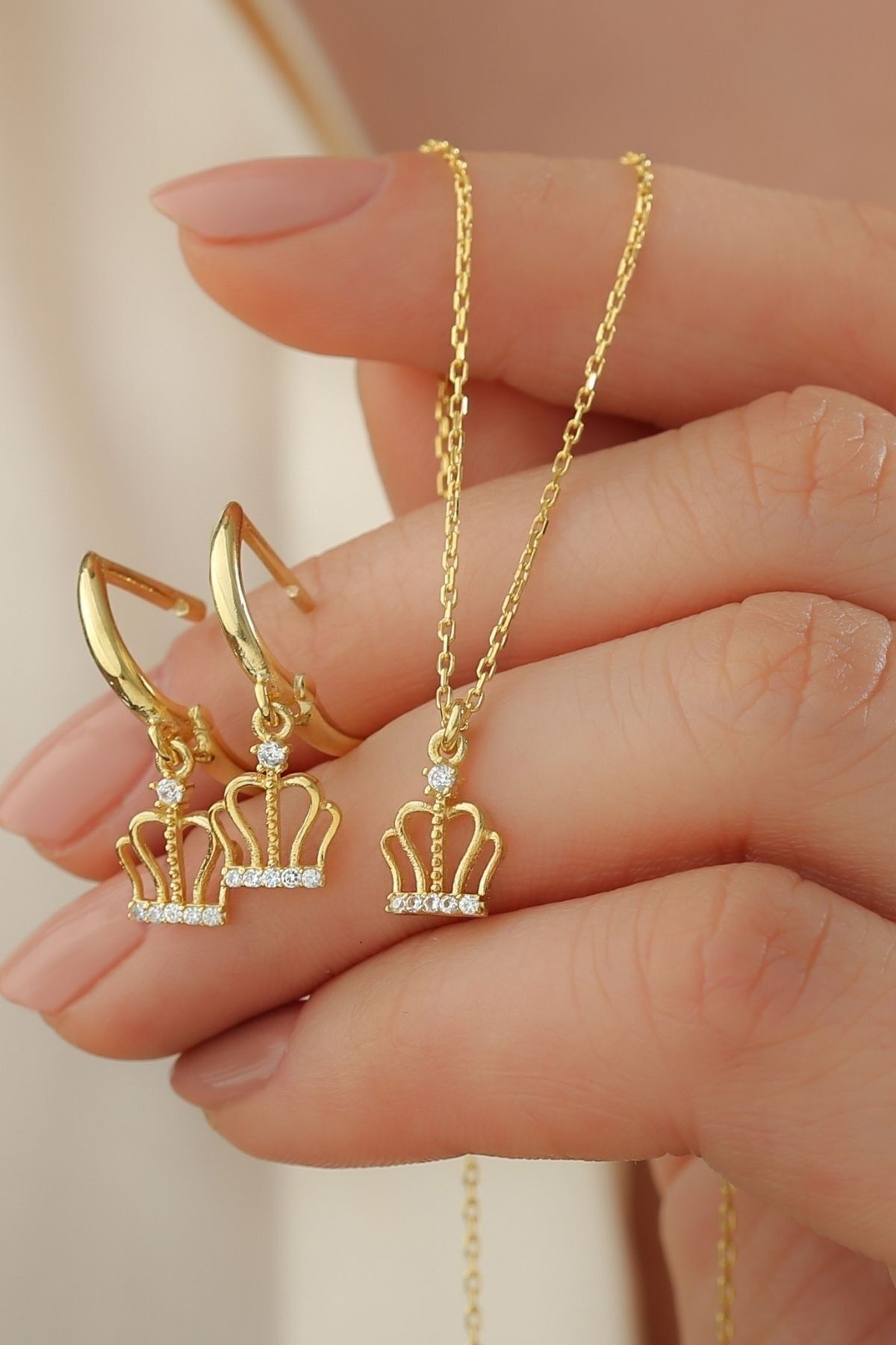 925 Ayar Gümüş Taçlı Kolye Küpe Takı Seti