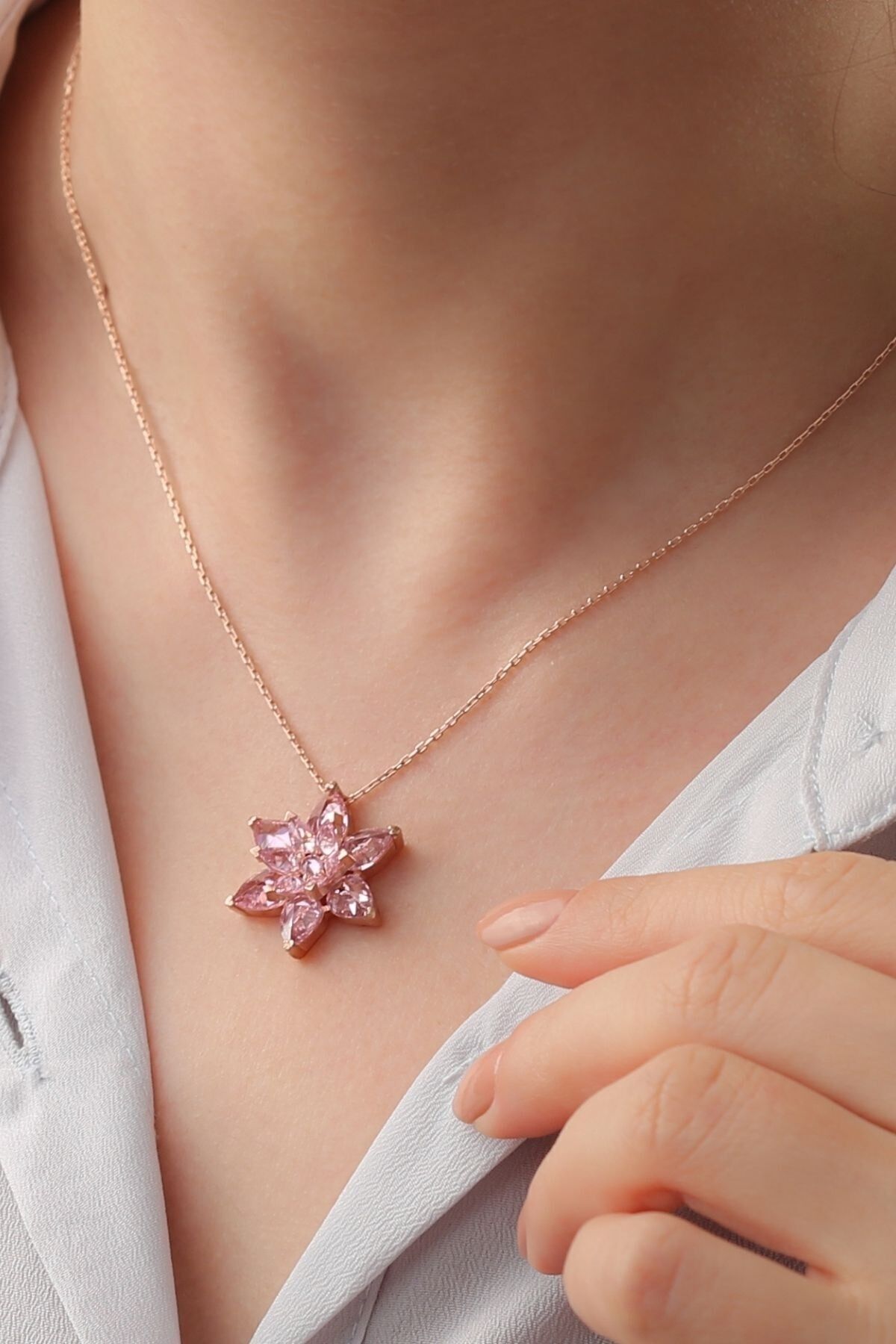 925 Ayar Gümüş Toz Pembe Renkli Lotus Kolye