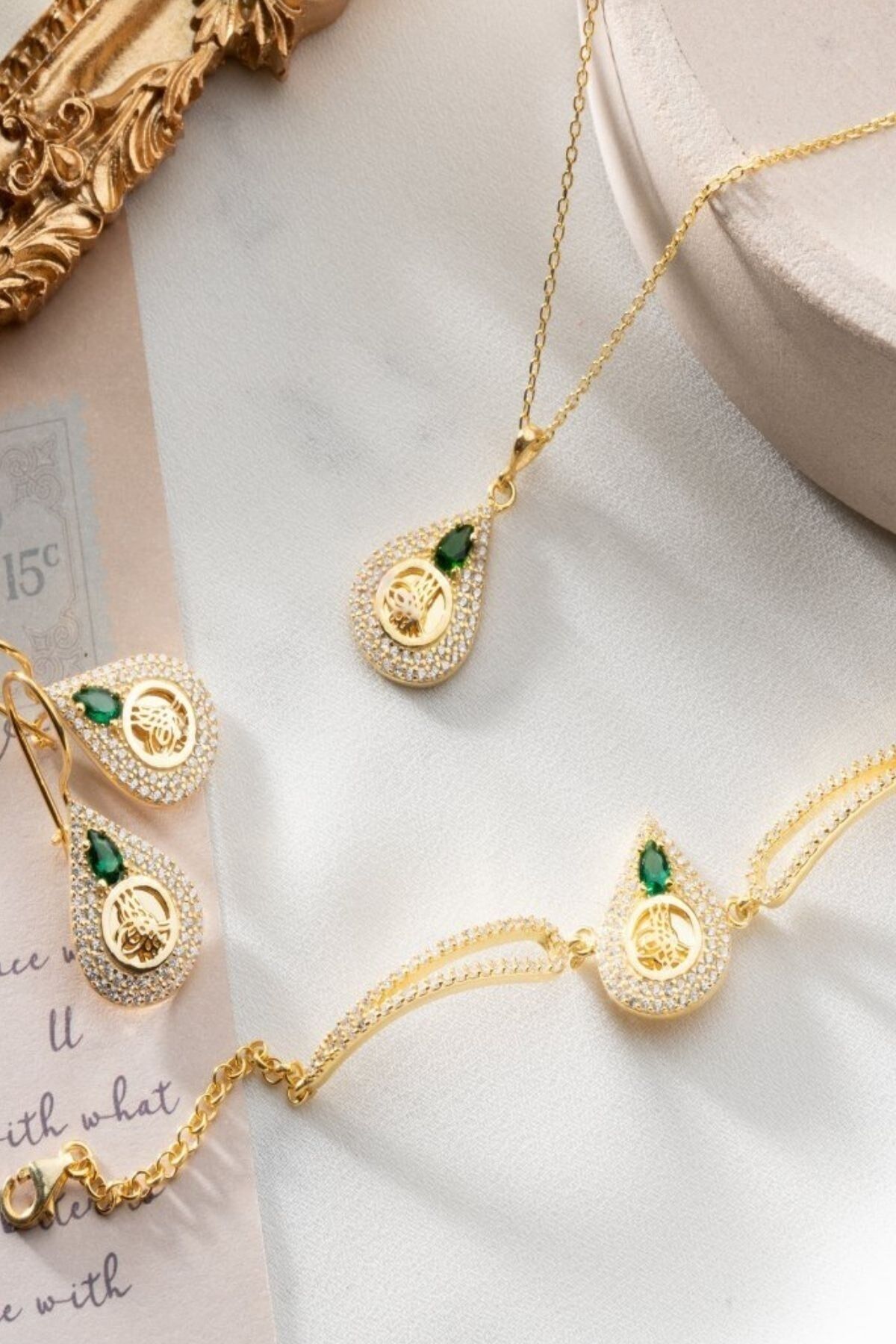 925 Ayar Gümüş Tuğralı Kolye-bileklik -küpe Seti