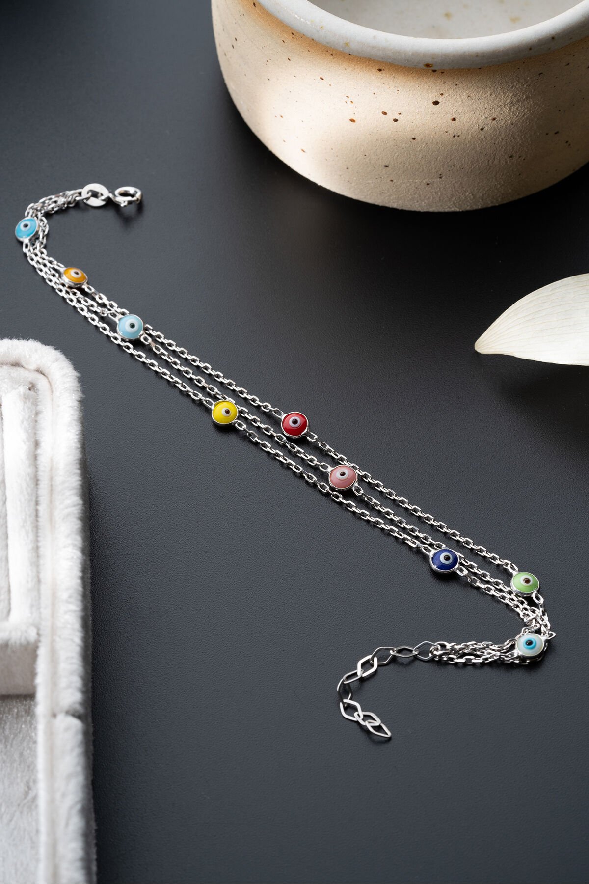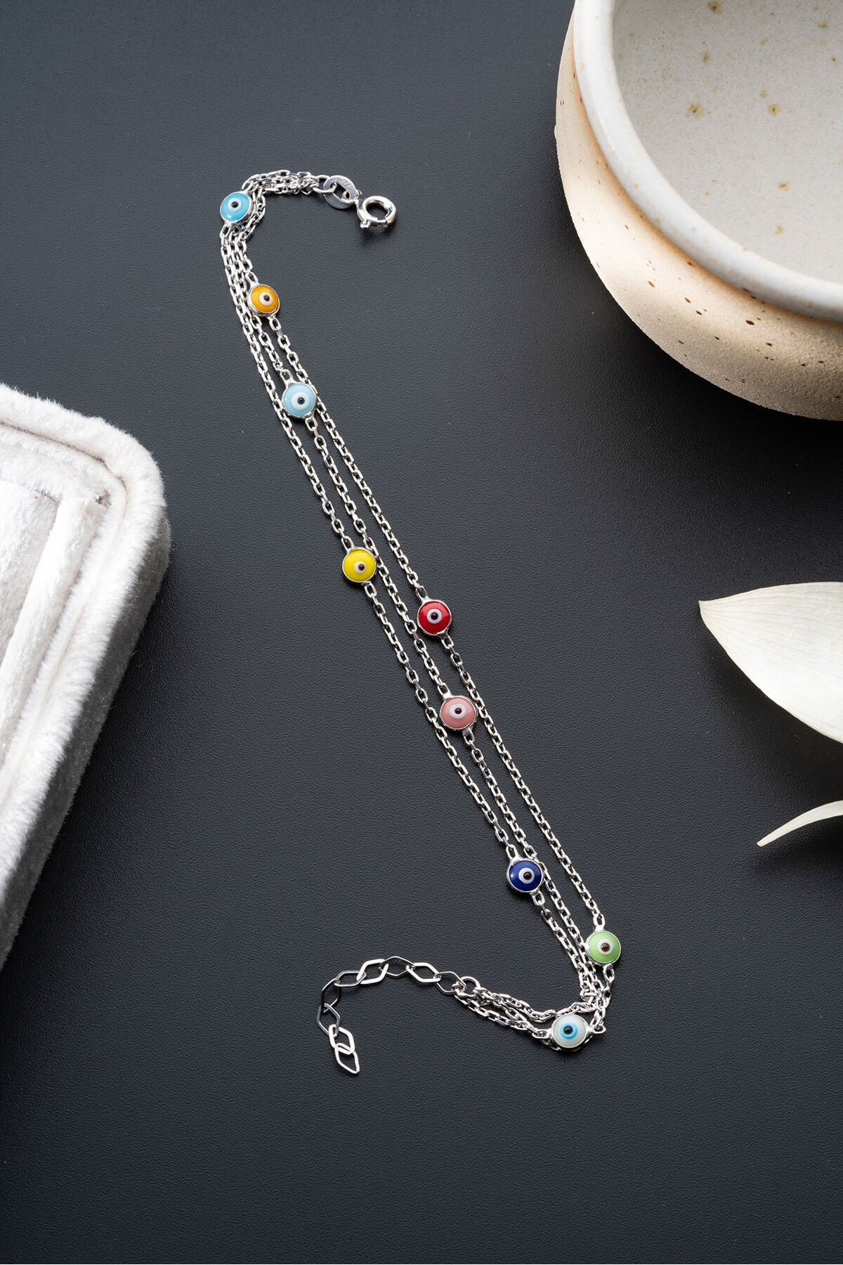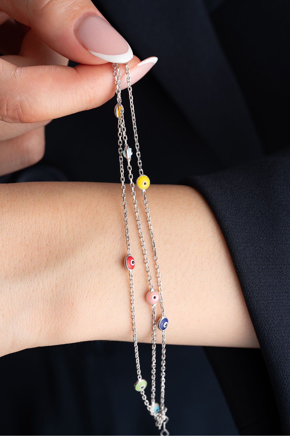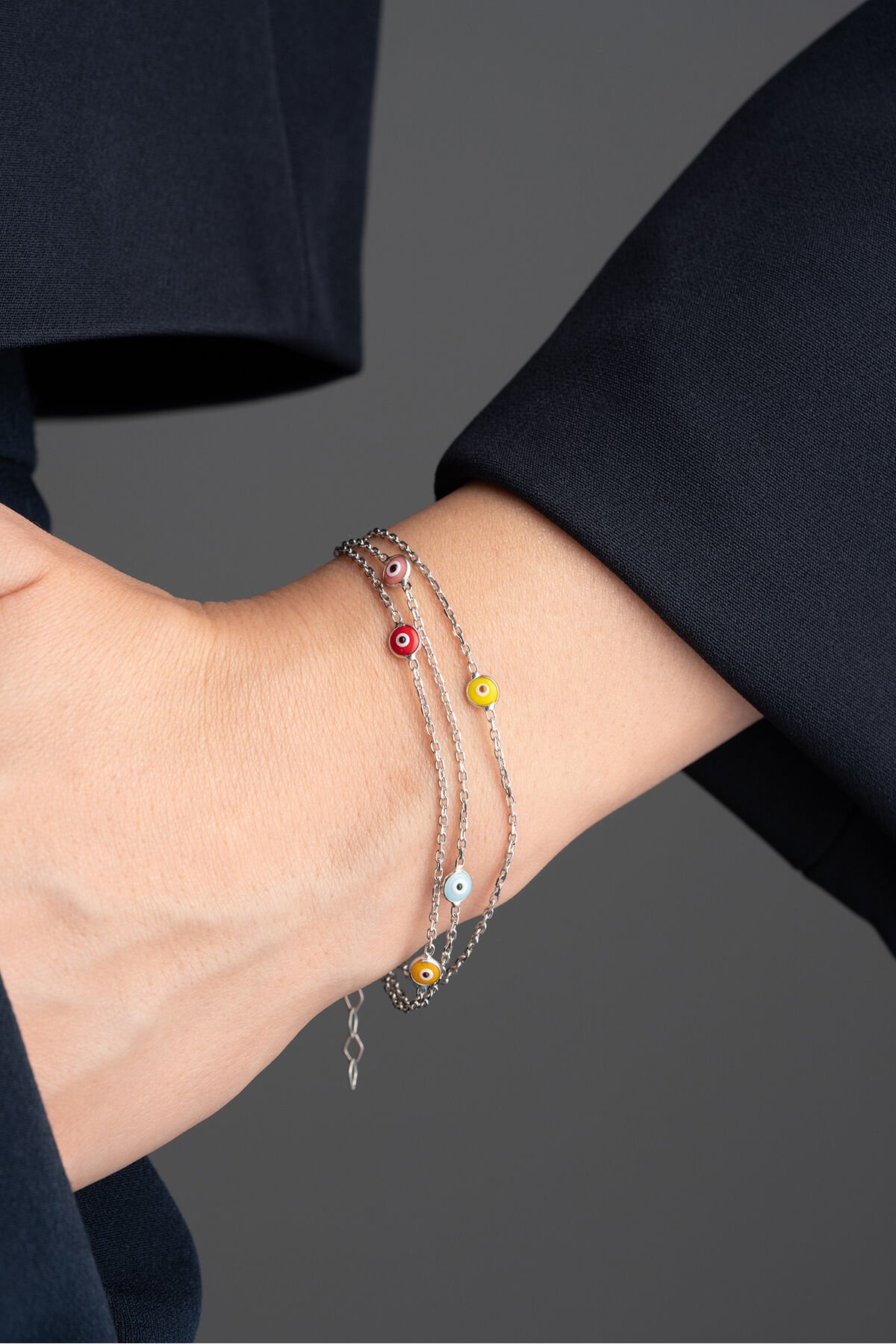 925 Ayar Gümüş Üç Zincir Renkli Nazarlı Bileklik