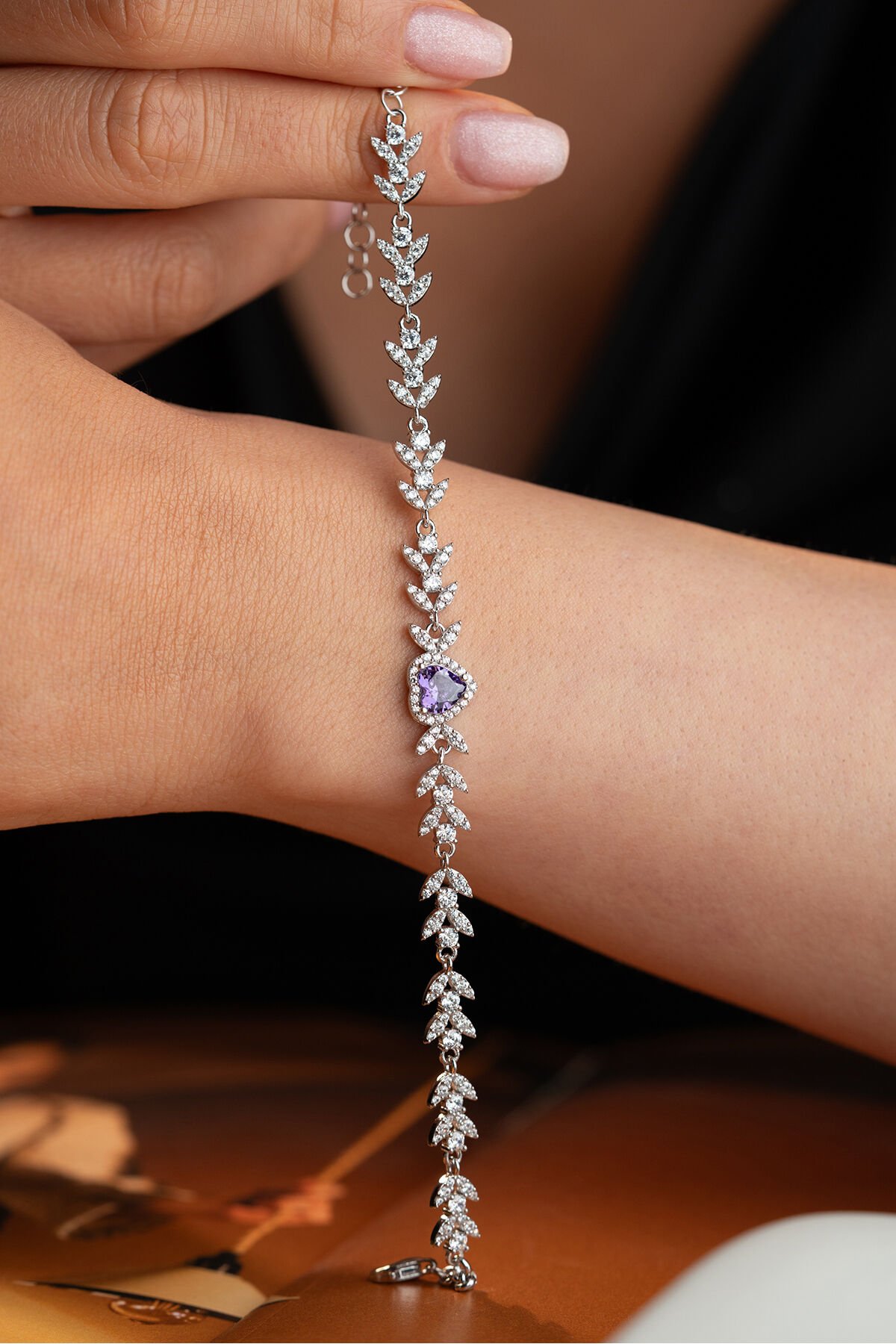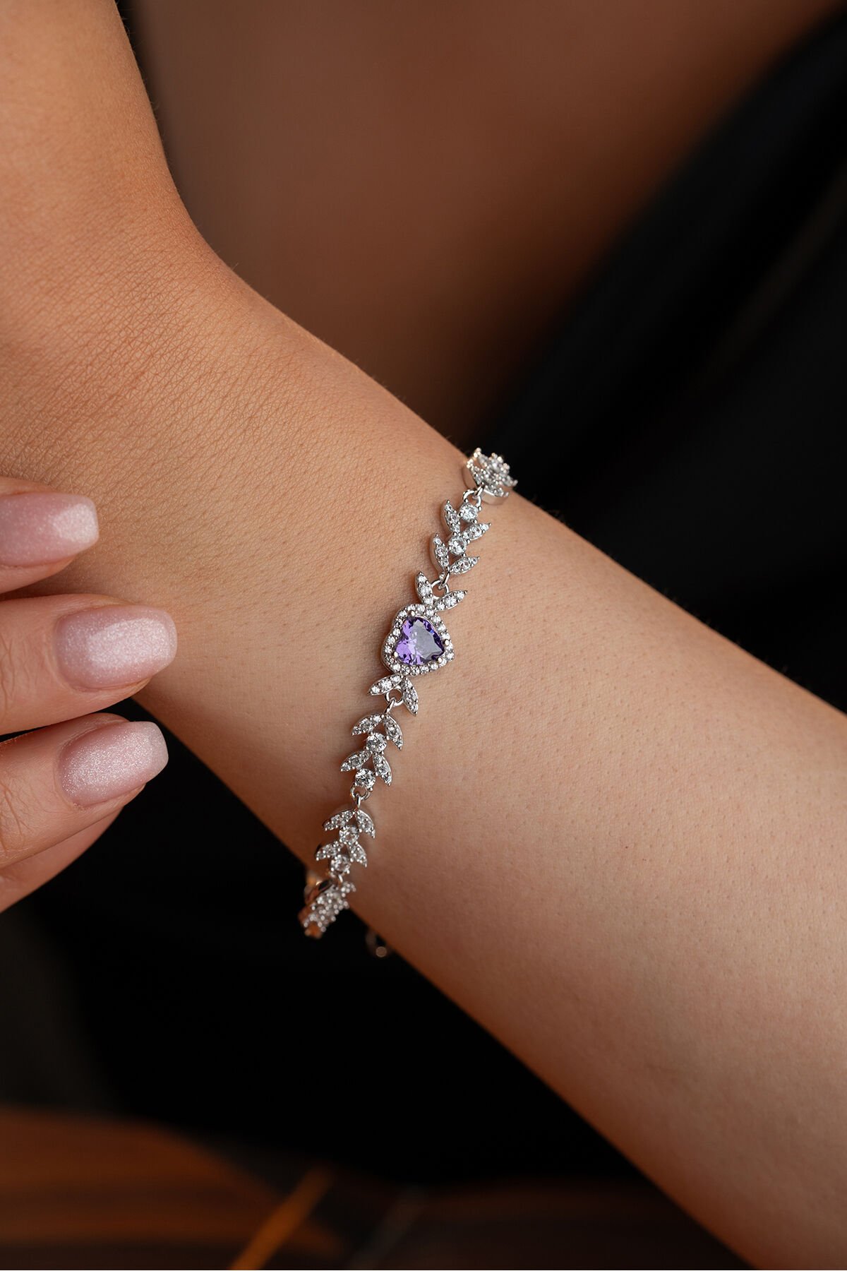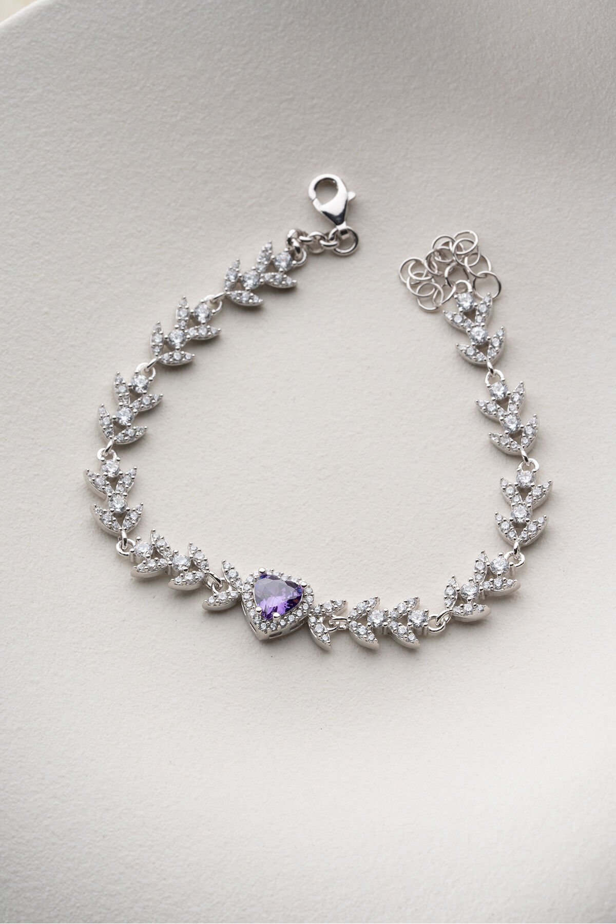 925 Ayar Gümüş Yaprak Model Amatist Taşlı Kalpli Model Bileklik