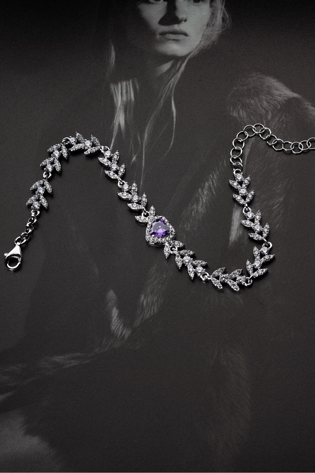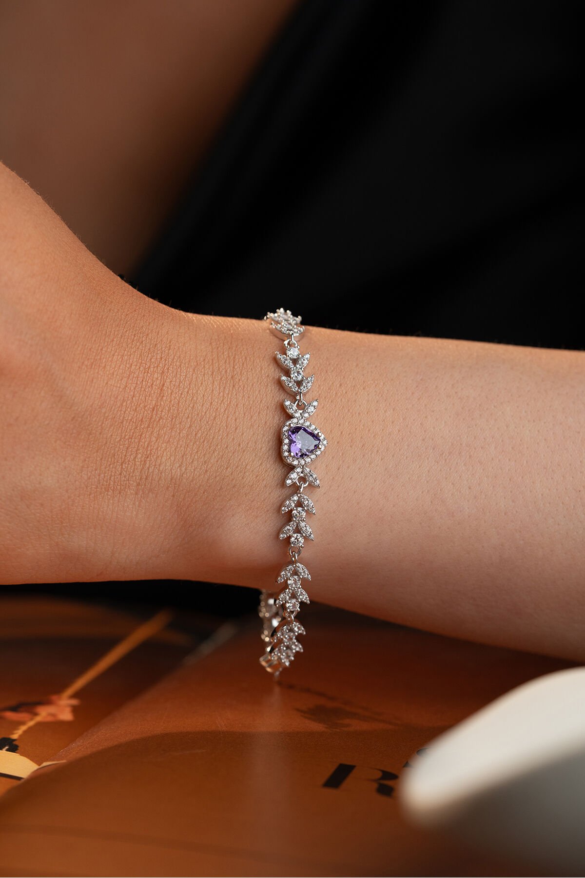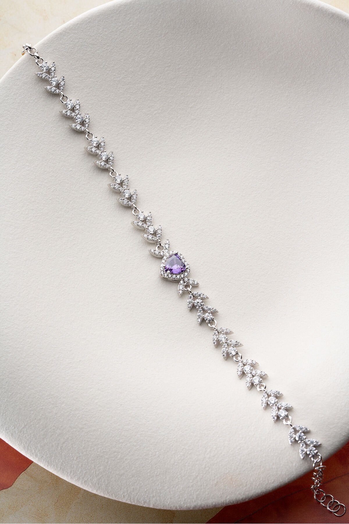 925 Ayar Gümüş Yaprak Model Amatist Taşlı Kalpli Model Bileklik