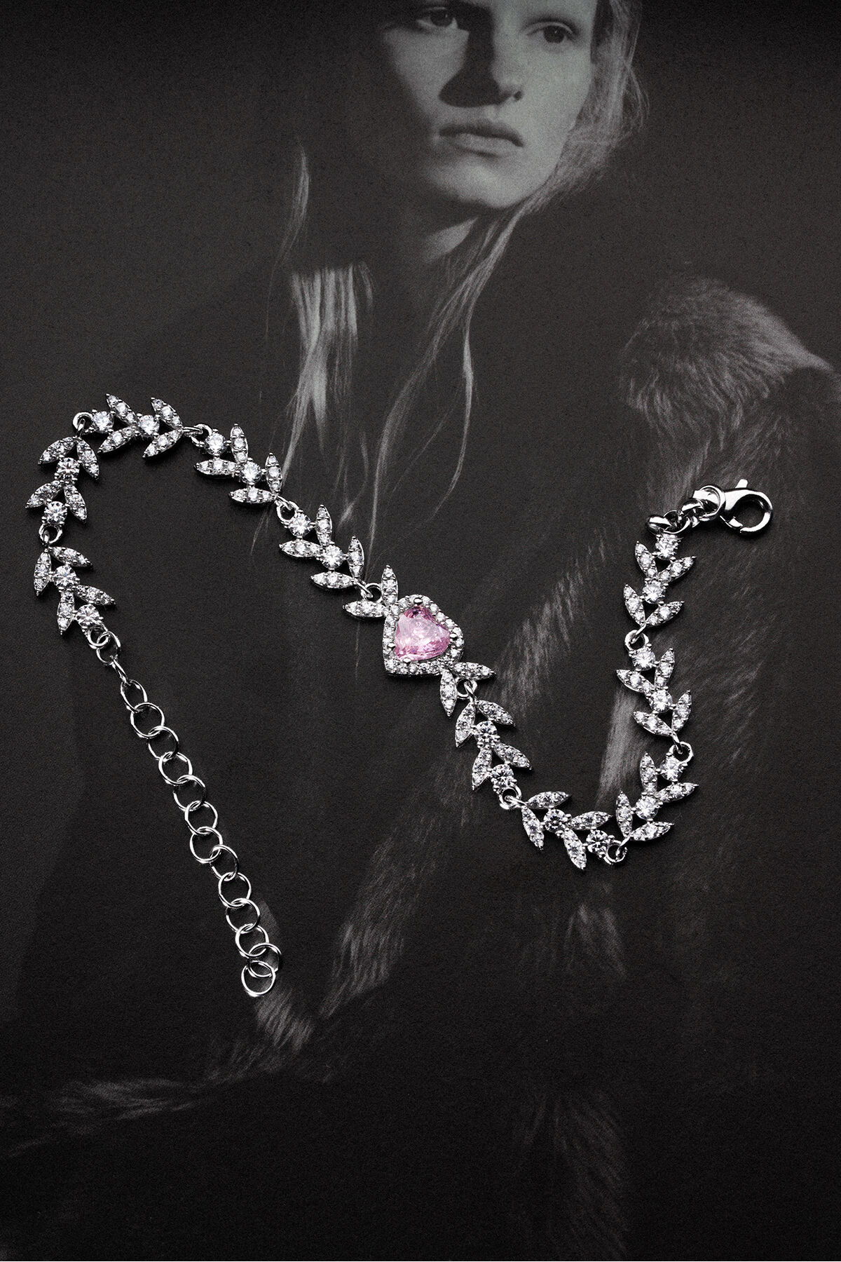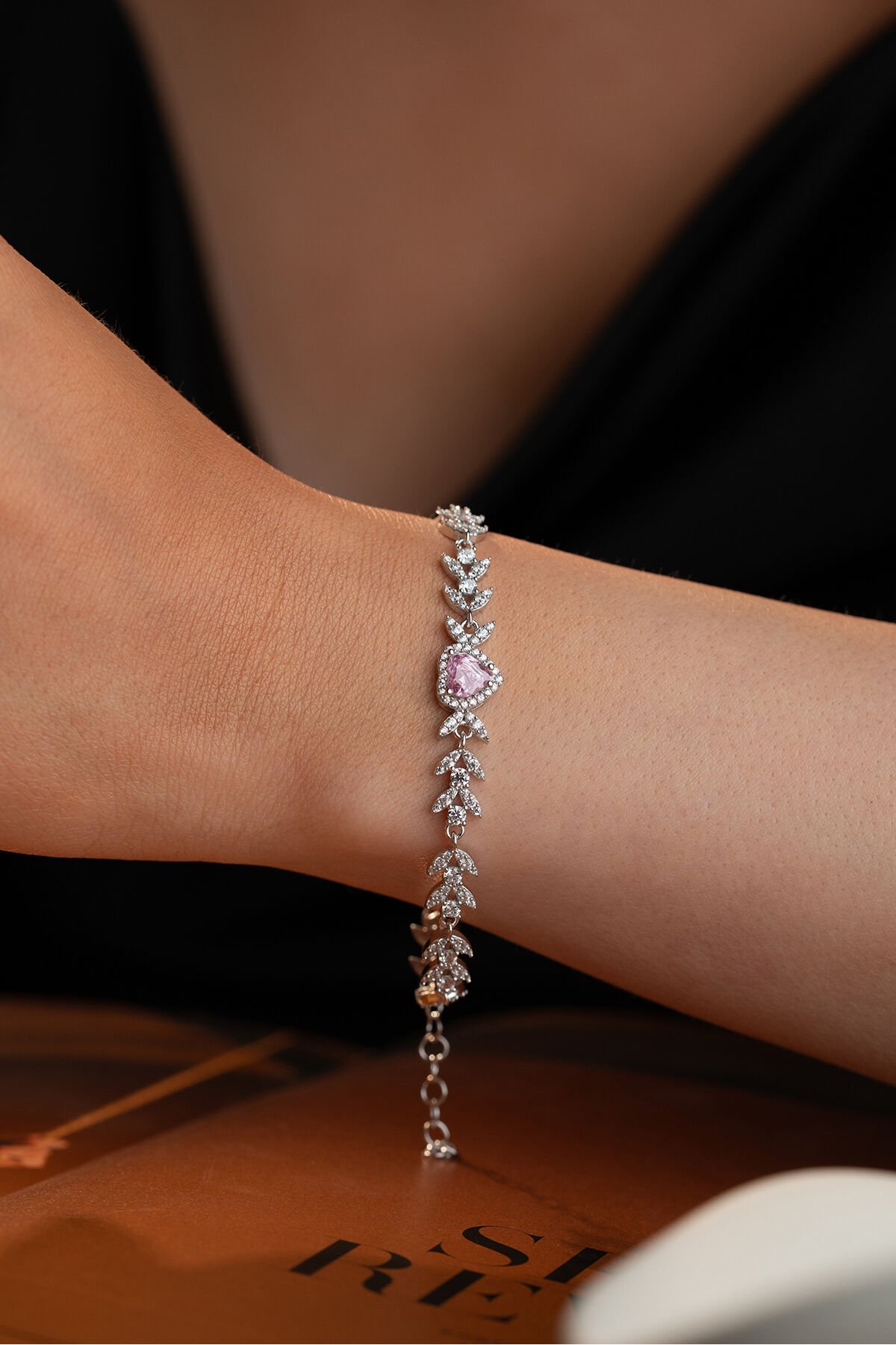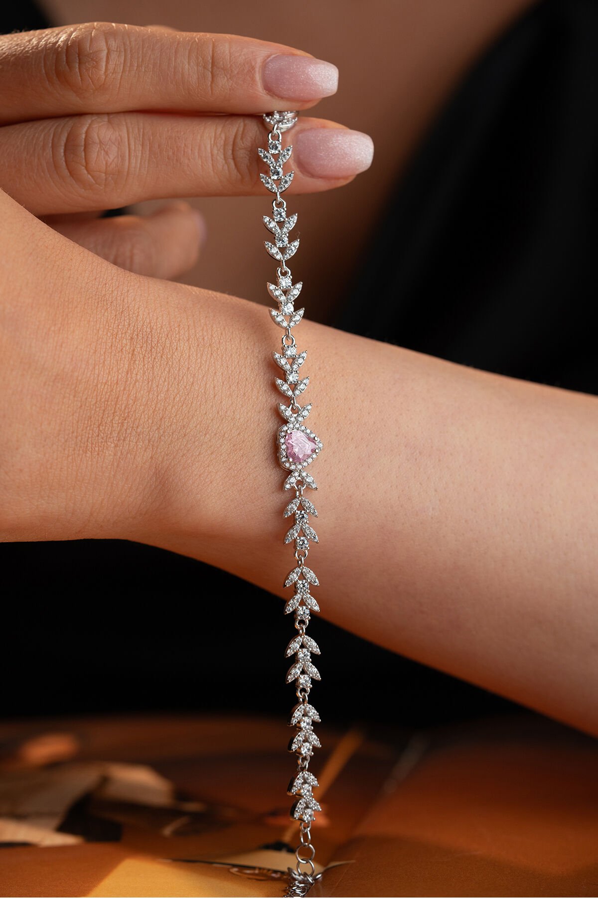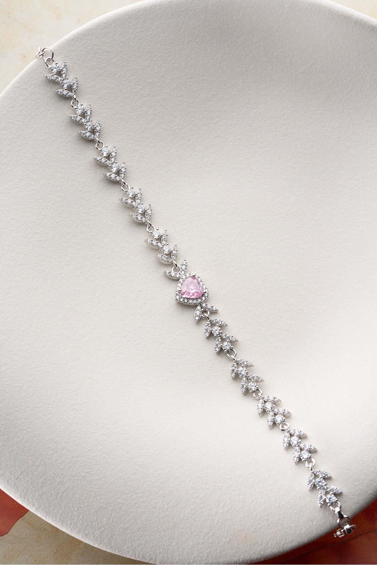 925 Ayar Gümüş Yaprak Model Pembe Taşkı Kalpli Model Bileklik
