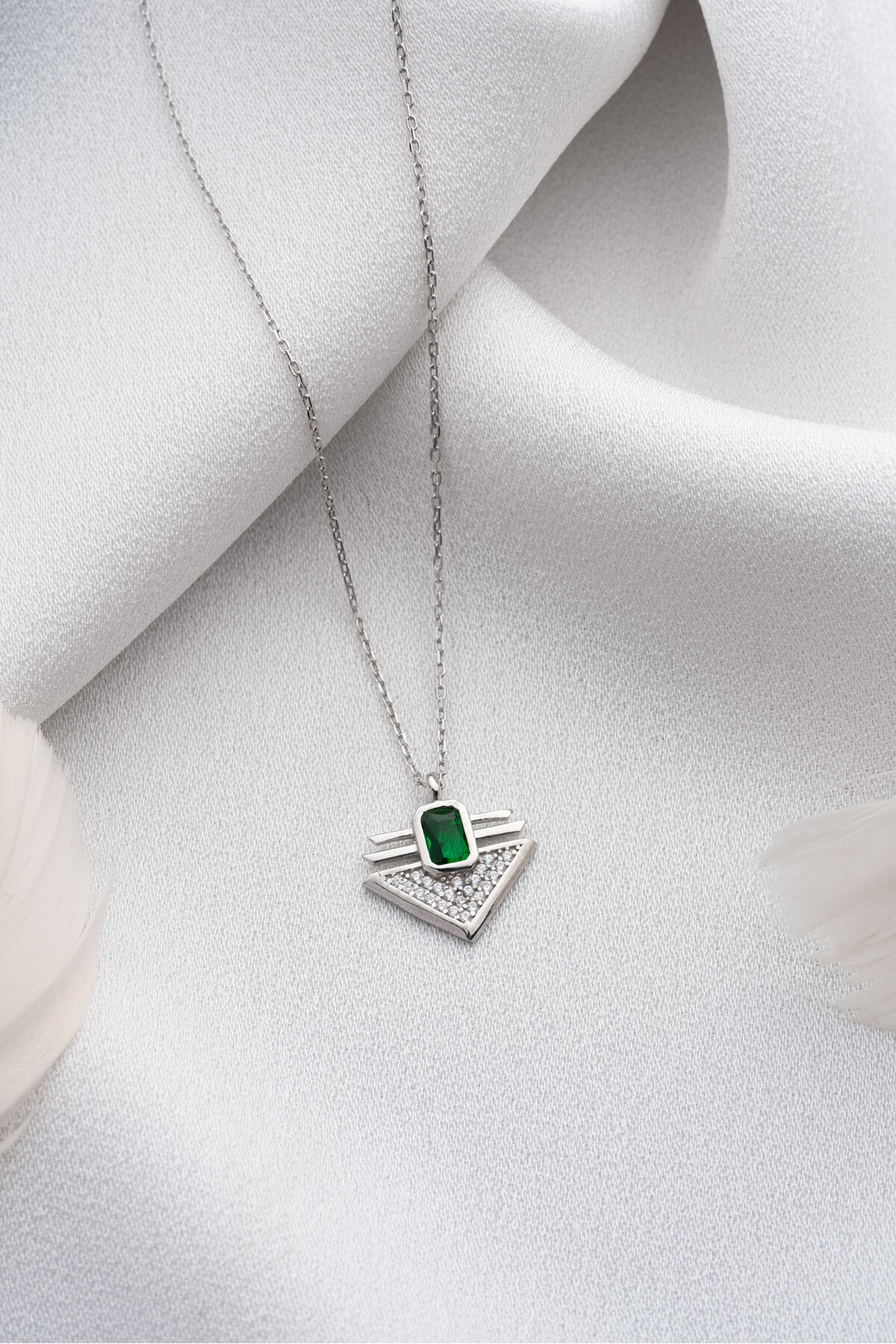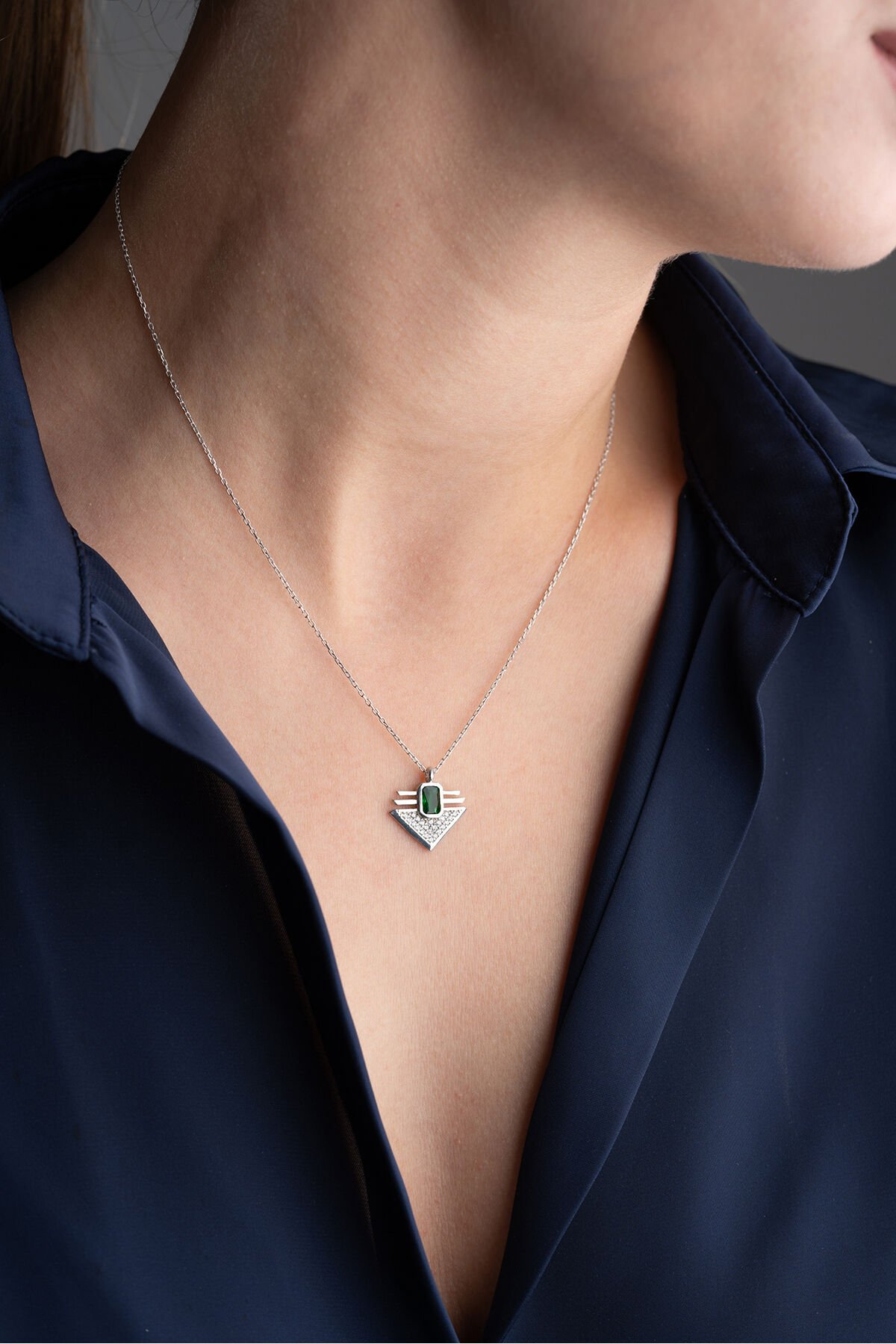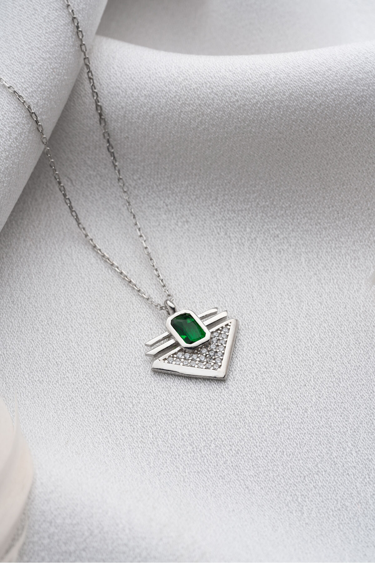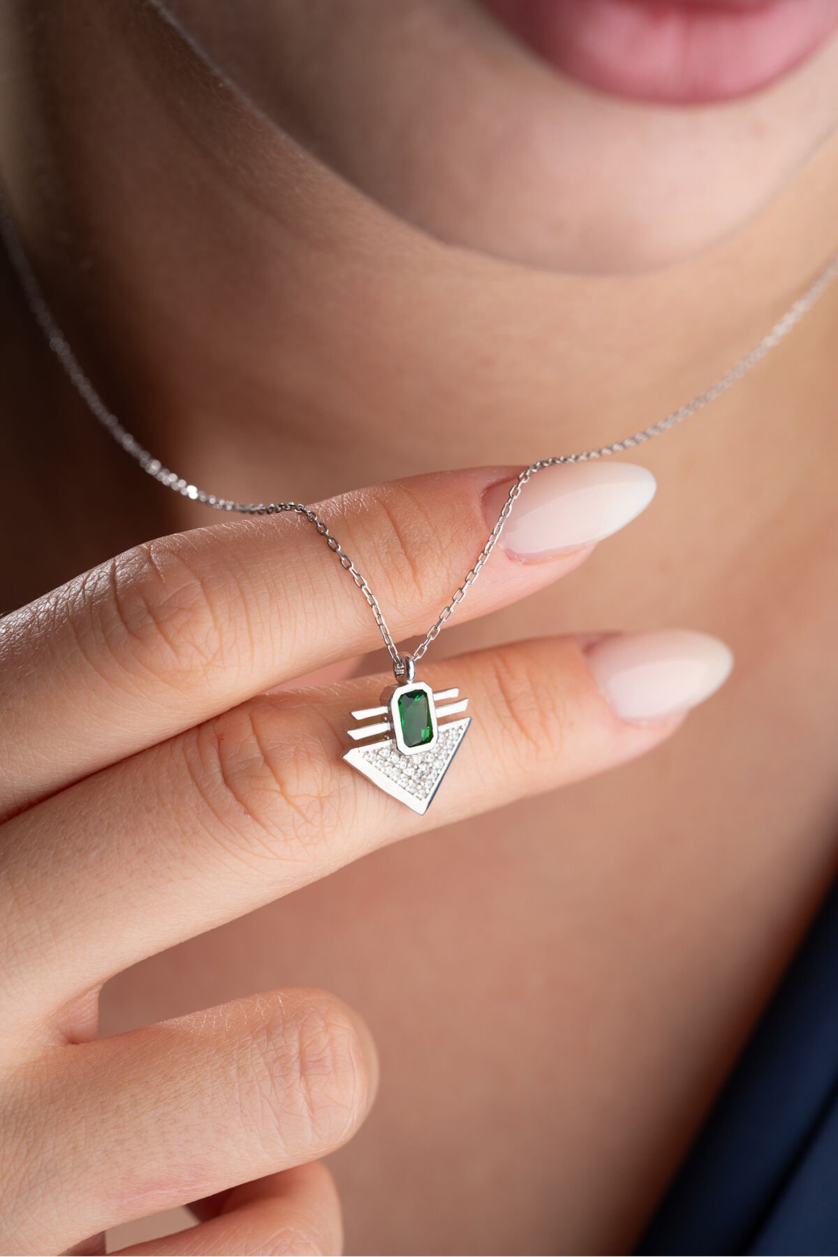 925 Ayar Gümüş Yeşil Taşlı Üçgen Trend Kolye