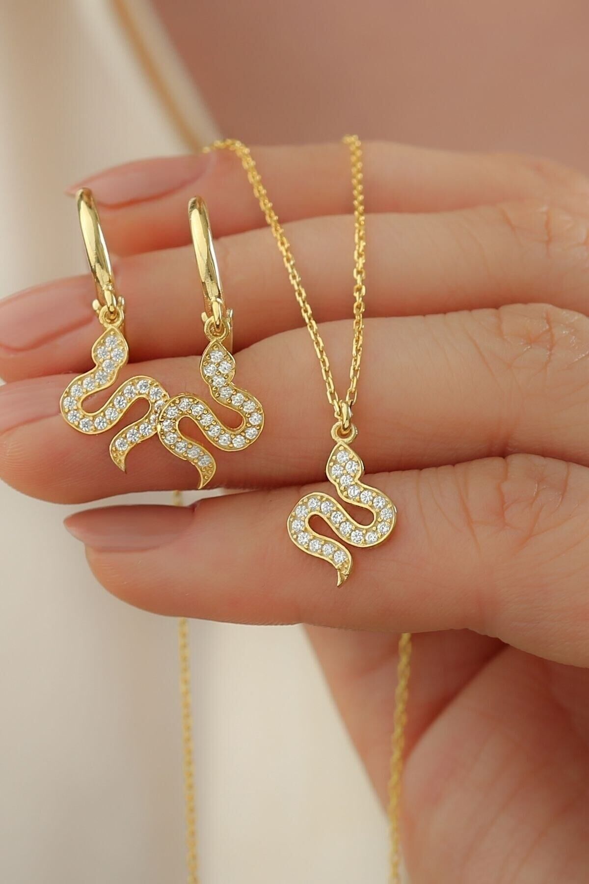 925 Ayar Gümüş Yılanlı Küpe Kolye Seti