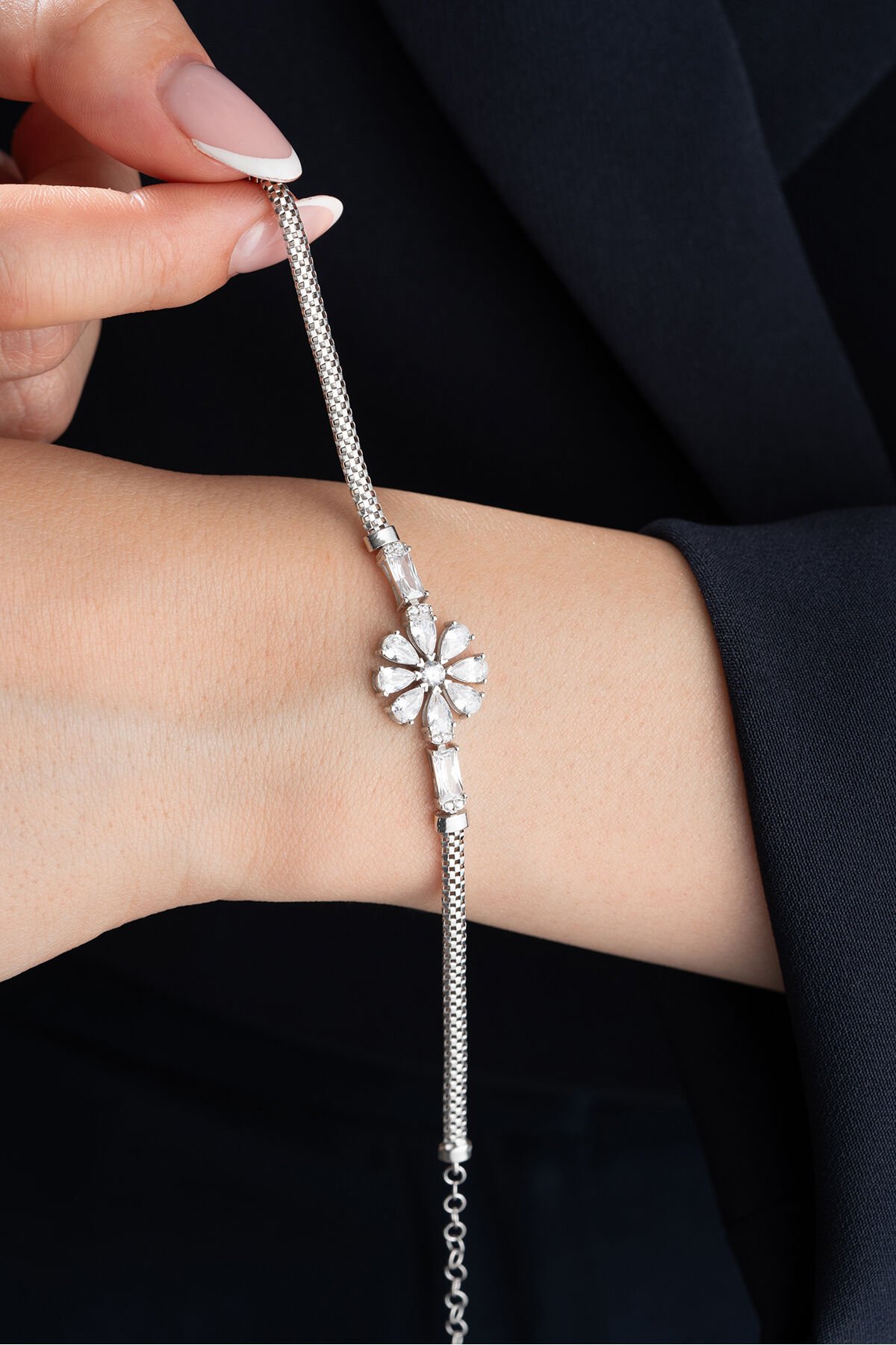 925 ayar gümüş malzeme ile üretilmiş, uzun ömürlü ve kaliteli bir aksesuar deneyimi sunar; Göz alıcı zirkon taşlarla süslenmiş, her türlü özel gününüzde şıklığınızı tamamlar; Zarif tasarımıyla dikkat çeken bu bileklik, modern ve klasik tarzları harmanlayarak her kıyafetle uyum sağlar;