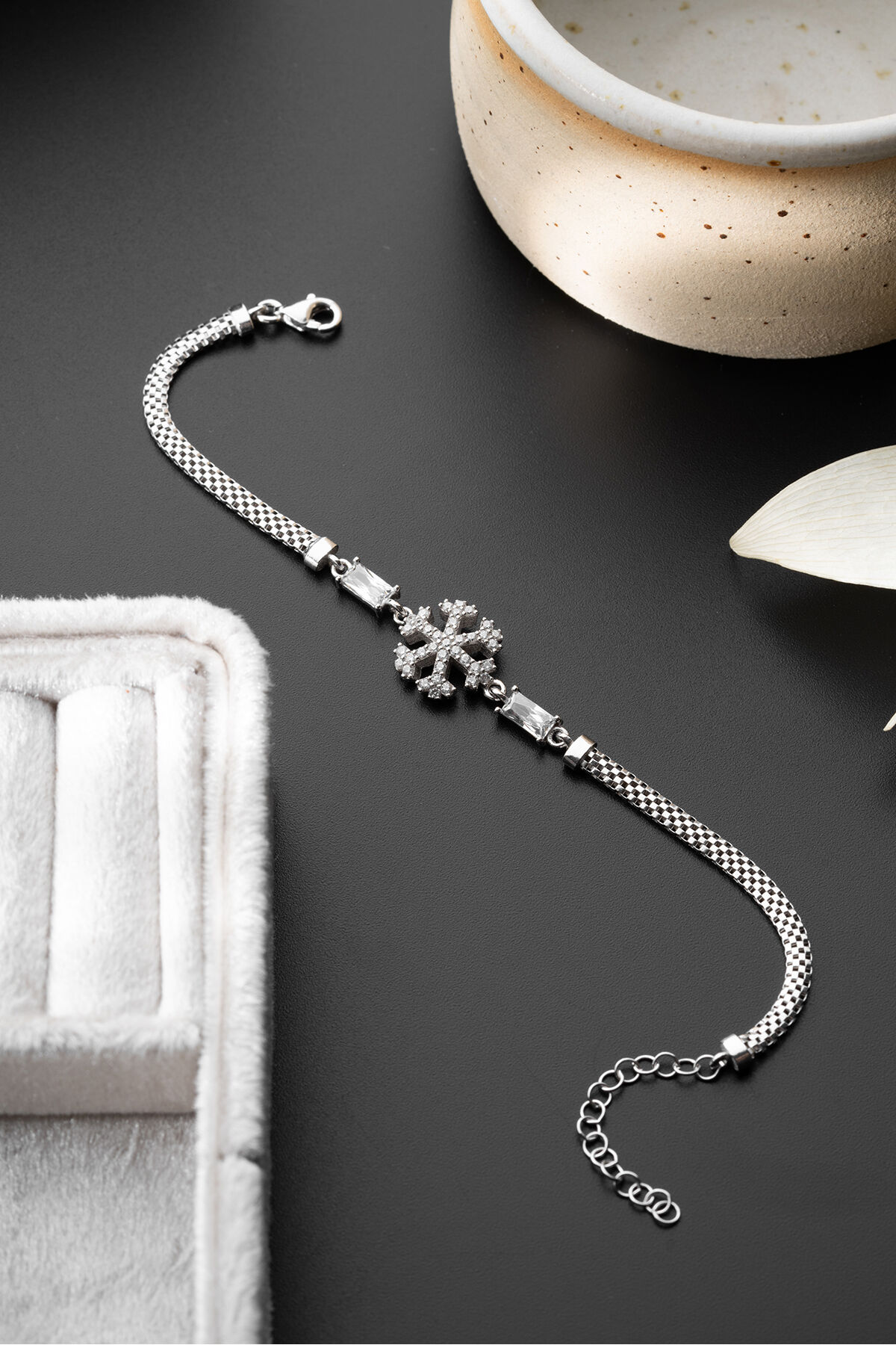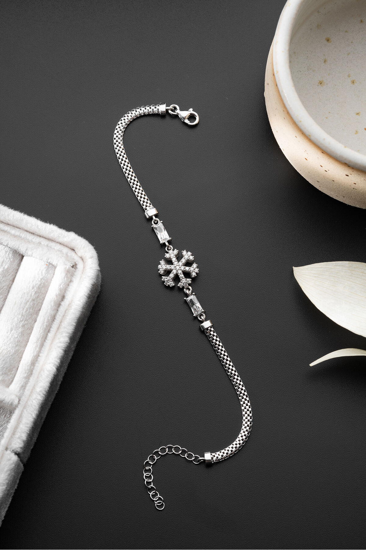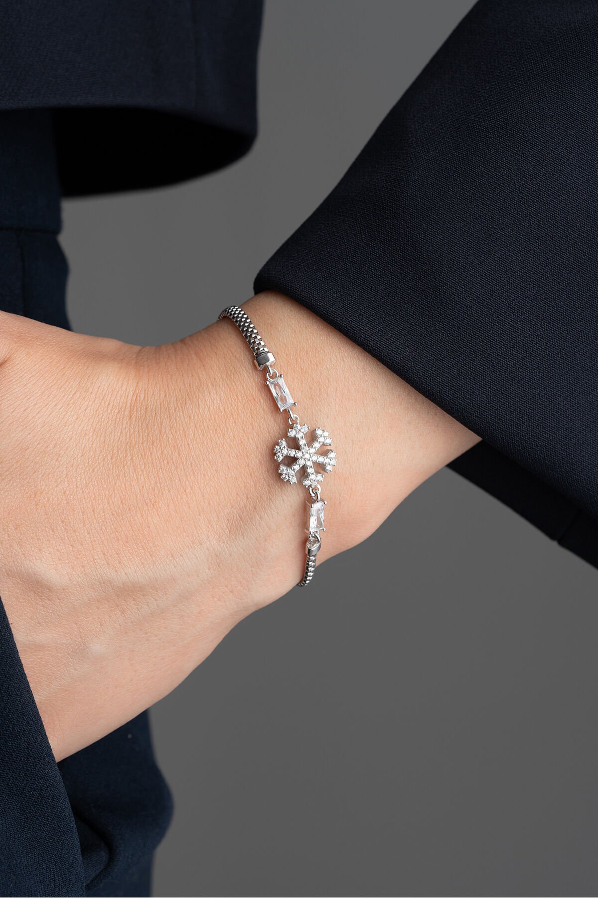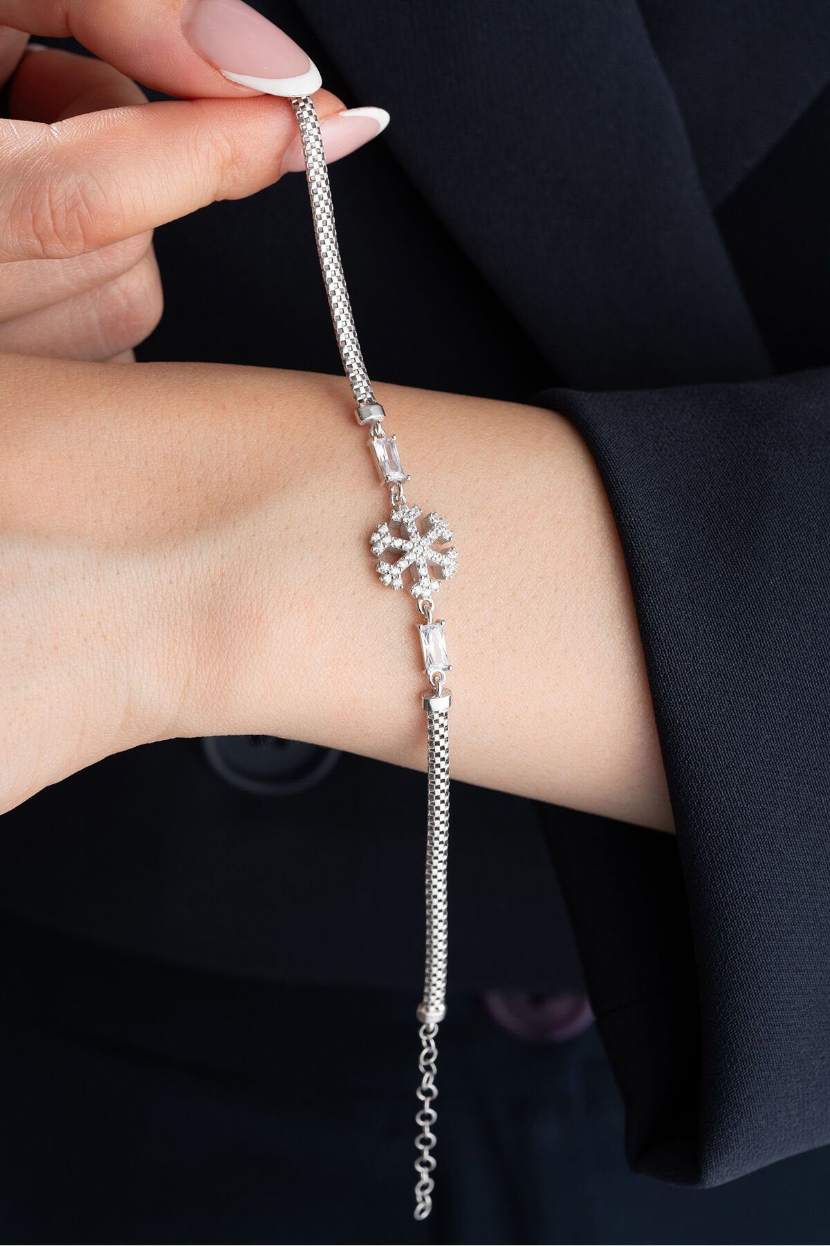 - 925 ayar gümüş malzeme ile üretilmiş, uzun ömürlü ve kaliteli bir aksesuar deneyimi sunar; - Göz alıcı zirkon taşlarla süslenmiş, her türlü özel gününüzde şıklığınızı tamamlar; - Zarif tasarımıyla dikkat çeken bu bileklik, modern ve klasik tarzları harmanlayarak her kıyafetle uyum sağlar;