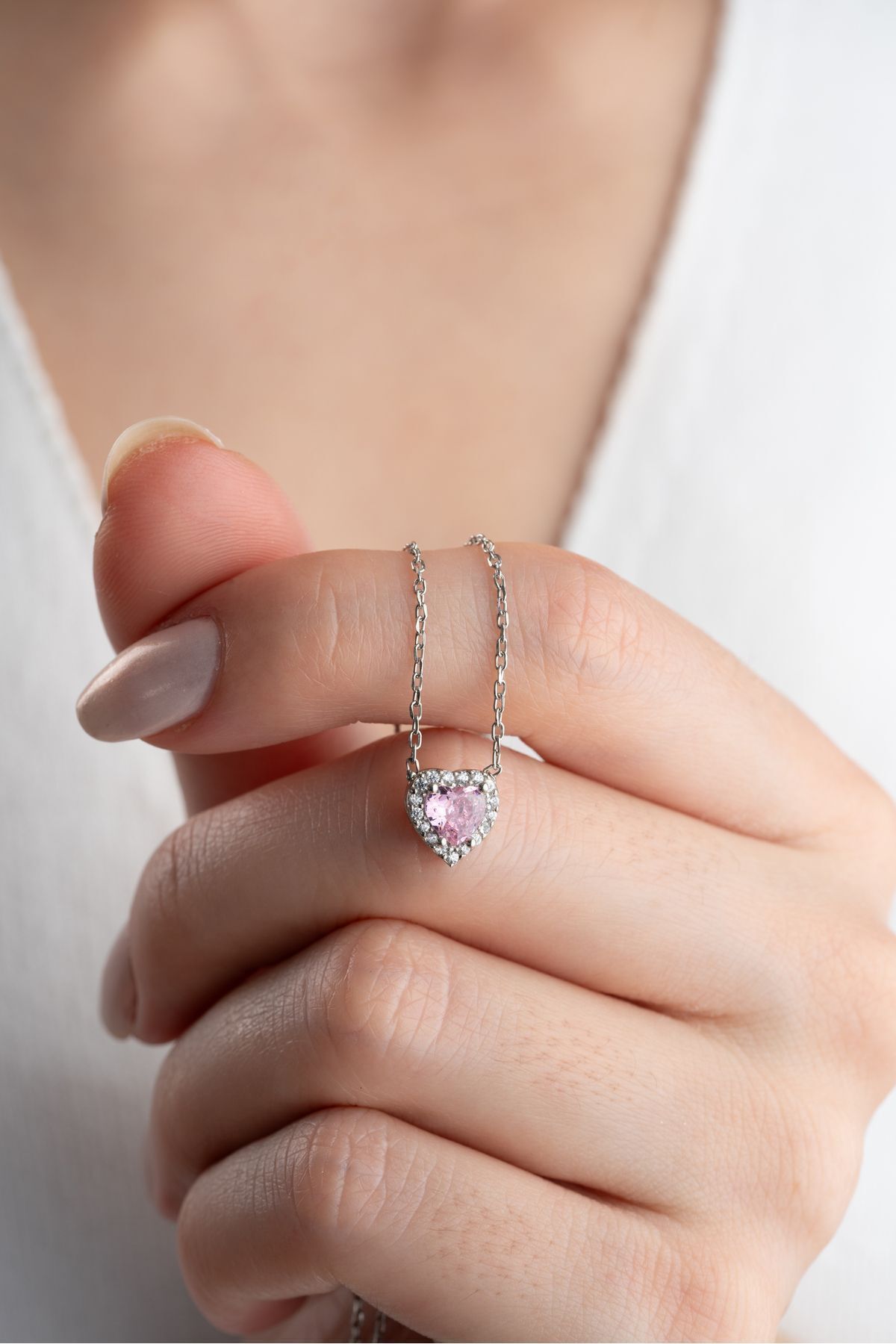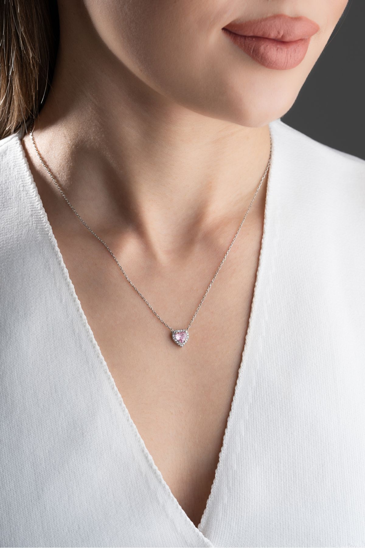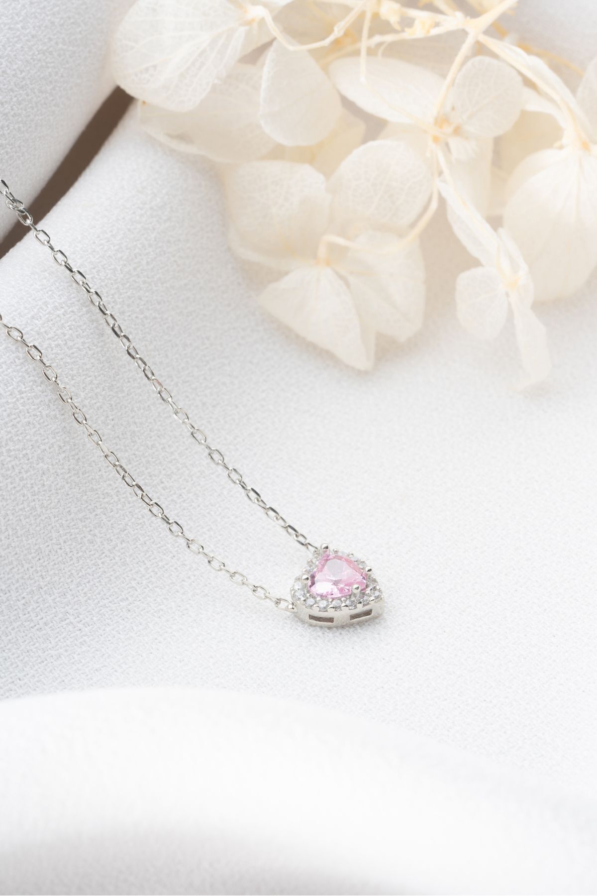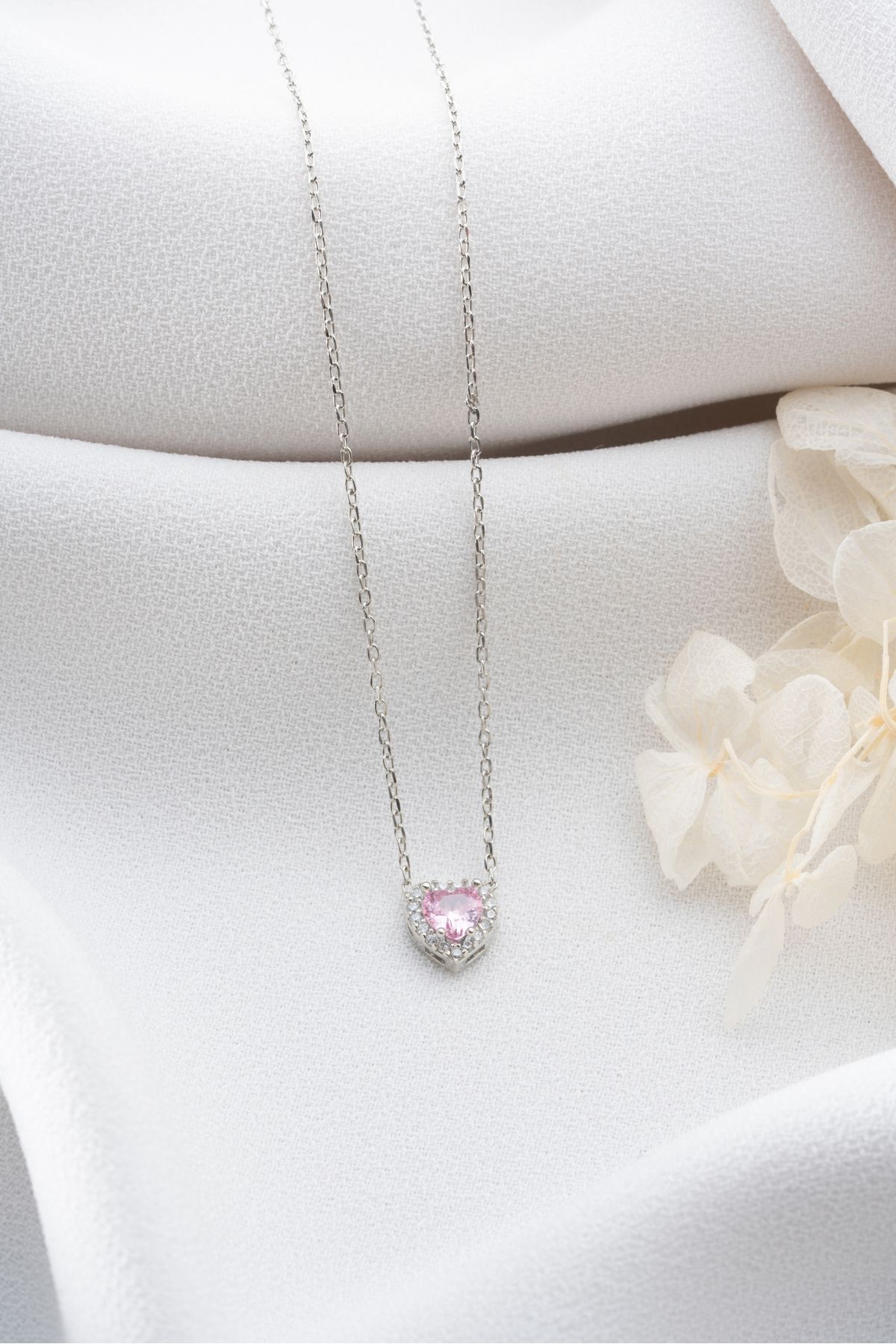 925 Ayar Gümüş Zirkon Taşlı Pembe Kalp Kolye