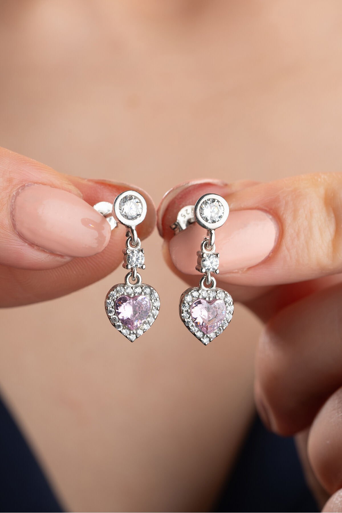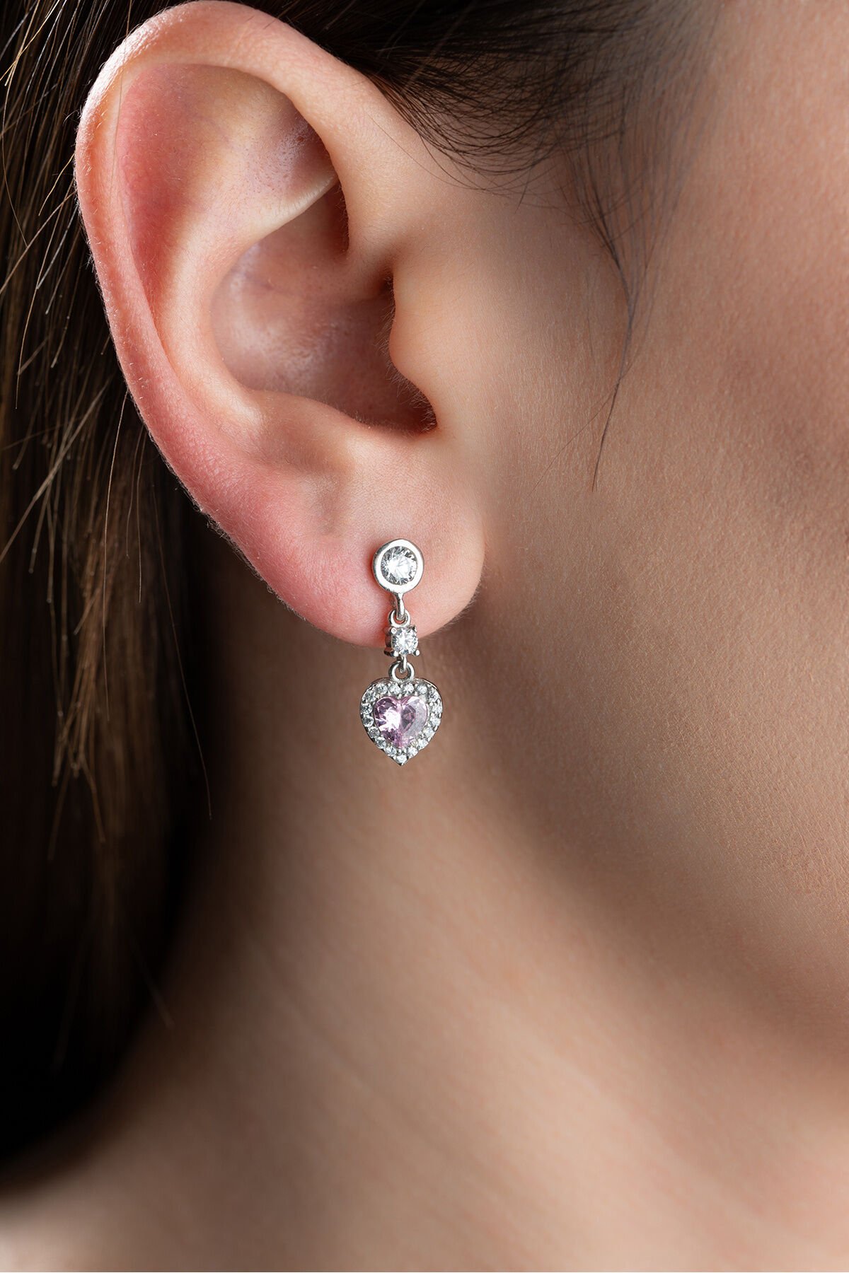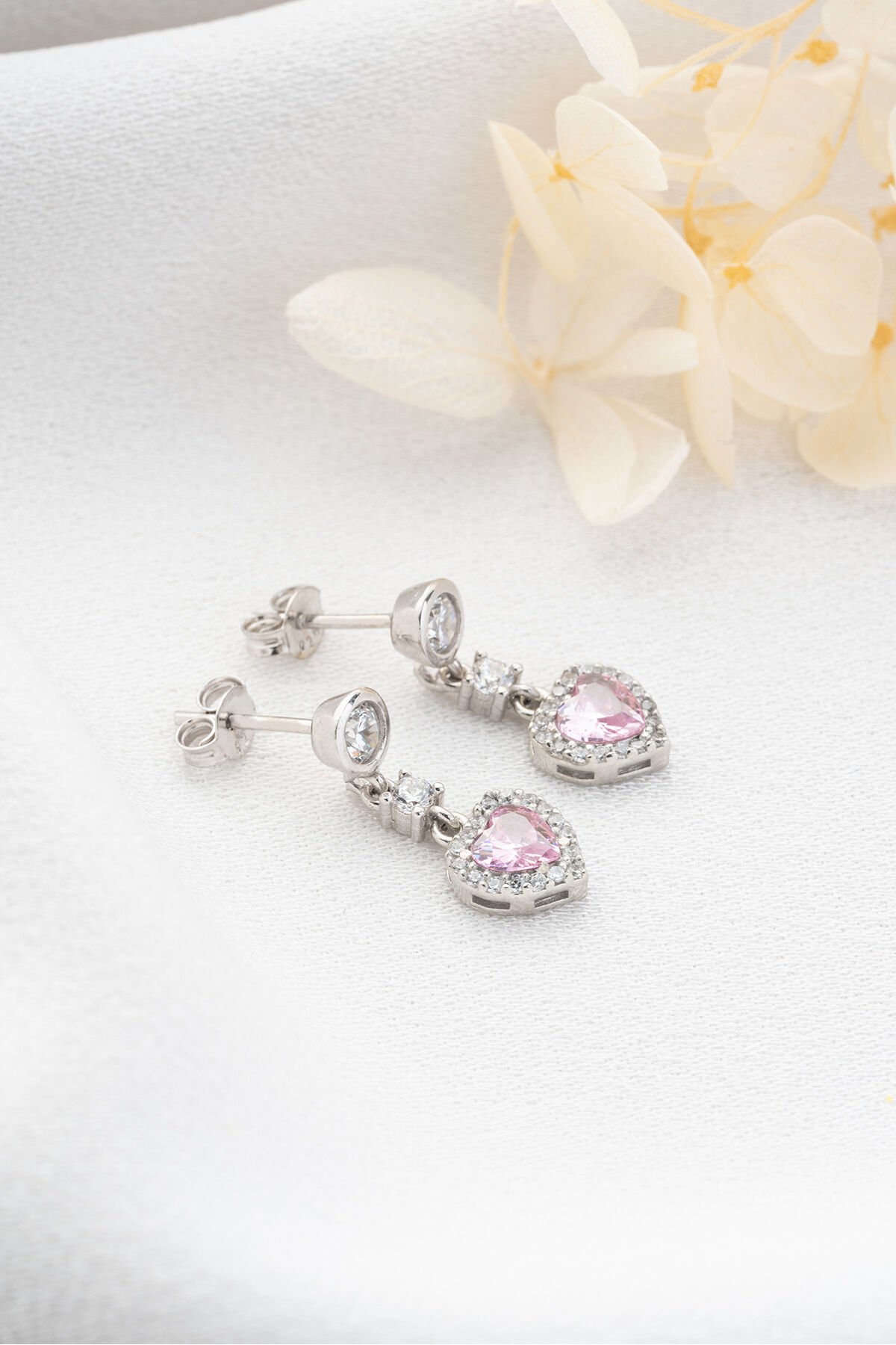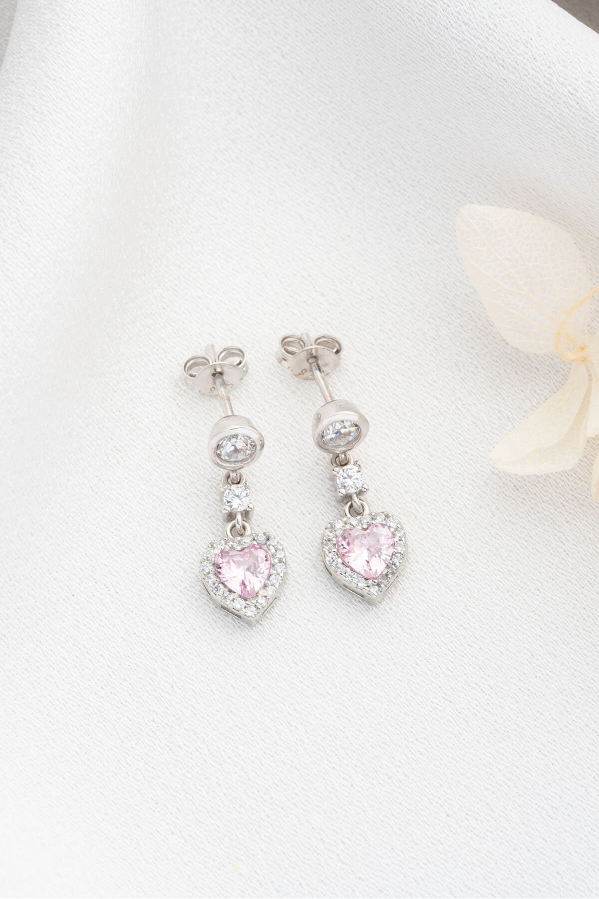 925 Ayar Gümüş Zirkon Taşlı Pembe Kalp Küpe
