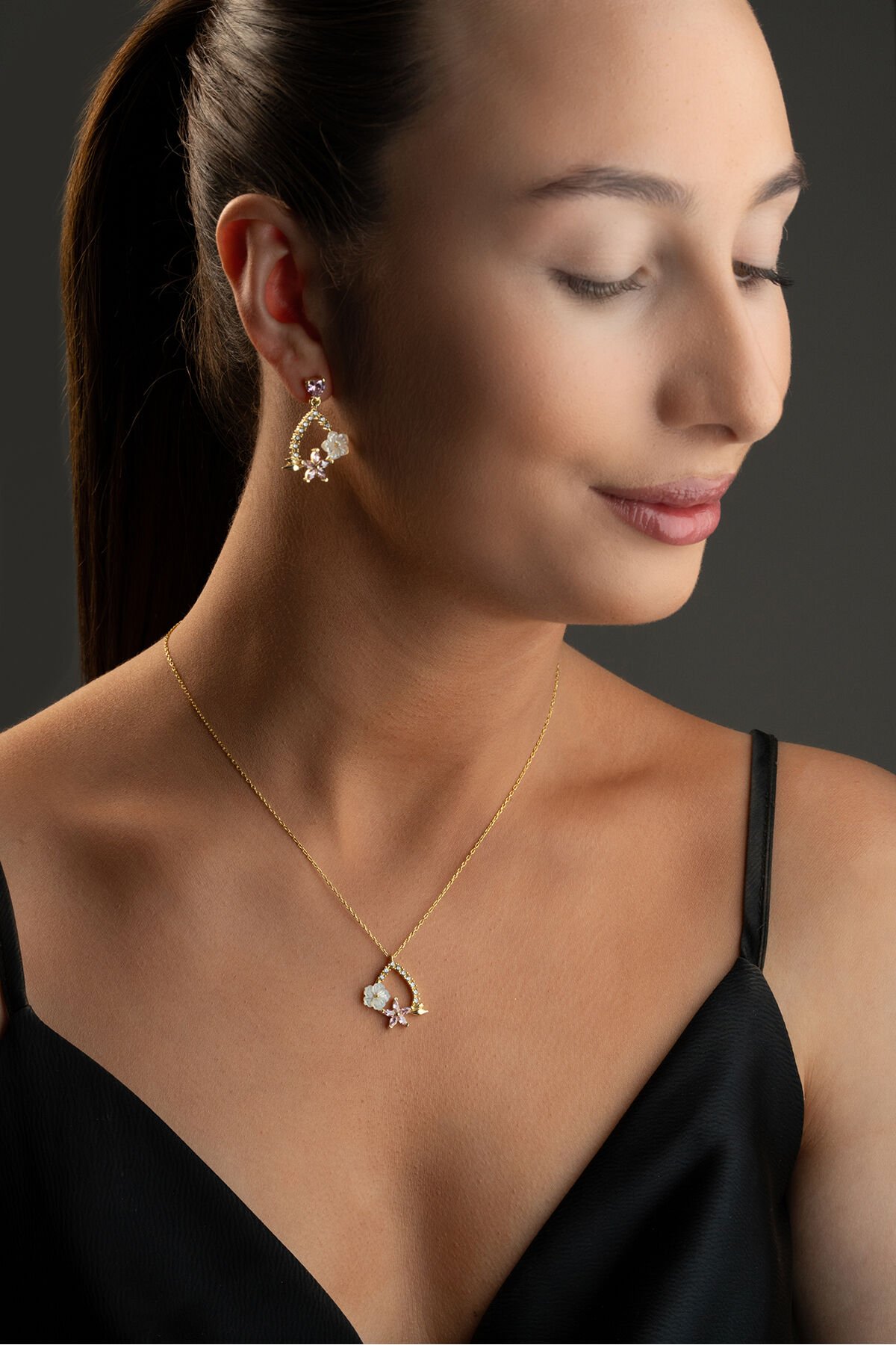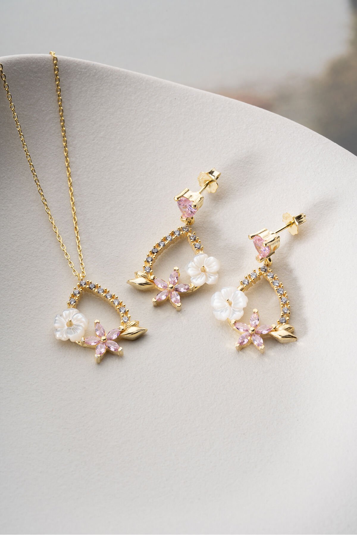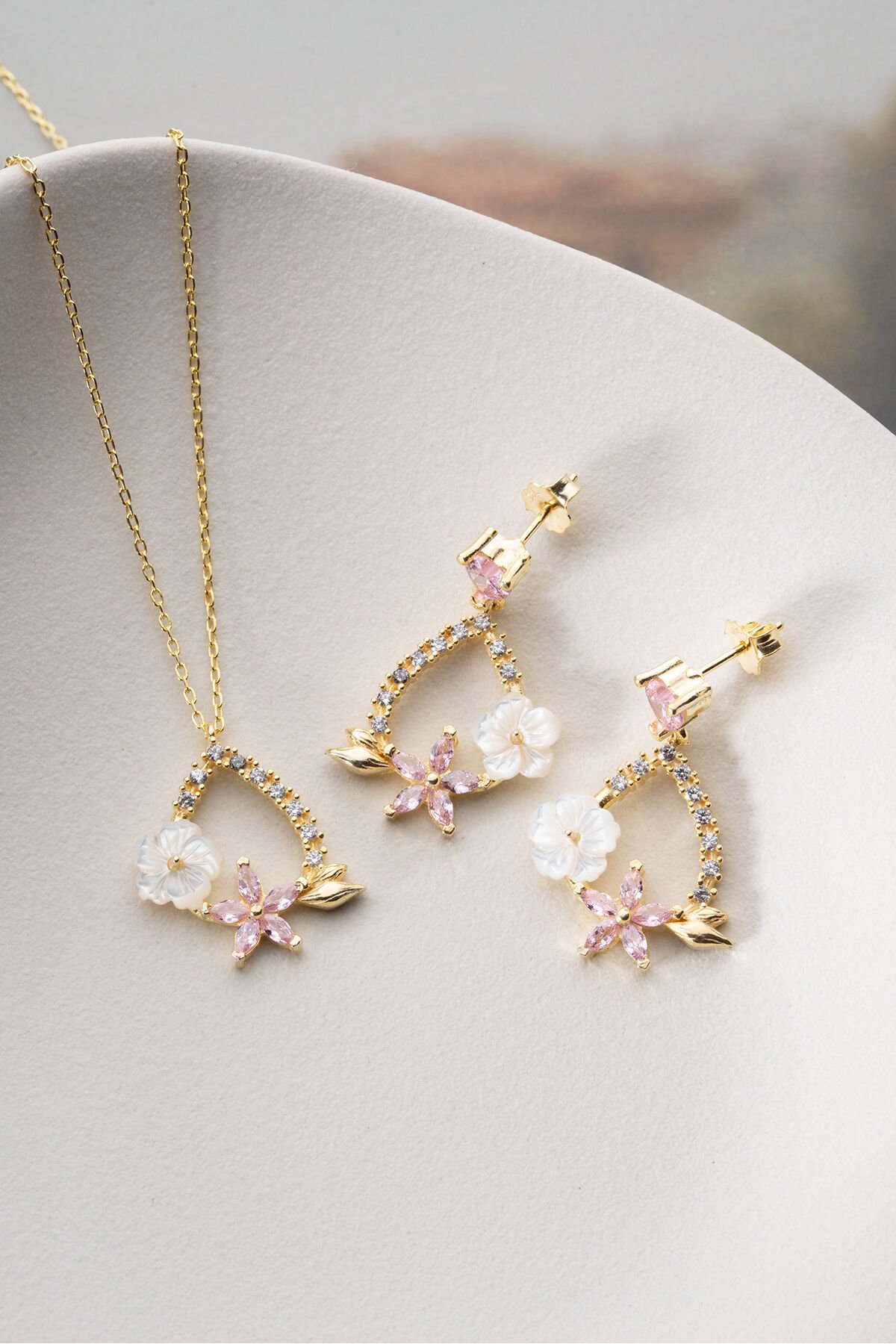 925 Ayar Gümüş Zirkon Taşlı Sedefli Damla (Kolye-Küpe) Set