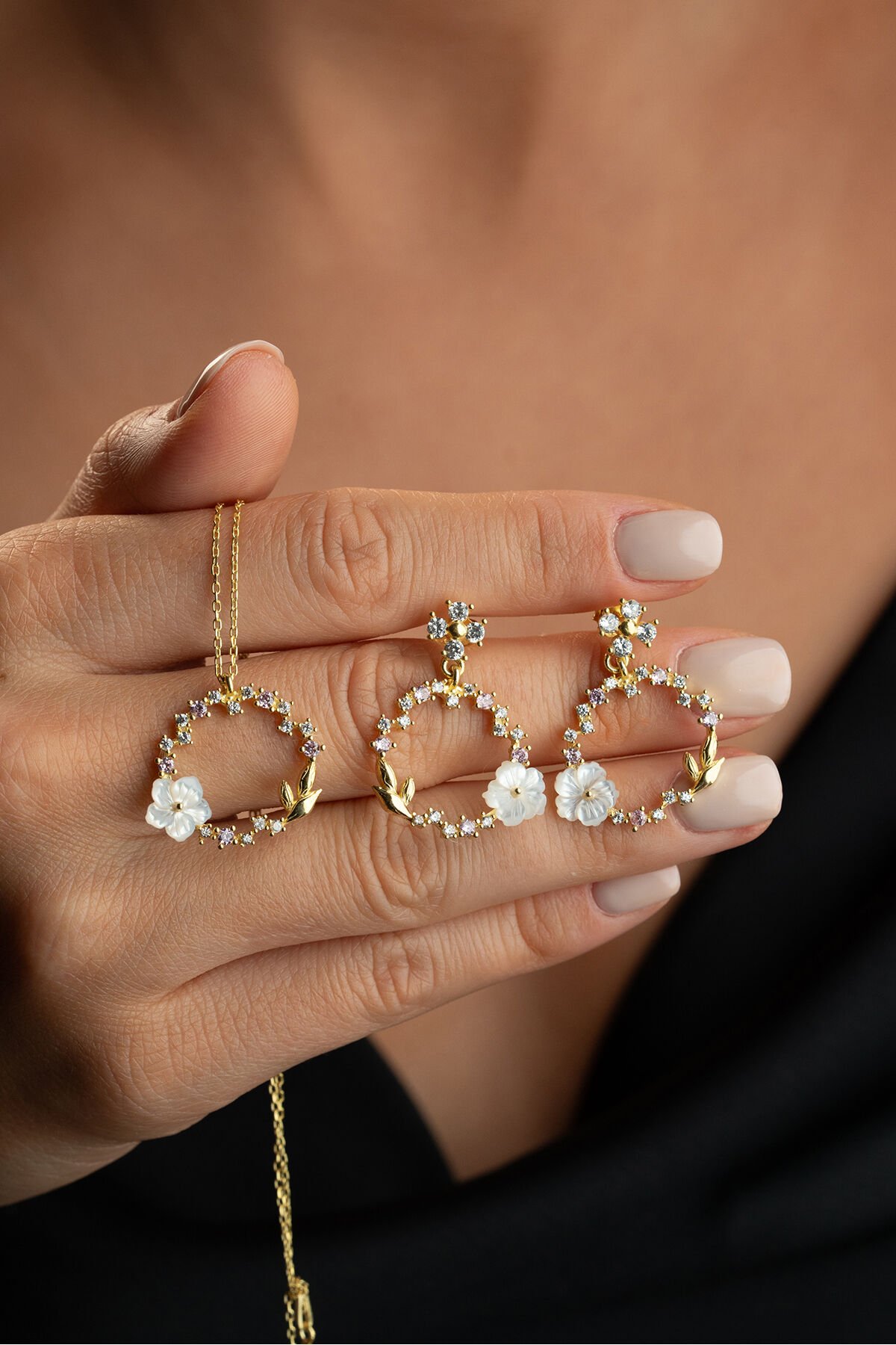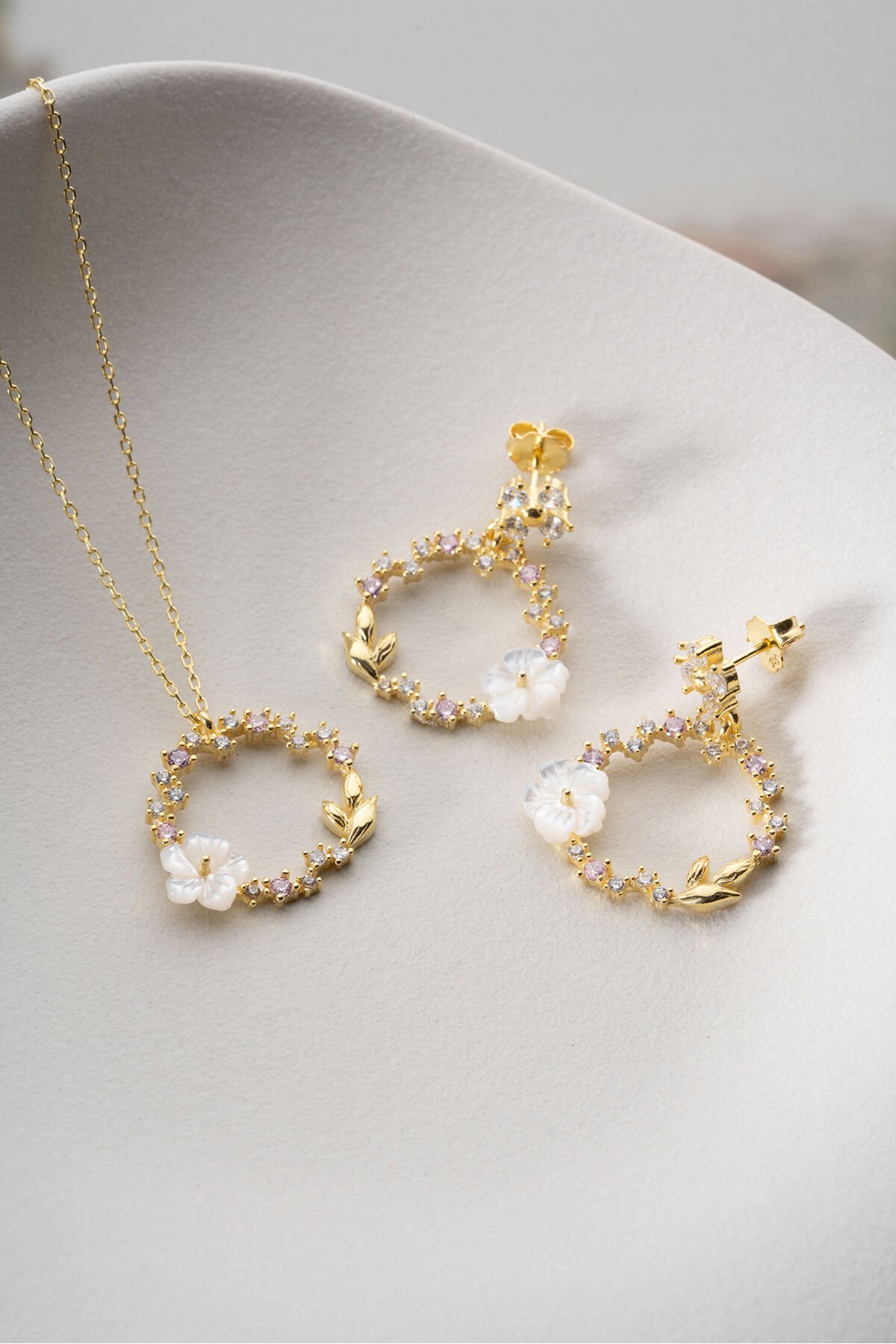925 Ayar Gümüş Zirkon Taşlı Sedefli (Kolye-Küpe) Set