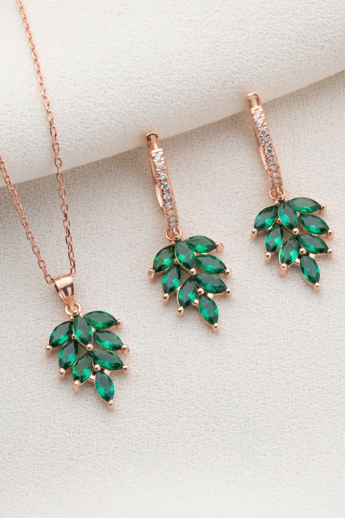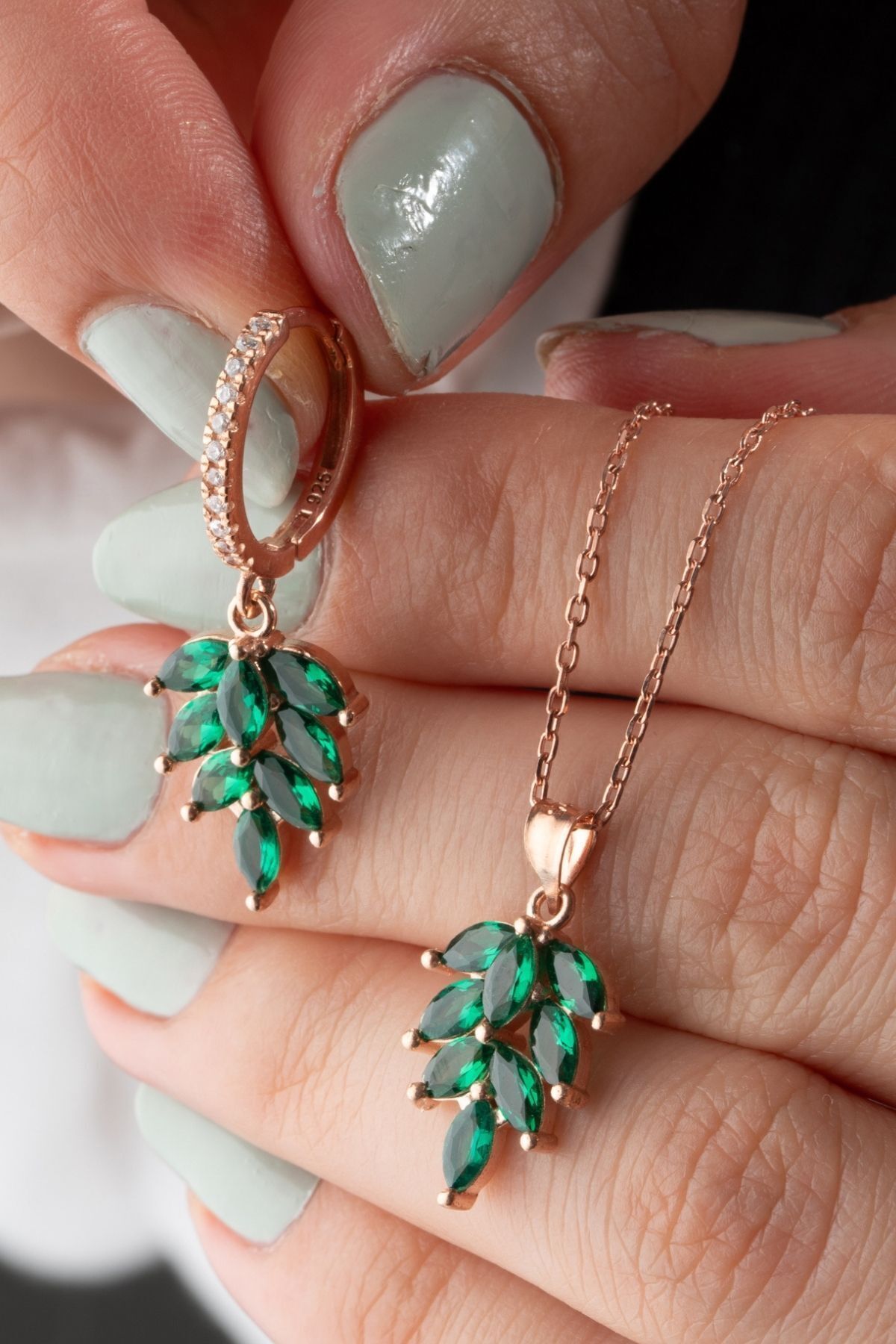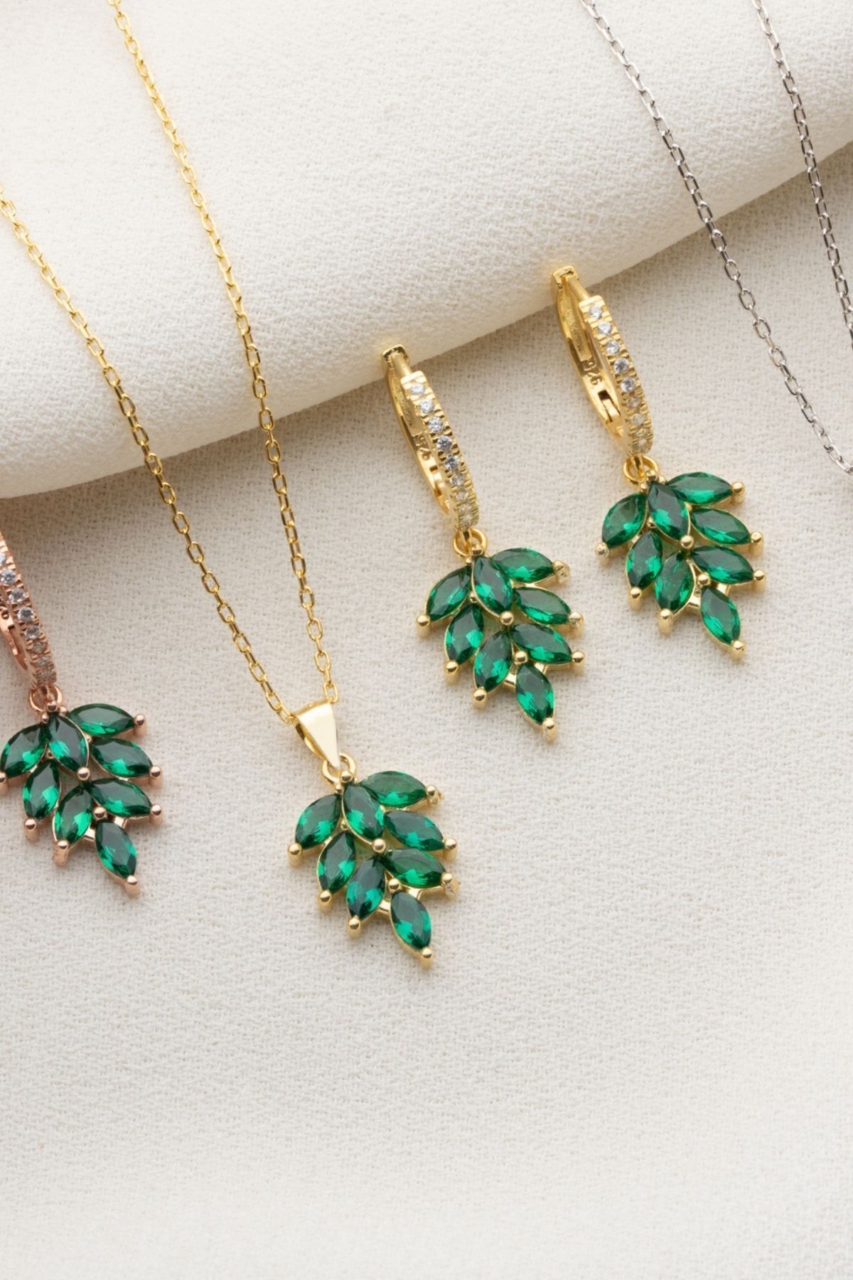 925 ayar gümüş malzeme ile üretilmiş, uzun ömürlü ve kaliteli bir takı deneyimi sunar; Göz alıcı zümrüt yeşili zirkon taşlarla süslenmiş, şıklığınızı tamamlayacak zarif bir tasarıma sahiptir; Hem kolye hem de küpe olmak üzere iki parçadan oluşan set, uyumlu ve estetik bir görünüm sağlar; Gold materyal bileşeni sayesinde parlak ve canlı bir görünüm kazandırarak her türlü kıyafetle kolayca uyum sağlar;