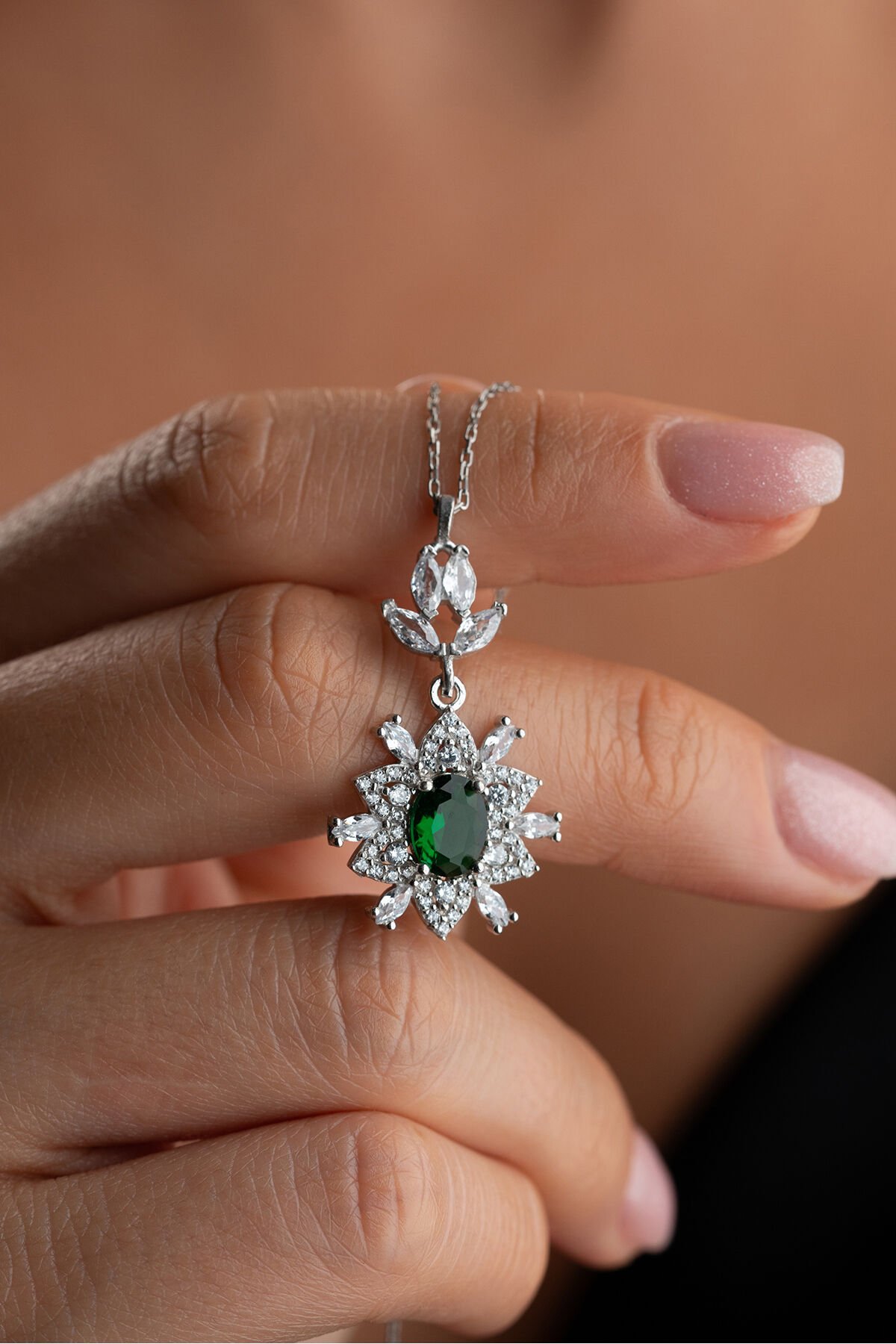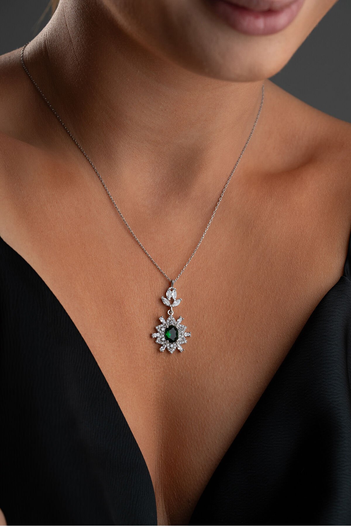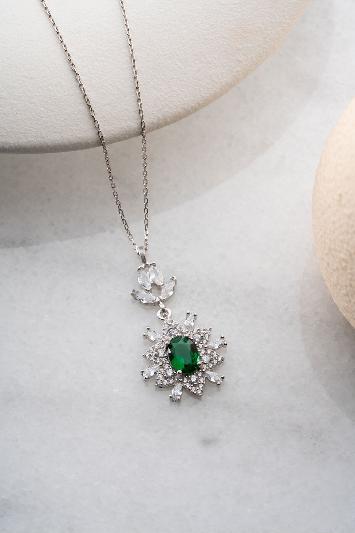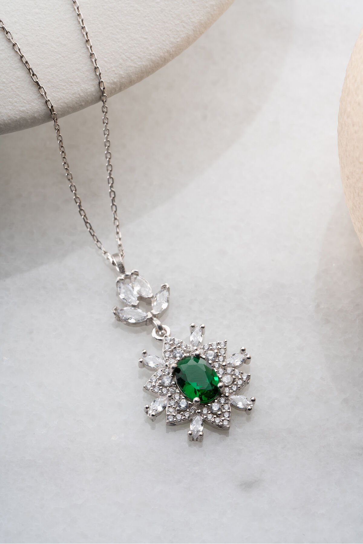 925 Ayar Gümüş Zümrüt Yeşili Taşlı Trend Model Kolye