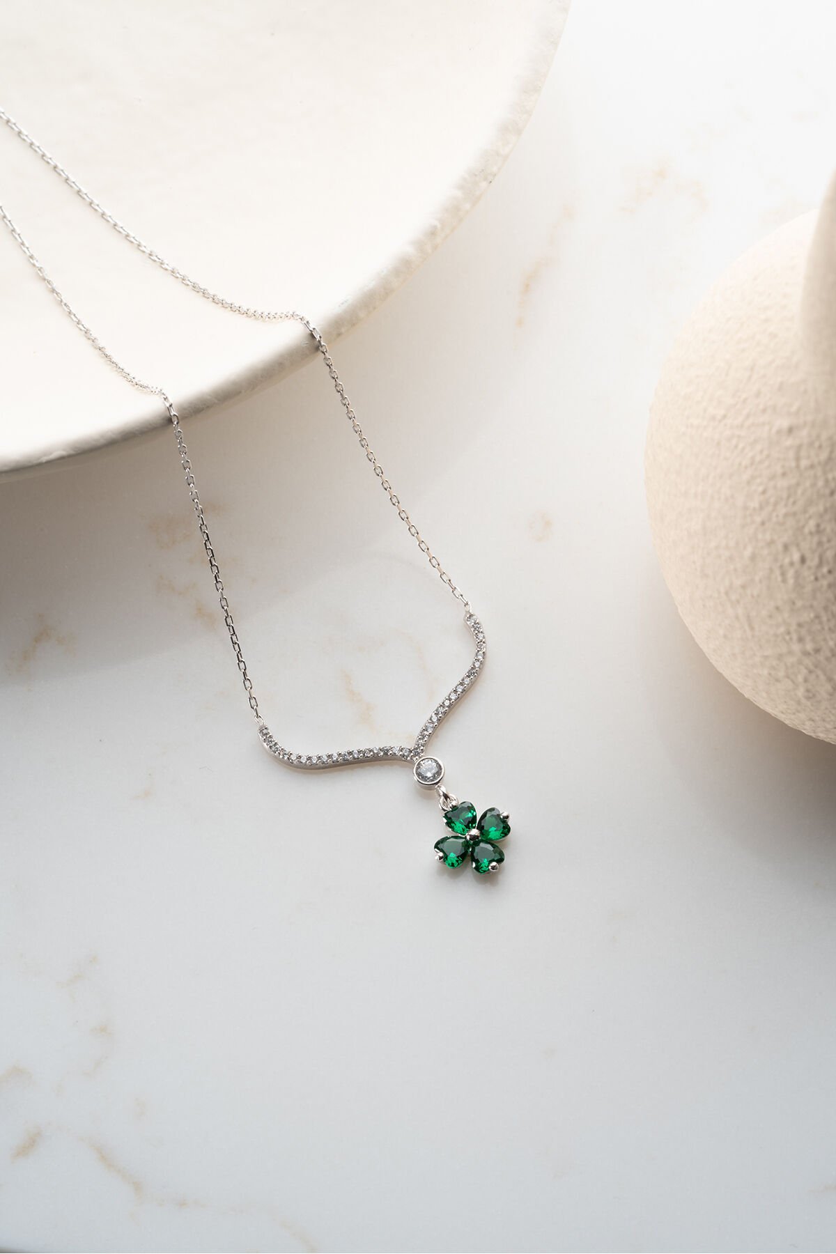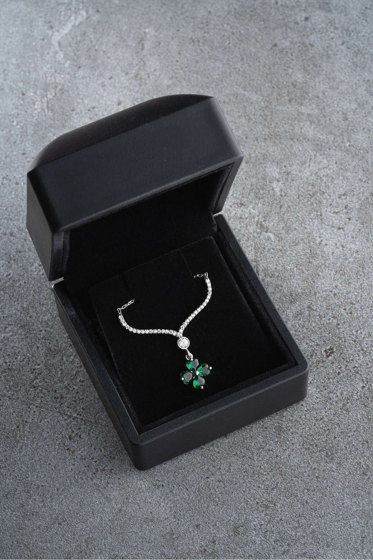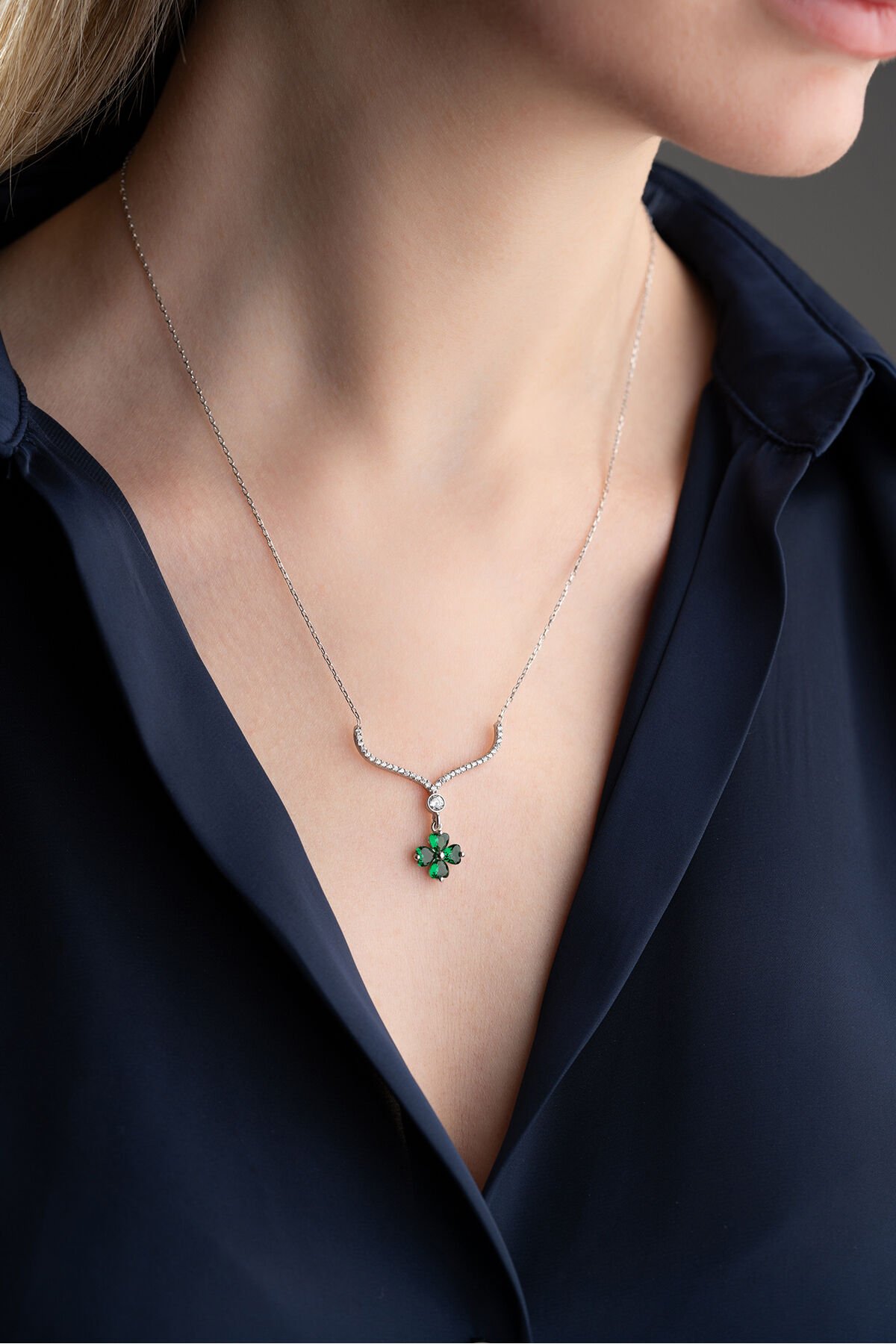 925 Ayar Işıklı Kutuda Yeşil Taşlı Yonca Kolye