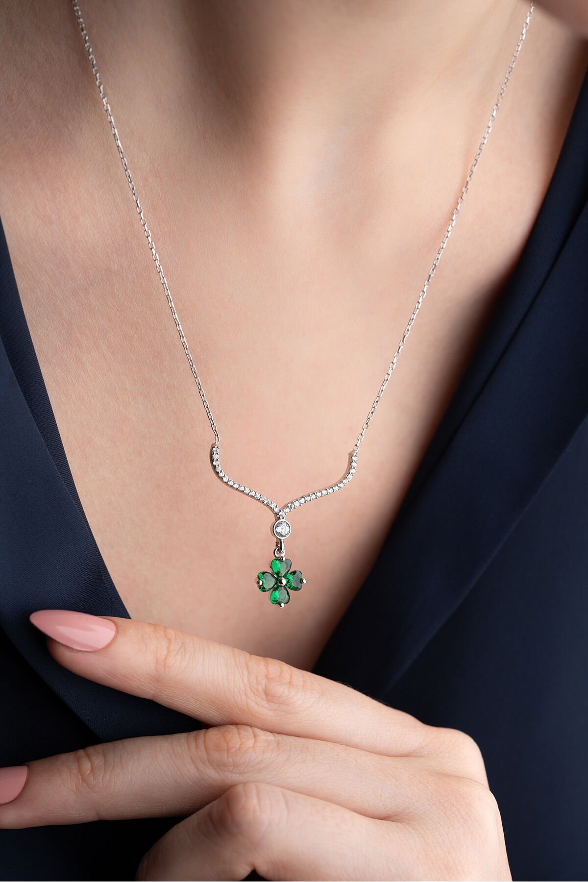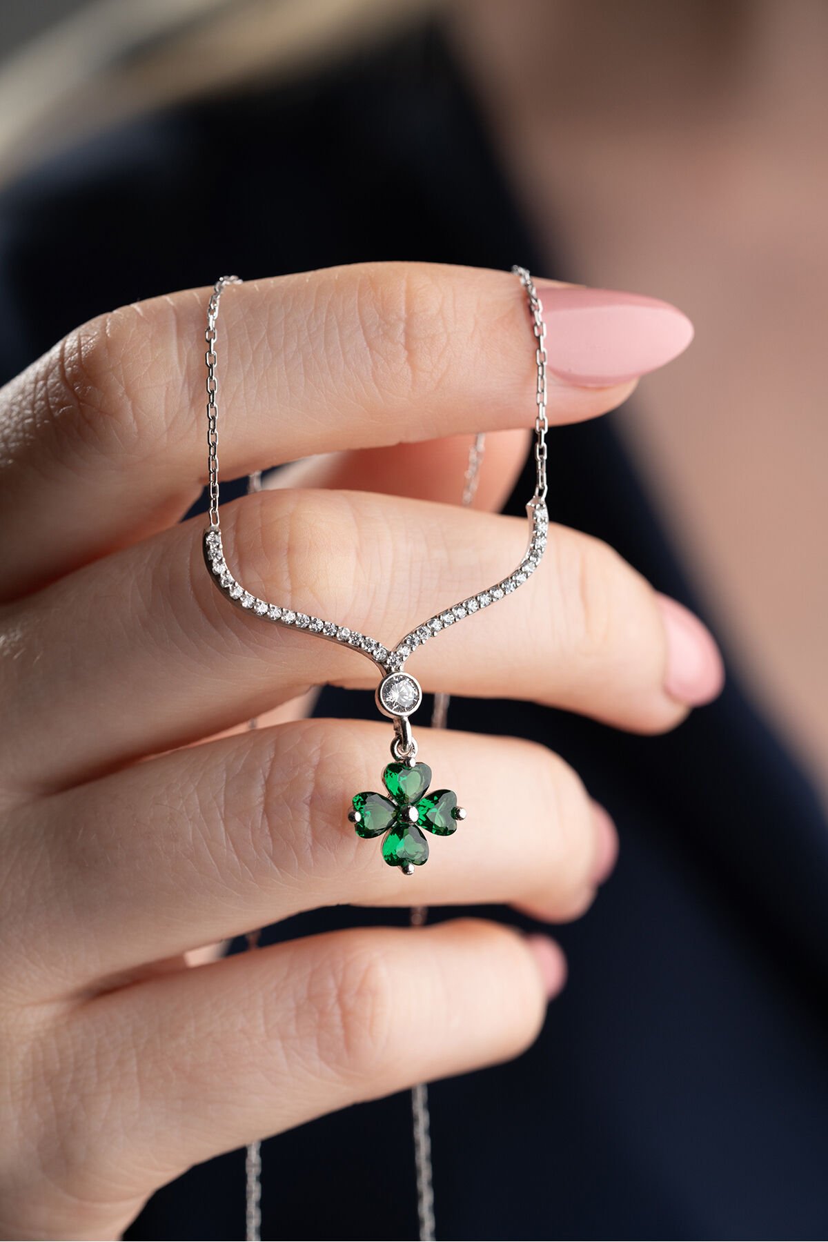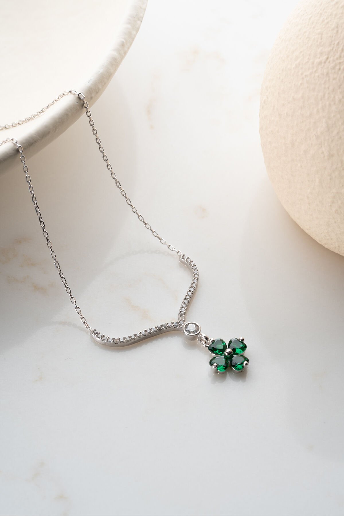 925 Ayar Işıklı Kutuda Yeşil Taşlı Yonca Kolye